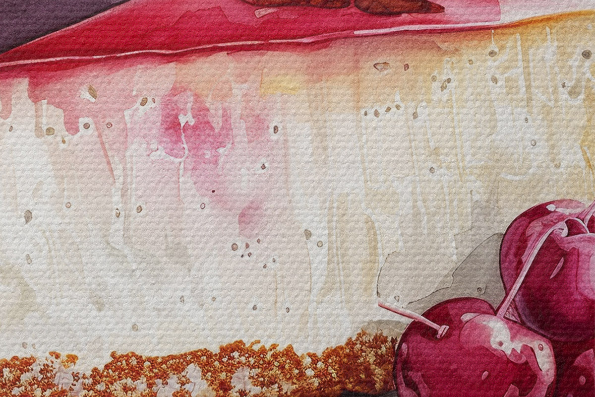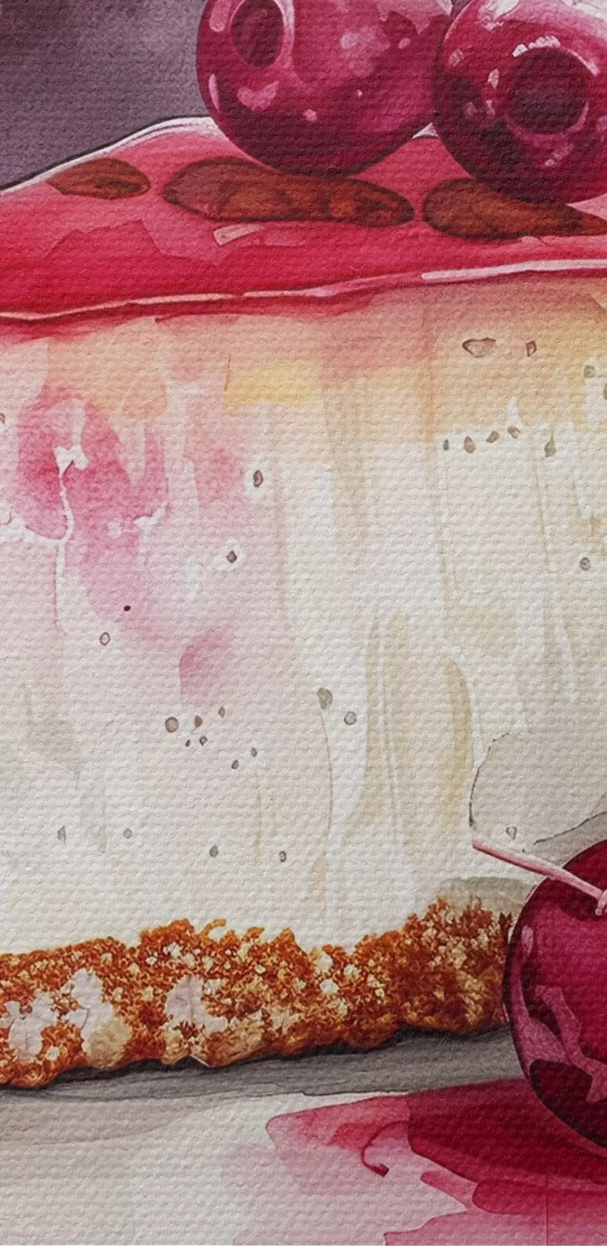Attēls Akvareļu siera kūka ar ķiršiem, elegantu ēdienu mākslu, sarkanā un purpursarkanā krāsā Nr r39700