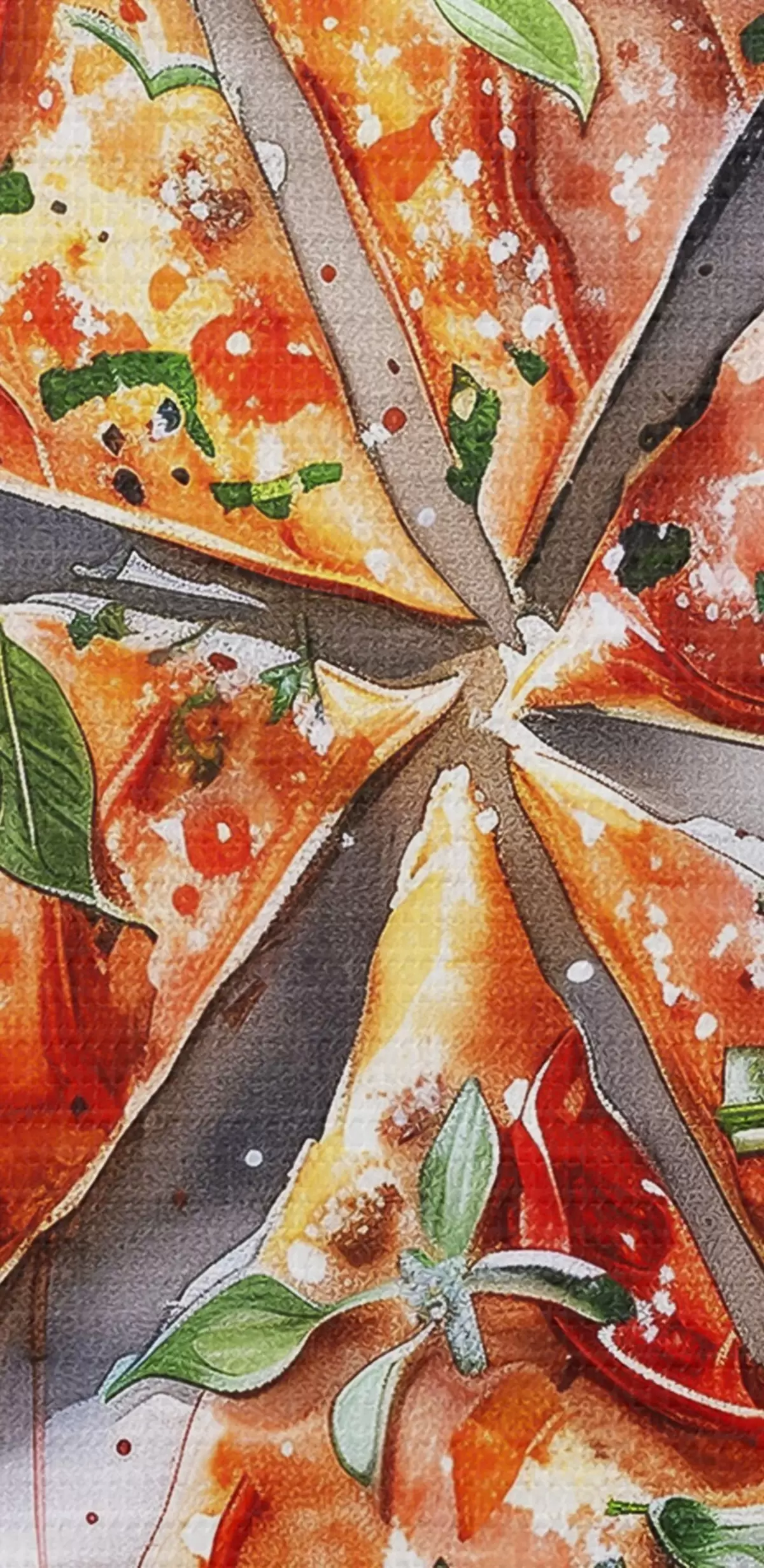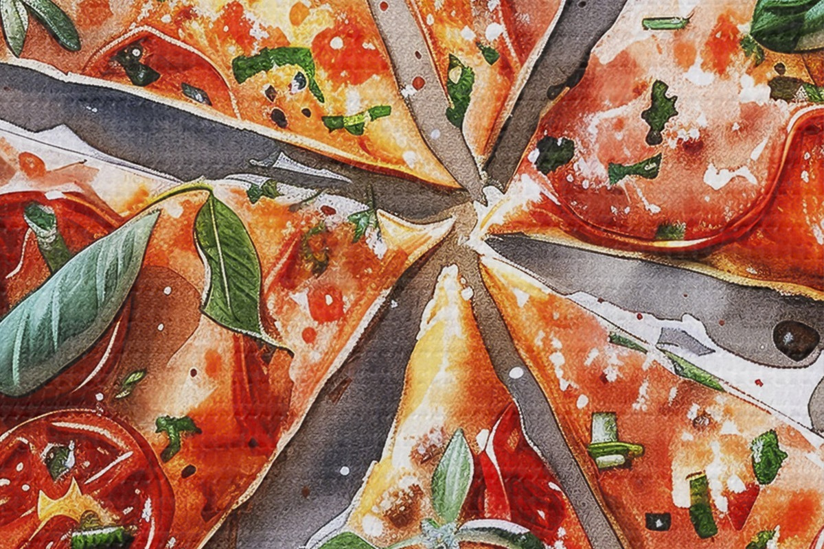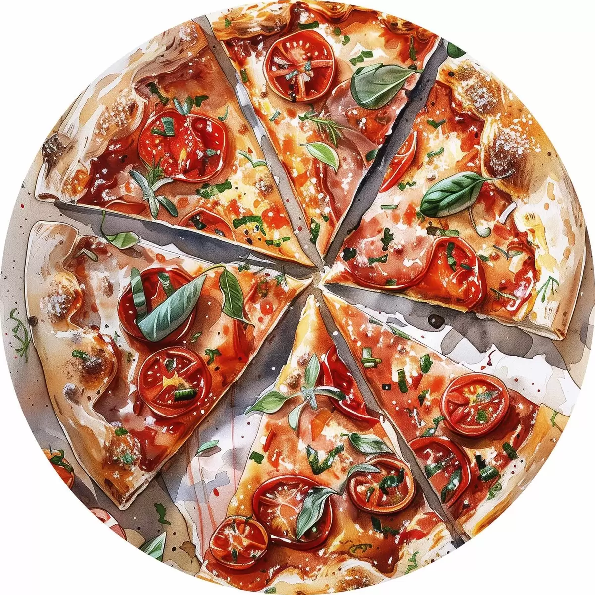 Attēls Akvareļu pica, garšīgi, tomāti un siers, pārtikas māksla, koka galds Nr r39704