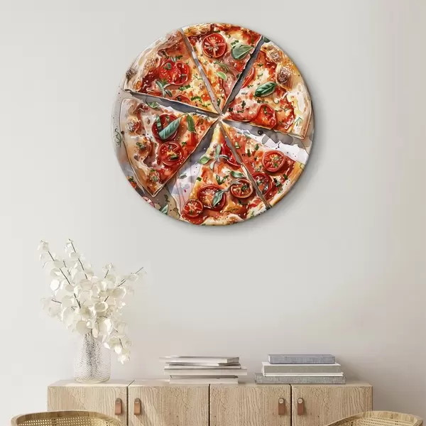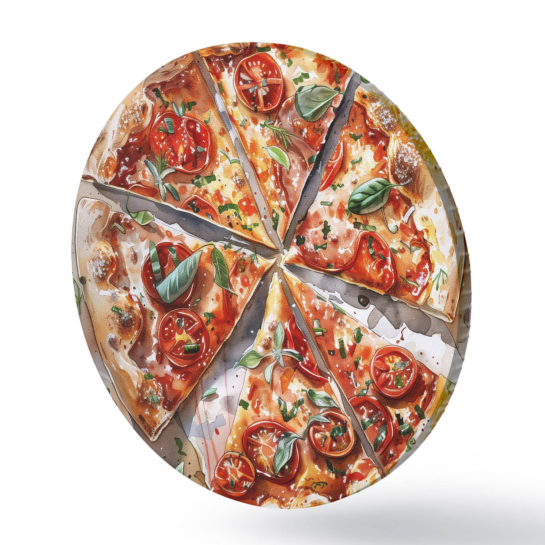 Apaļas gleznas Akvareļu pica, garšīgi, tomāti un siers, pārtikas māksla, koka galds r39704