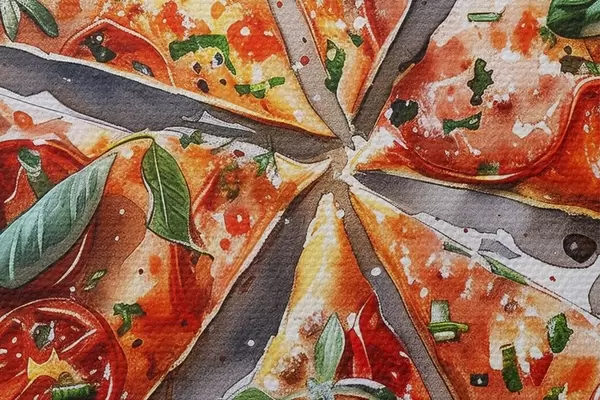 Attēls Akvareļu pica, garšīgi, tomāti un siers, pārtikas māksla, koka galds Nr r39704