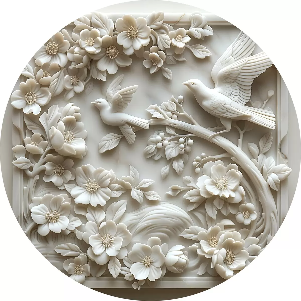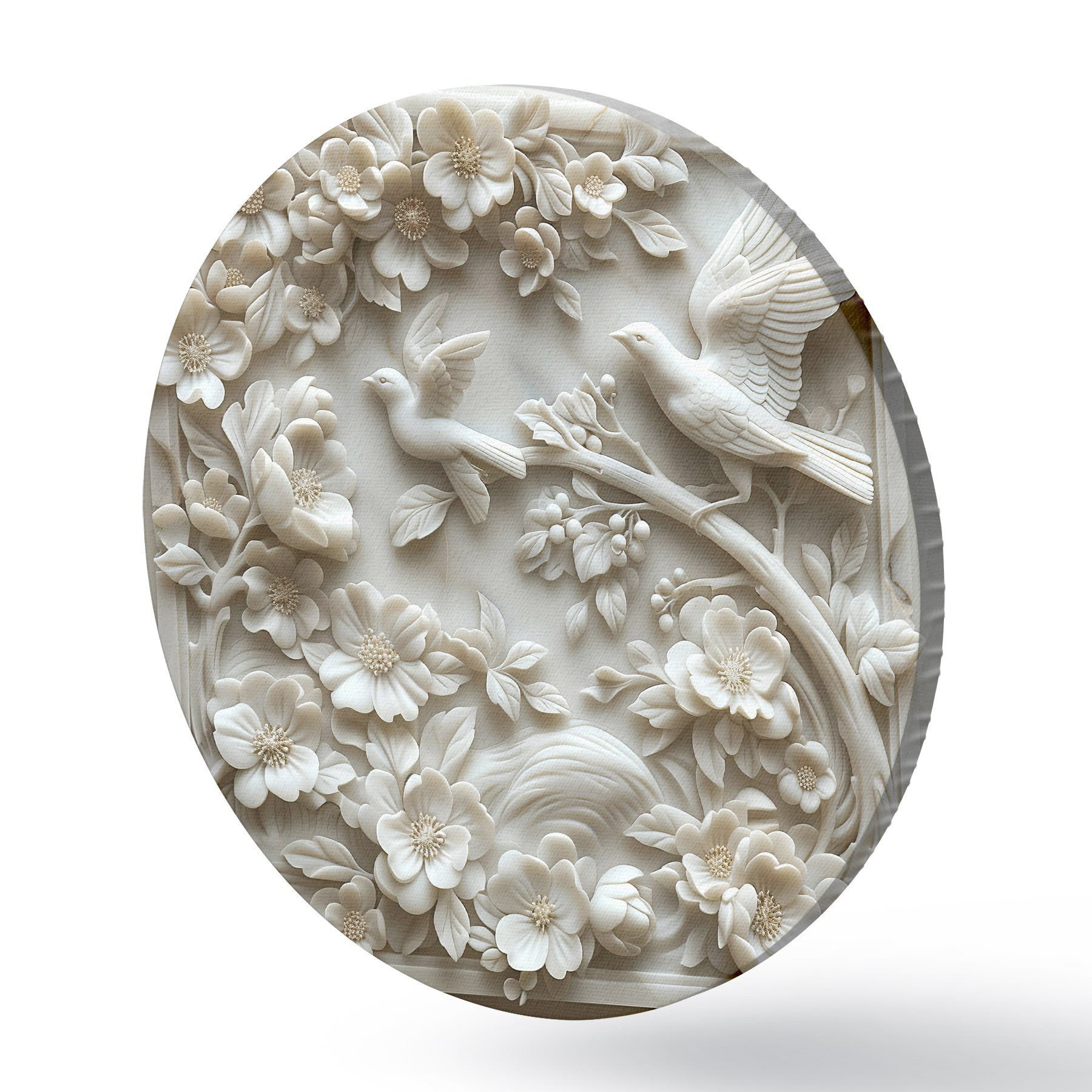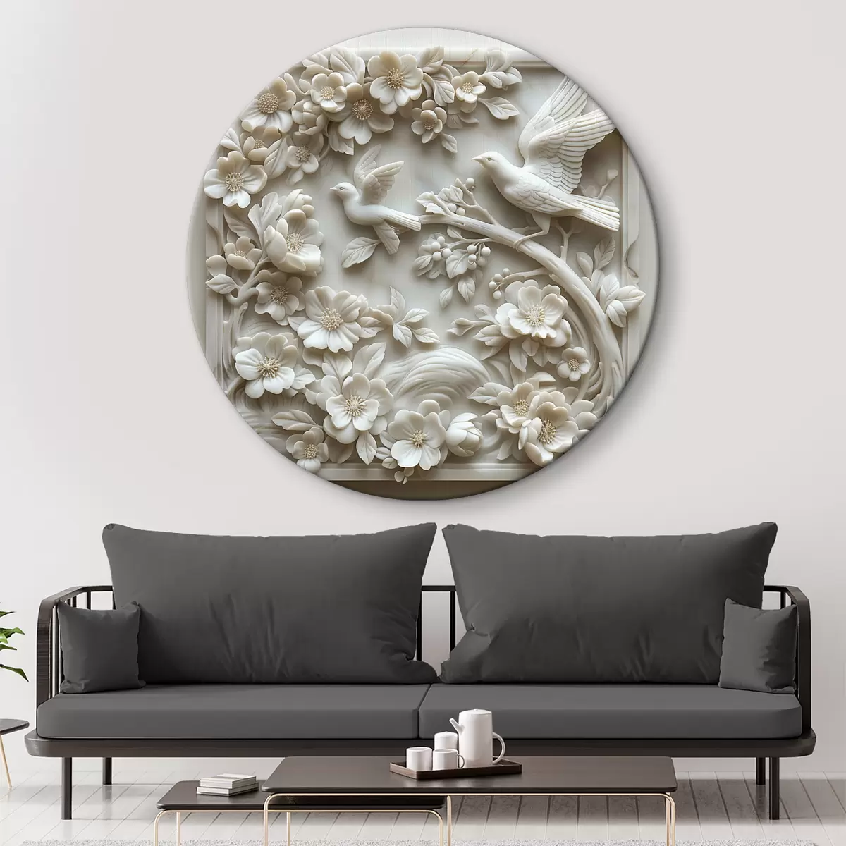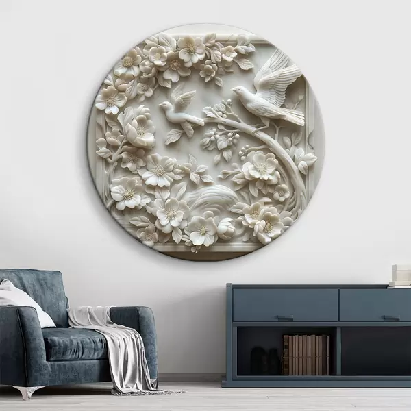 Apaļas gleznas Balta marmora dārzs ar putnu un ziedu bareljefu r39728