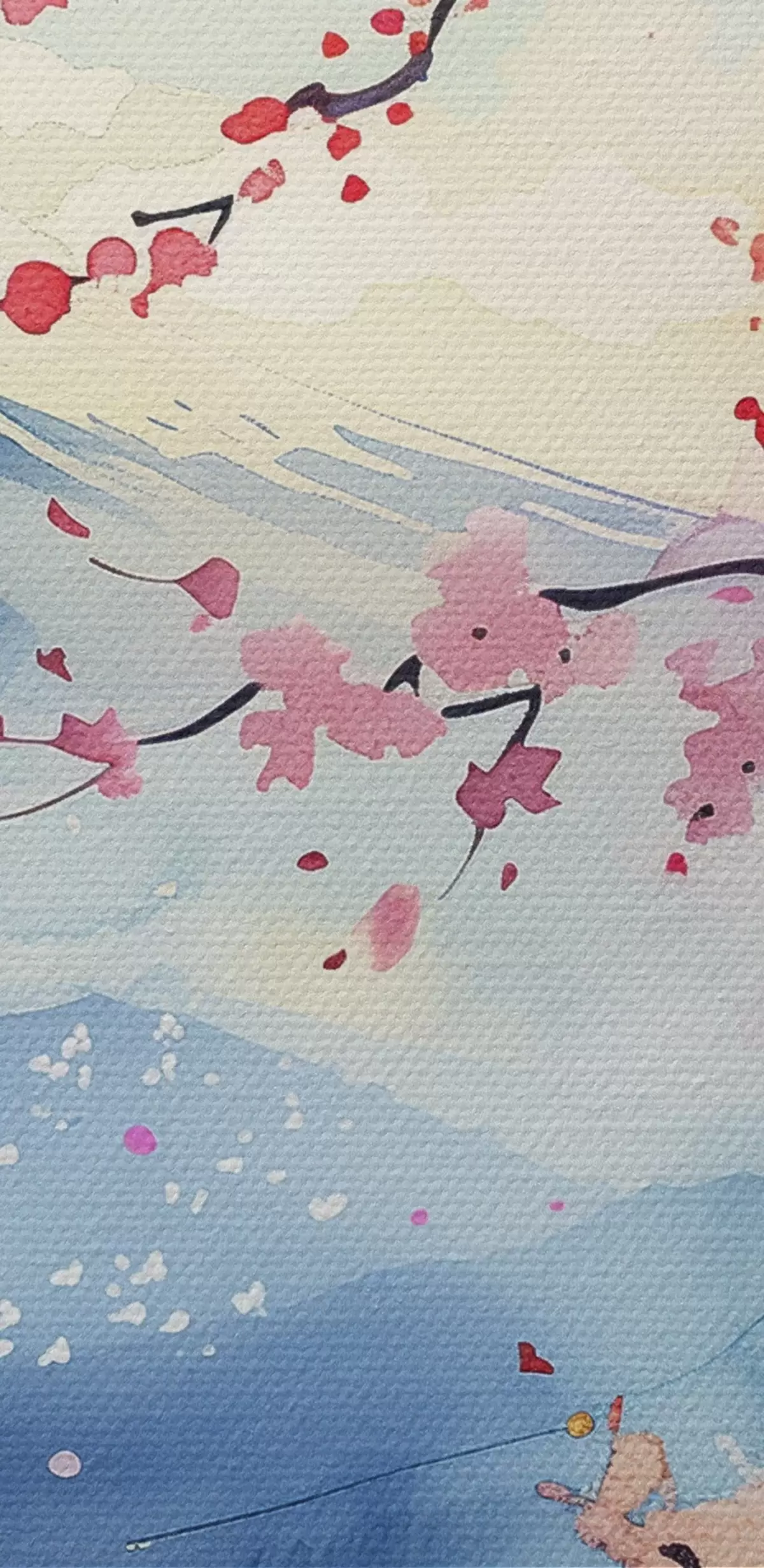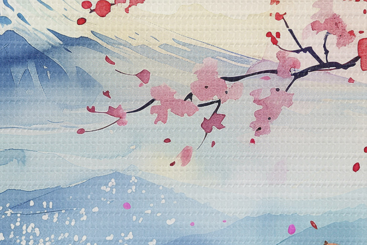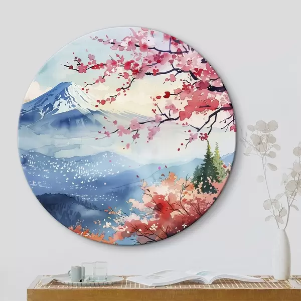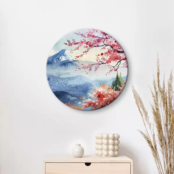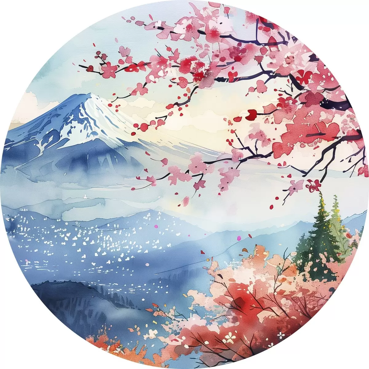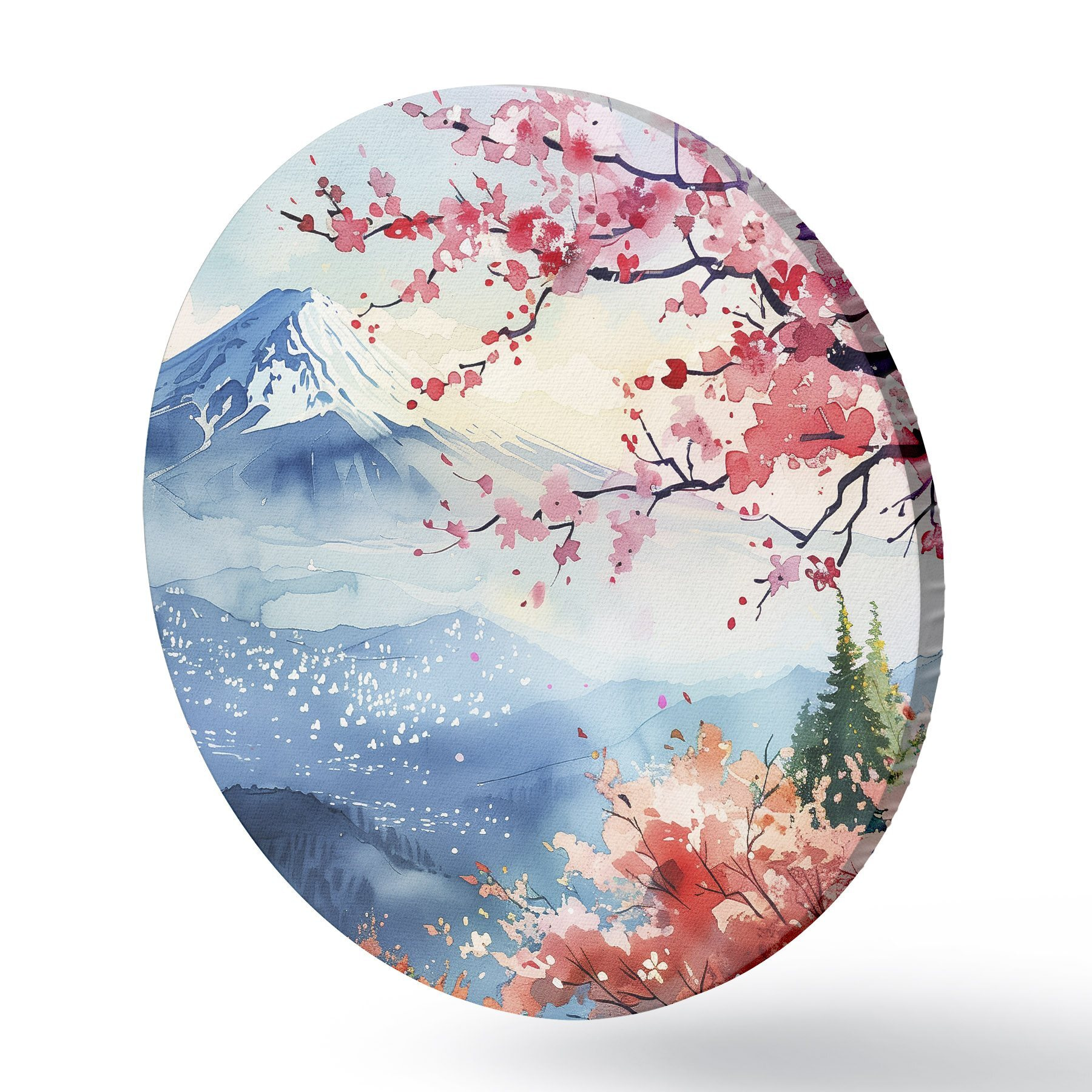 Apaļas gleznas Fudži kalnu ainava, austrumu daba, ķiršu koki, saulriets r39775