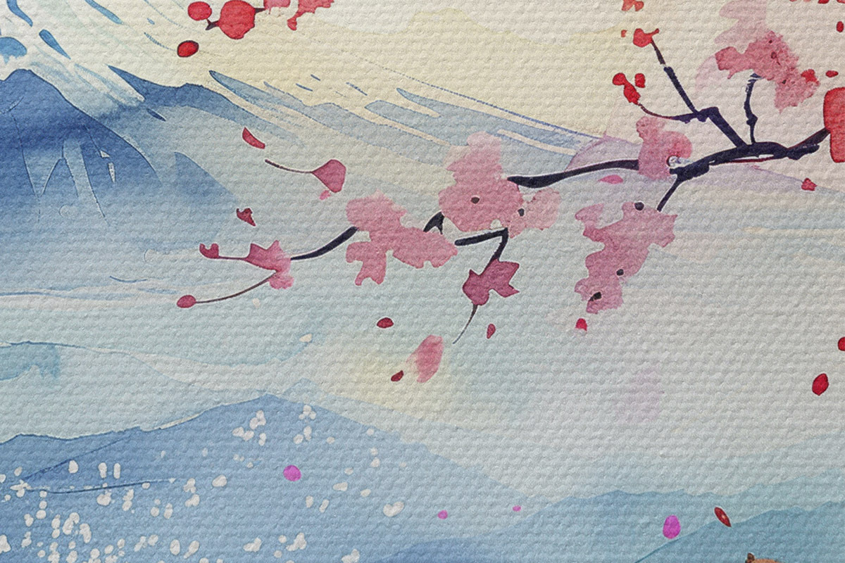 Attēls Fudži kalnu ainava, austrumu daba, ķiršu koki, saulriets Nr r39775