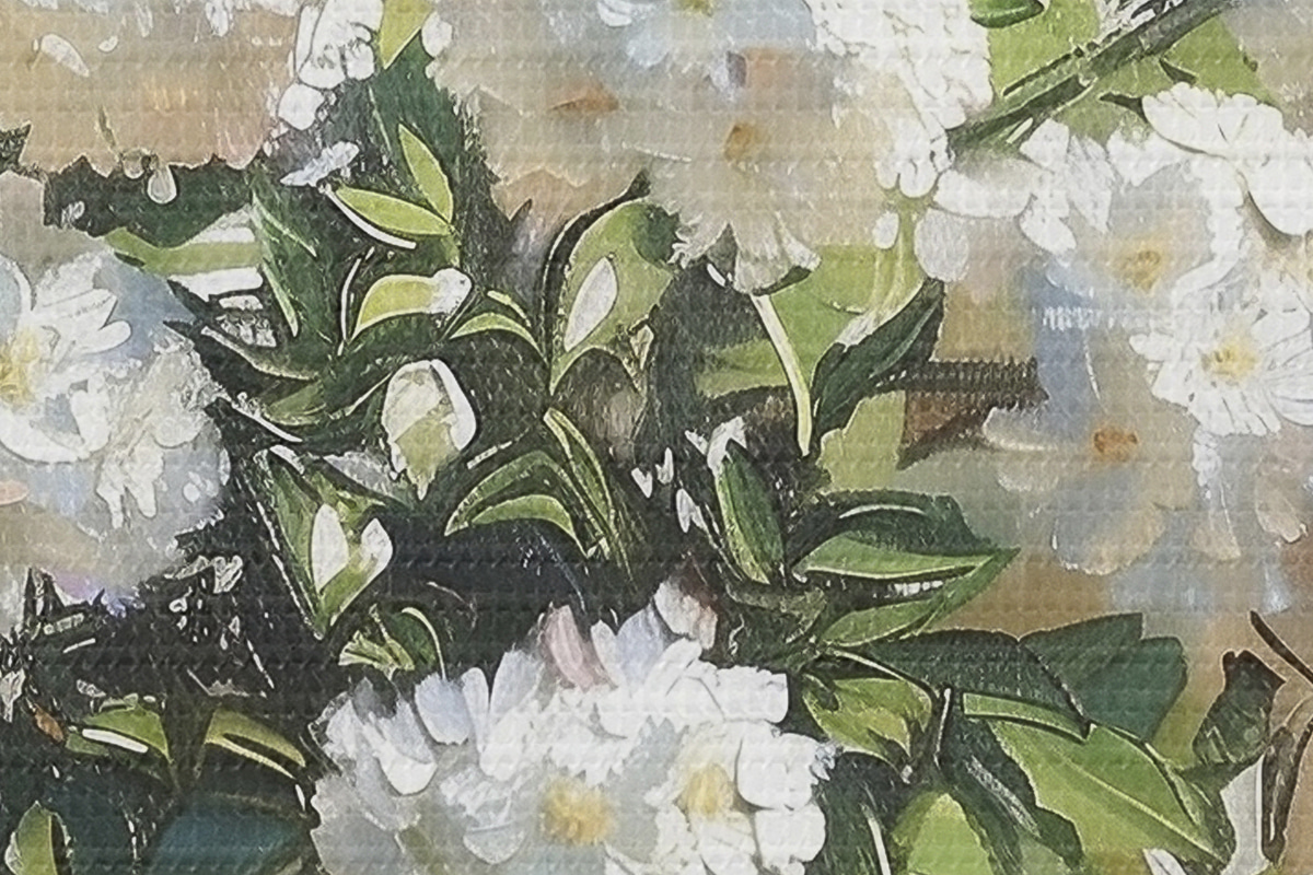 Smalkais diegu pinums uz šī audekla atgādina profesionālu mākslinieku audeklu virsmu.