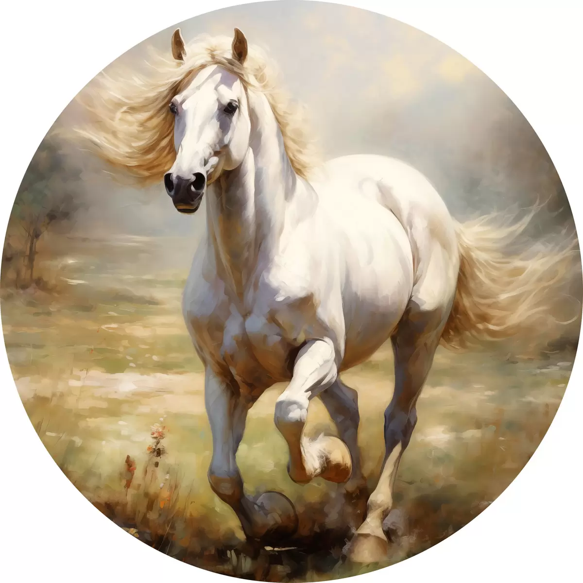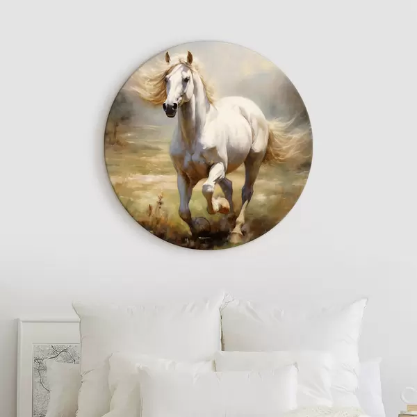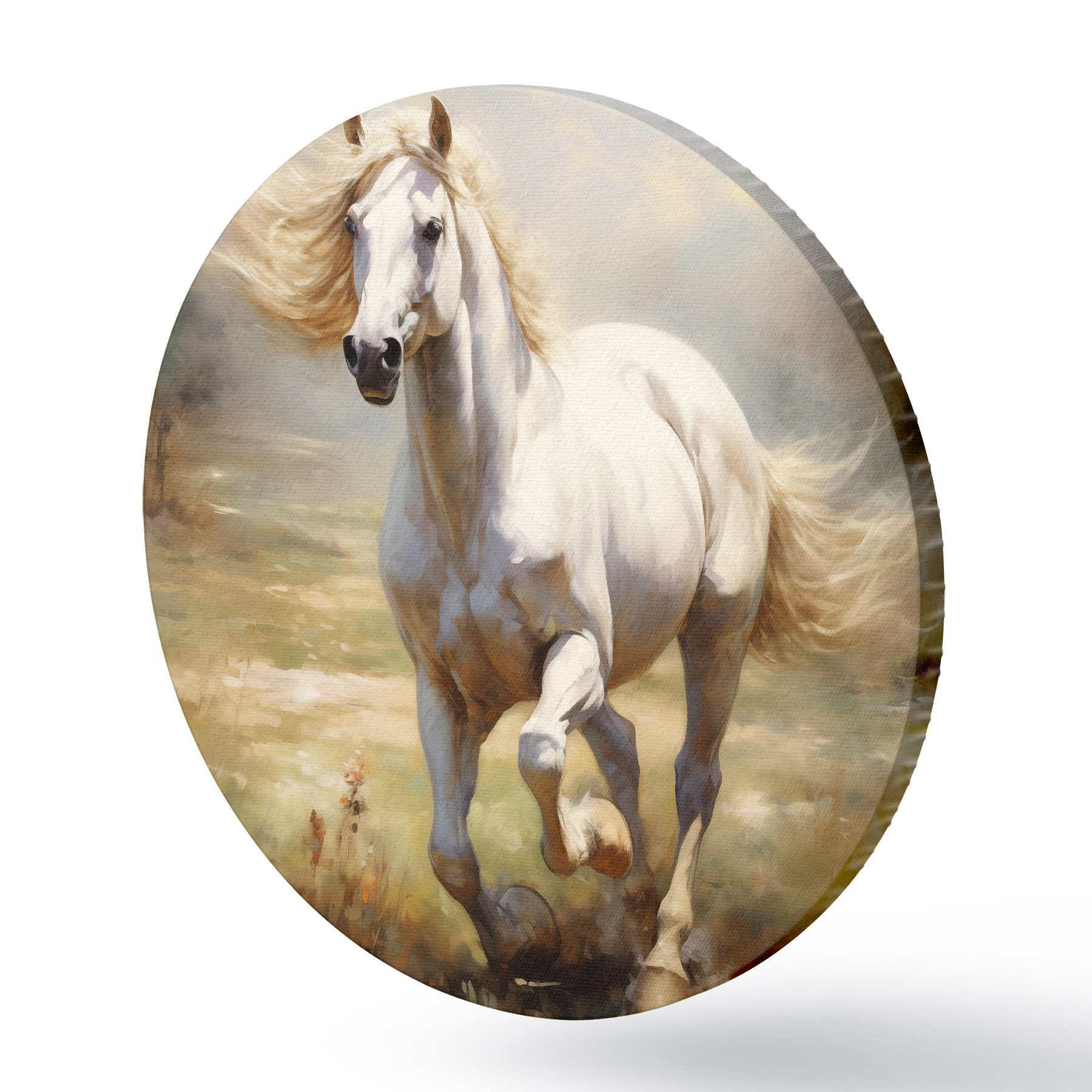 Apaļas gleznas Balts zirgs, kas auļo pa pļavu, eļļas glezna r39818