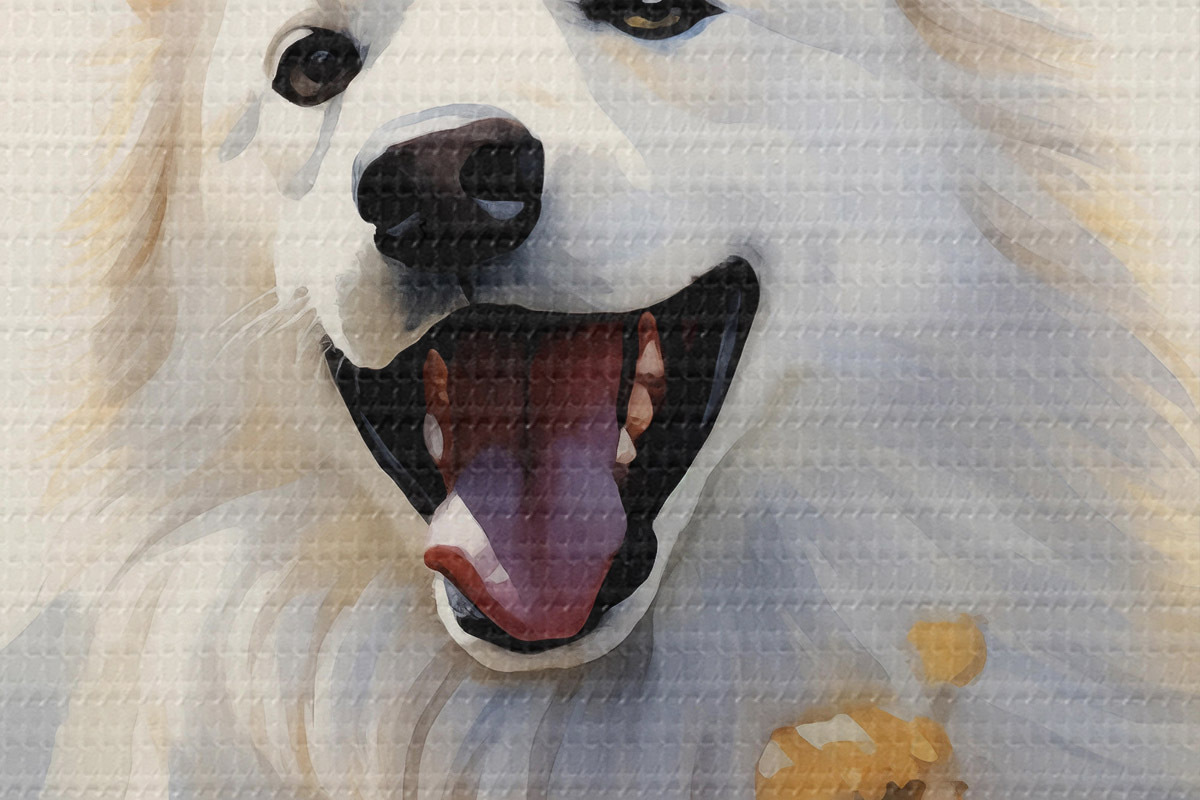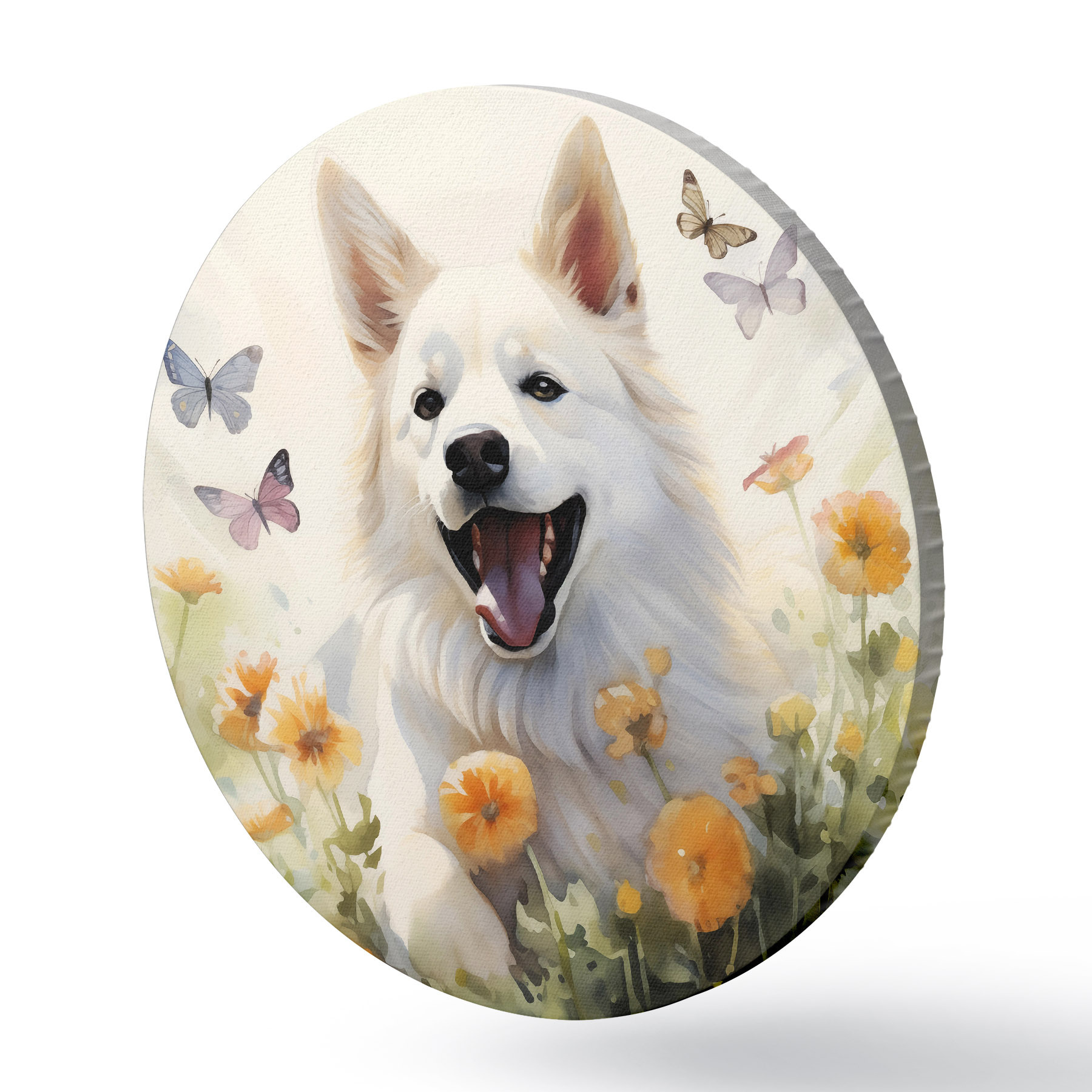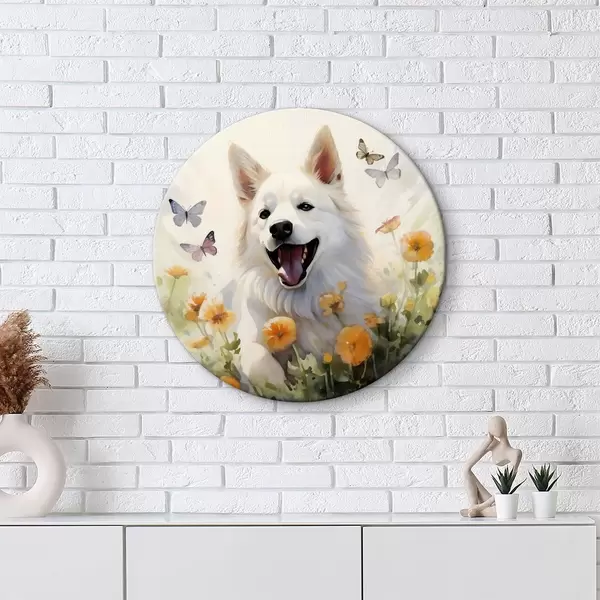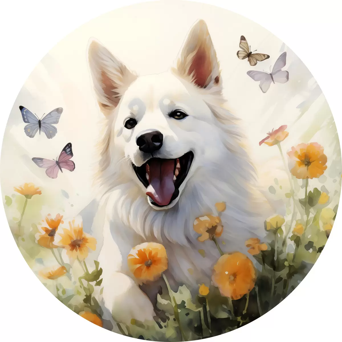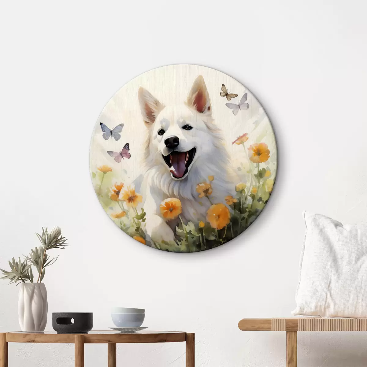 Apaļas gleznas Balts suns sēž ziedos, tauriņi lido ar akvareli r39936