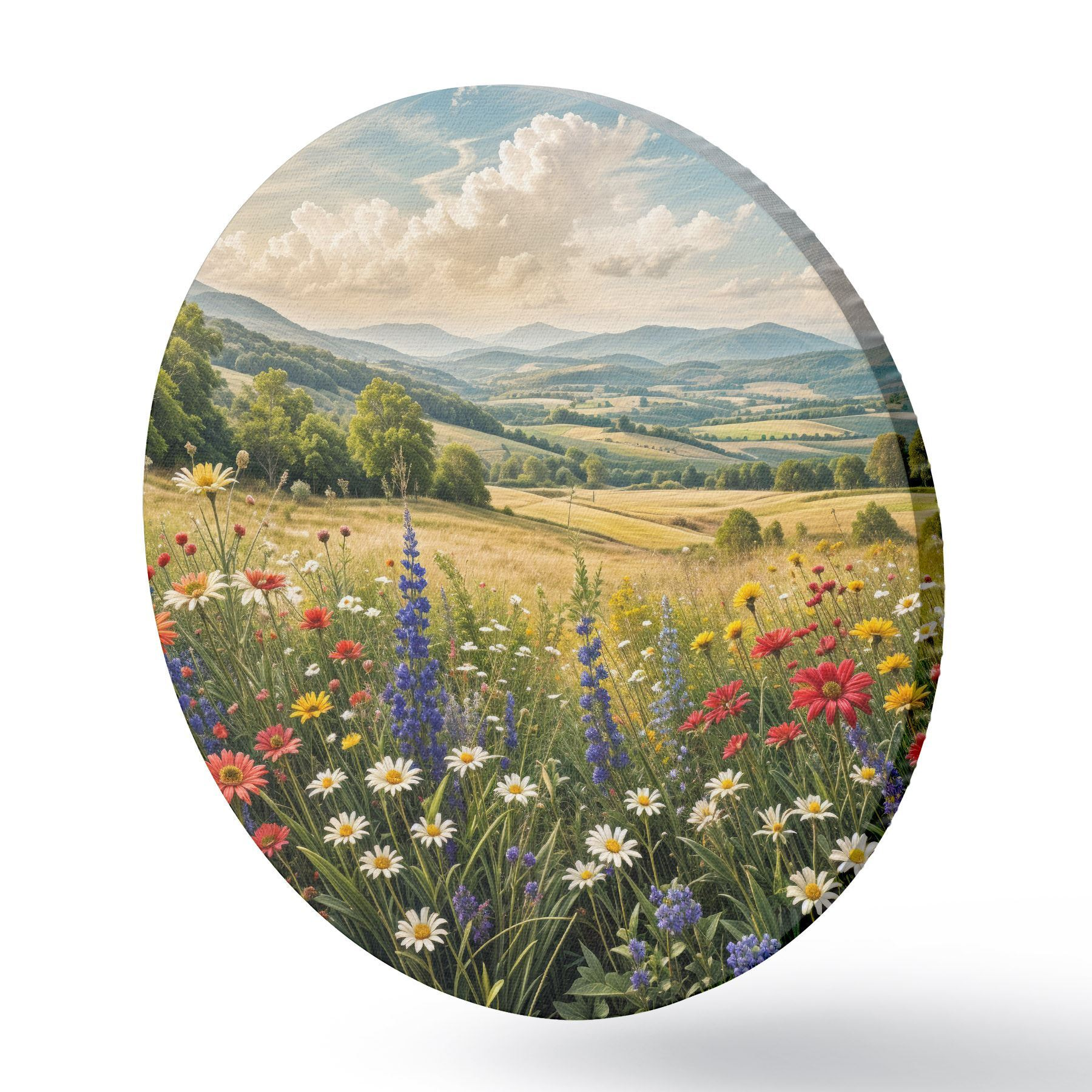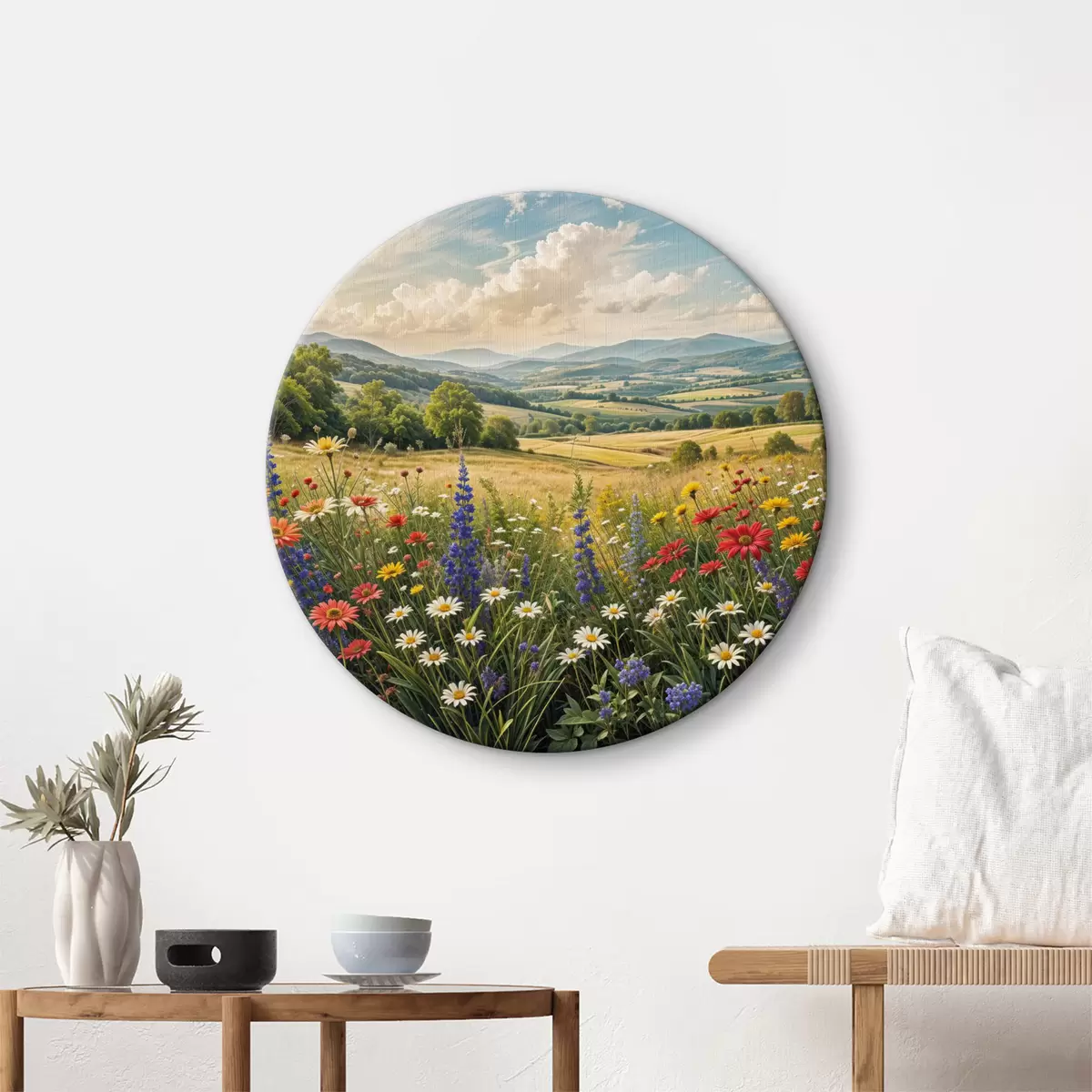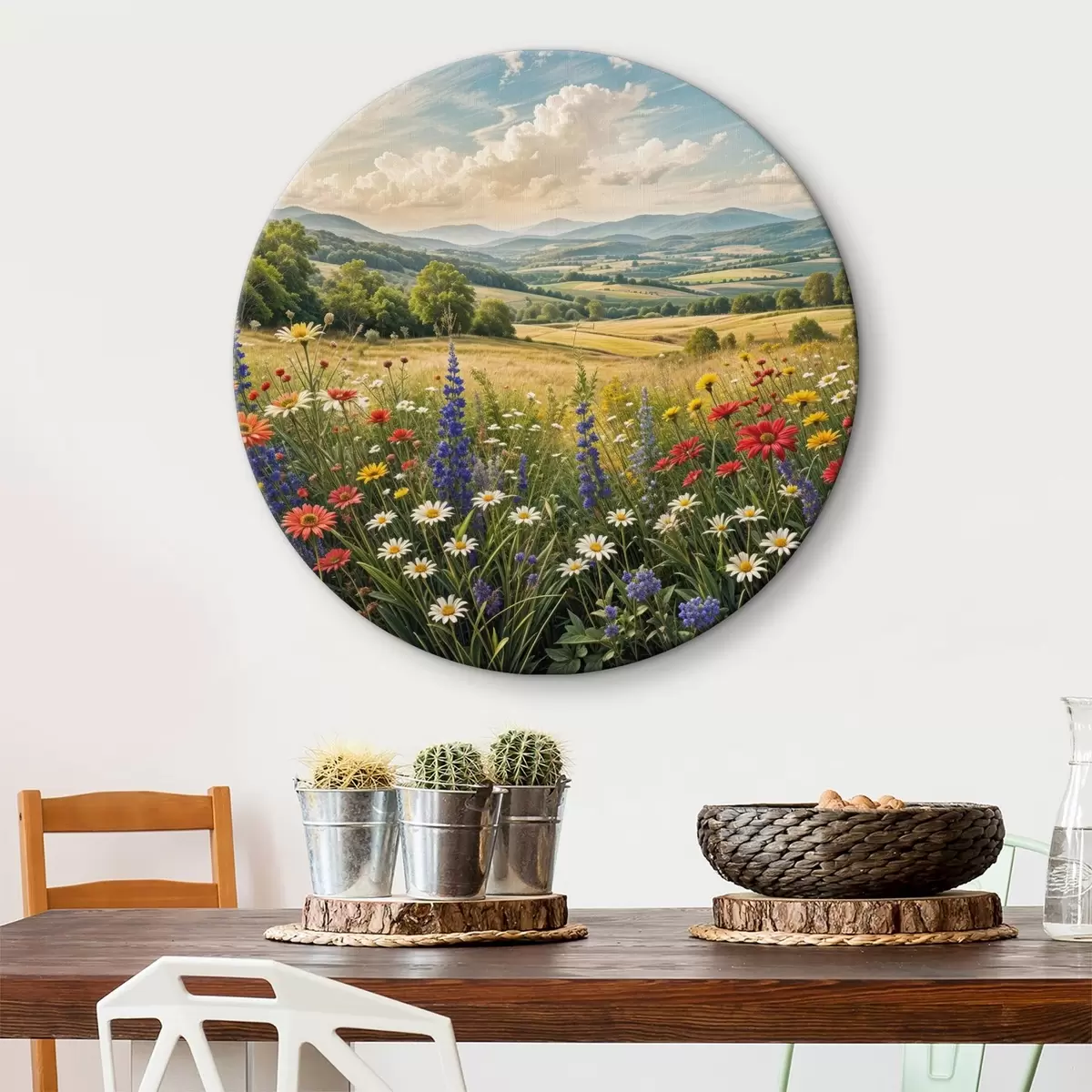Apaļas gleznas Lekna lauku ainava ar dinamisku savvaļas ziedu pļavu, kas piepildīta ar krāsainiem ziediem zem mākoņainām debesīm r40018