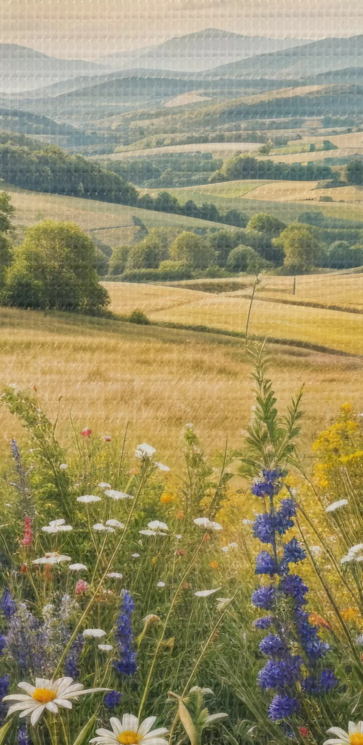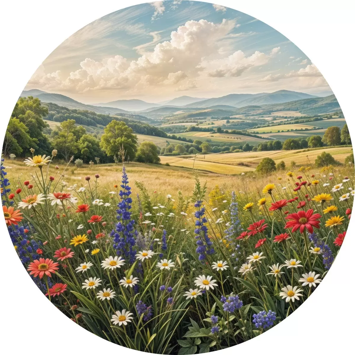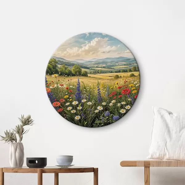 Apaļas gleznas Lekna lauku ainava ar dinamisku savvaļas ziedu pļavu, kas piepildīta ar krāsainiem ziediem zem mākoņainām debesīm r40018