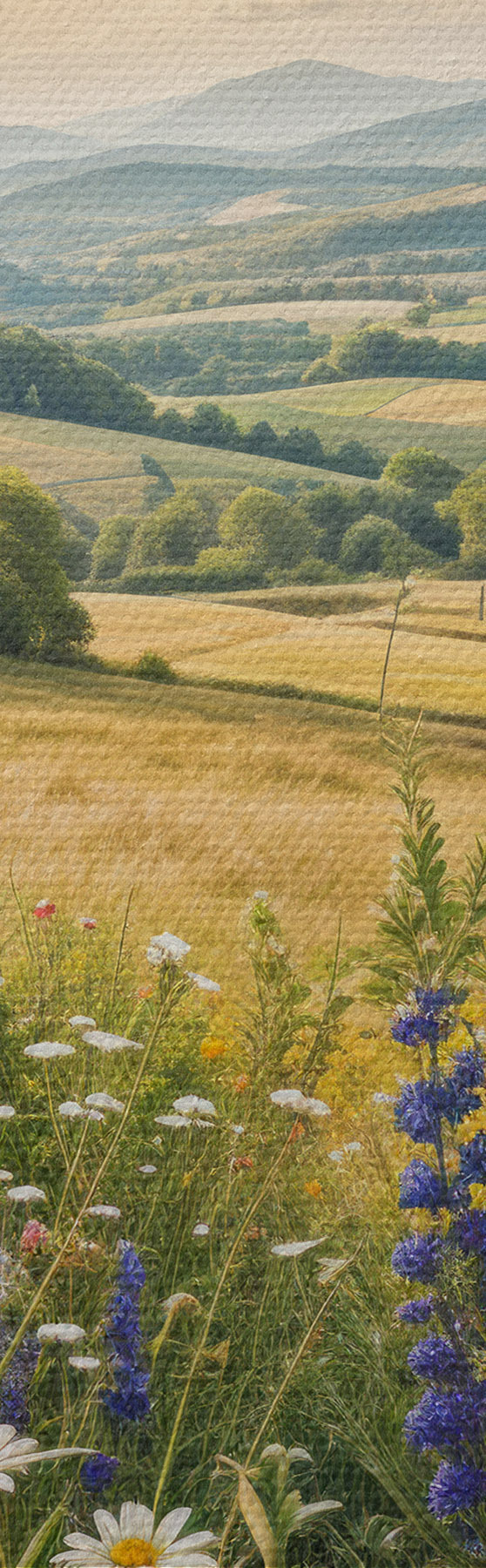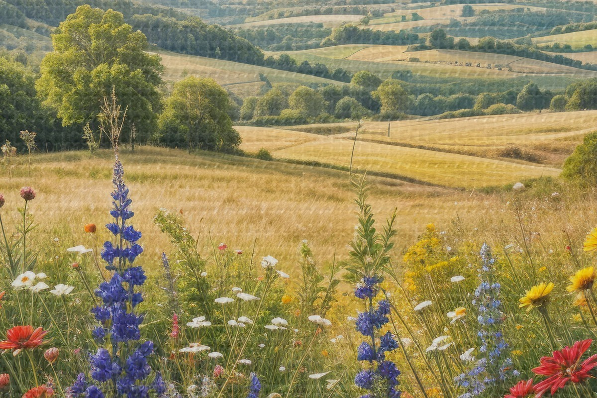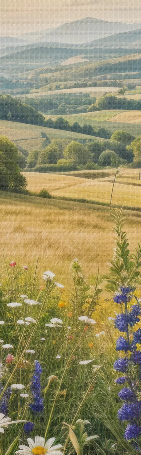 Attēls Lekna lauku ainava ar dinamisku savvaļas ziedu pļavu, kas piepildīta ar krāsainiem ziediem zem mākoņainām debesīm Nr r40018