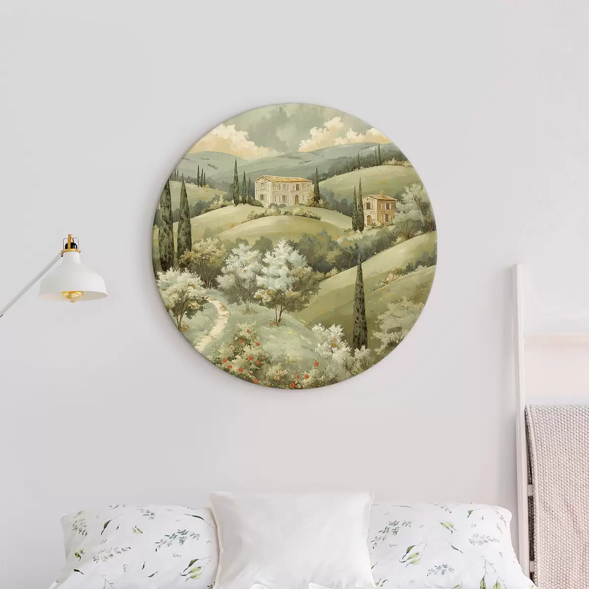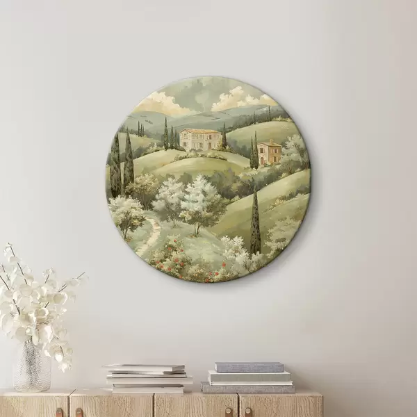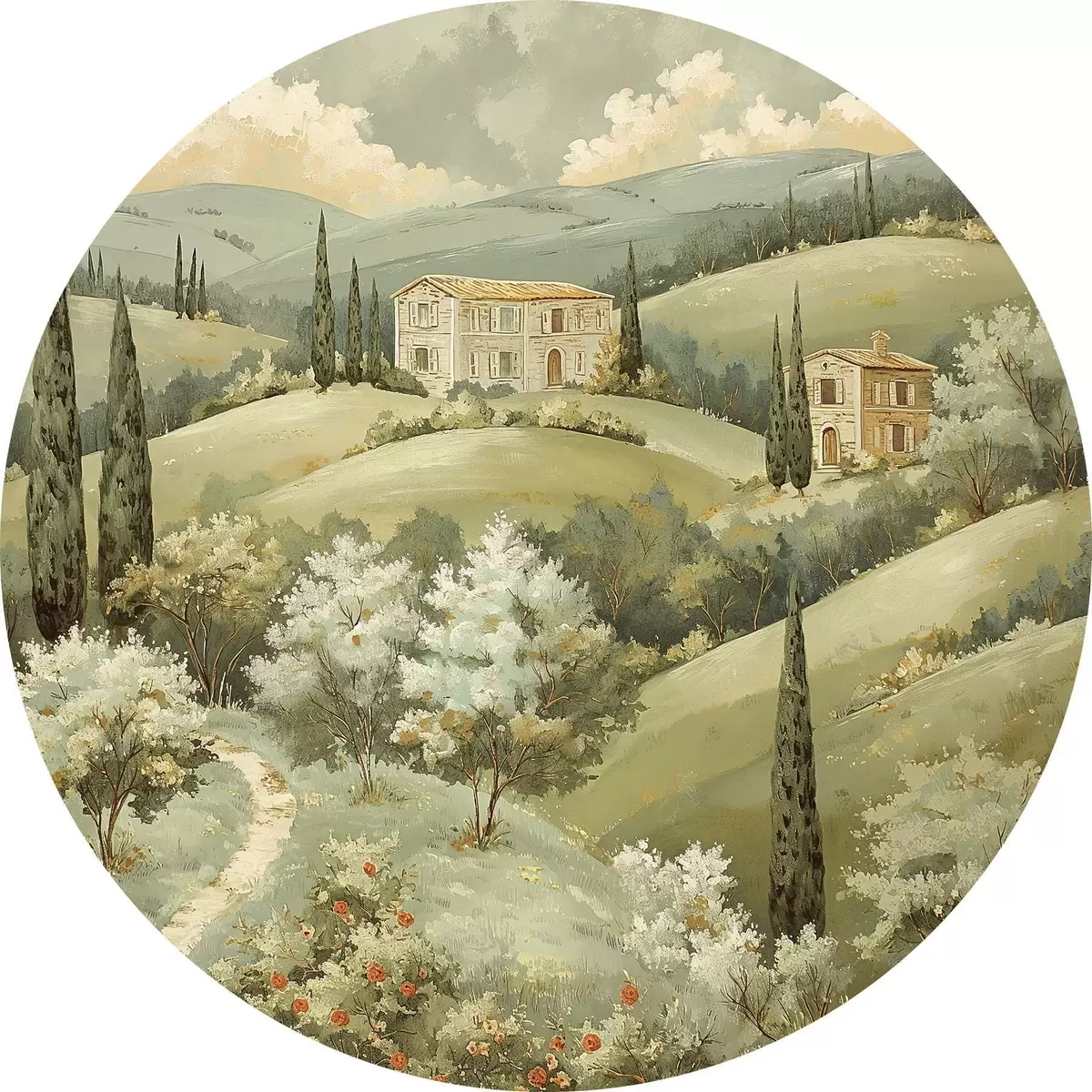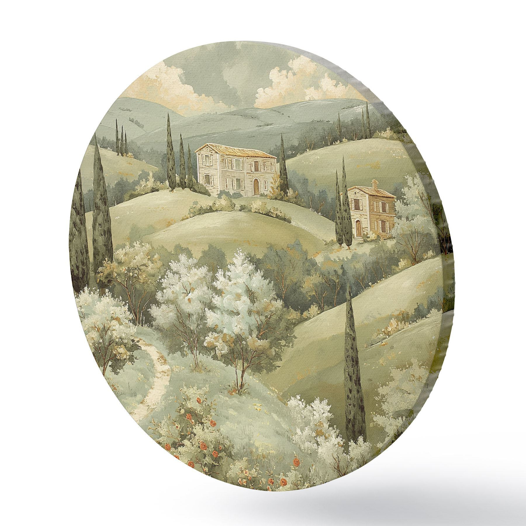 Apaļas gleznas Ainava ar vintage mājām, pasteļzaļās krāsas, akrila zīmējums, vasara r40078