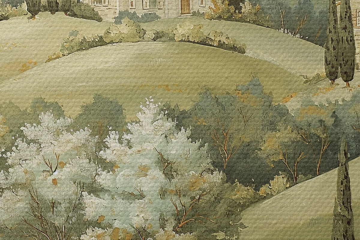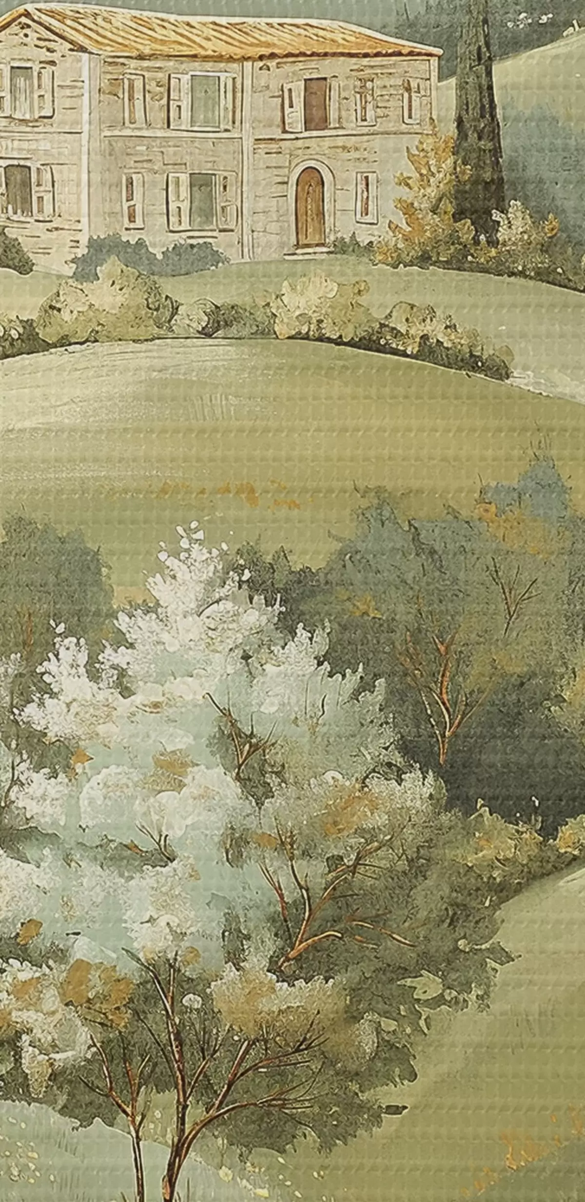 Attēls Ainava ar vintage mājām, pasteļzaļās krāsas, akrila zīmējums, vasara Nr r40078
