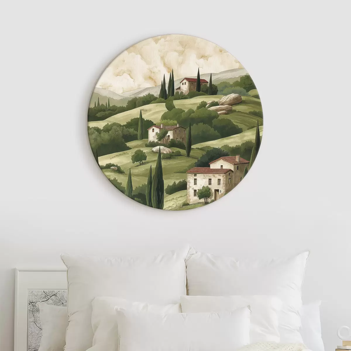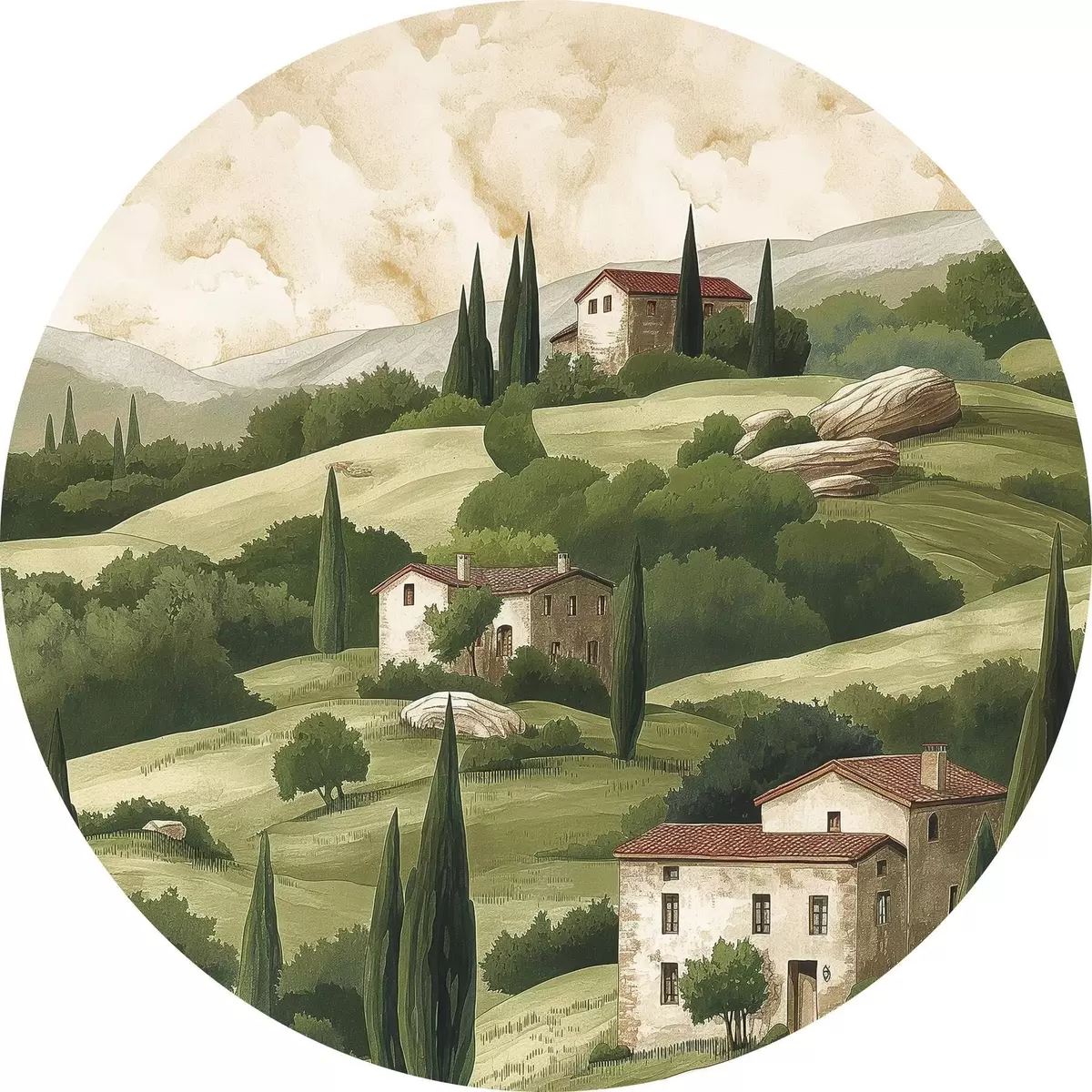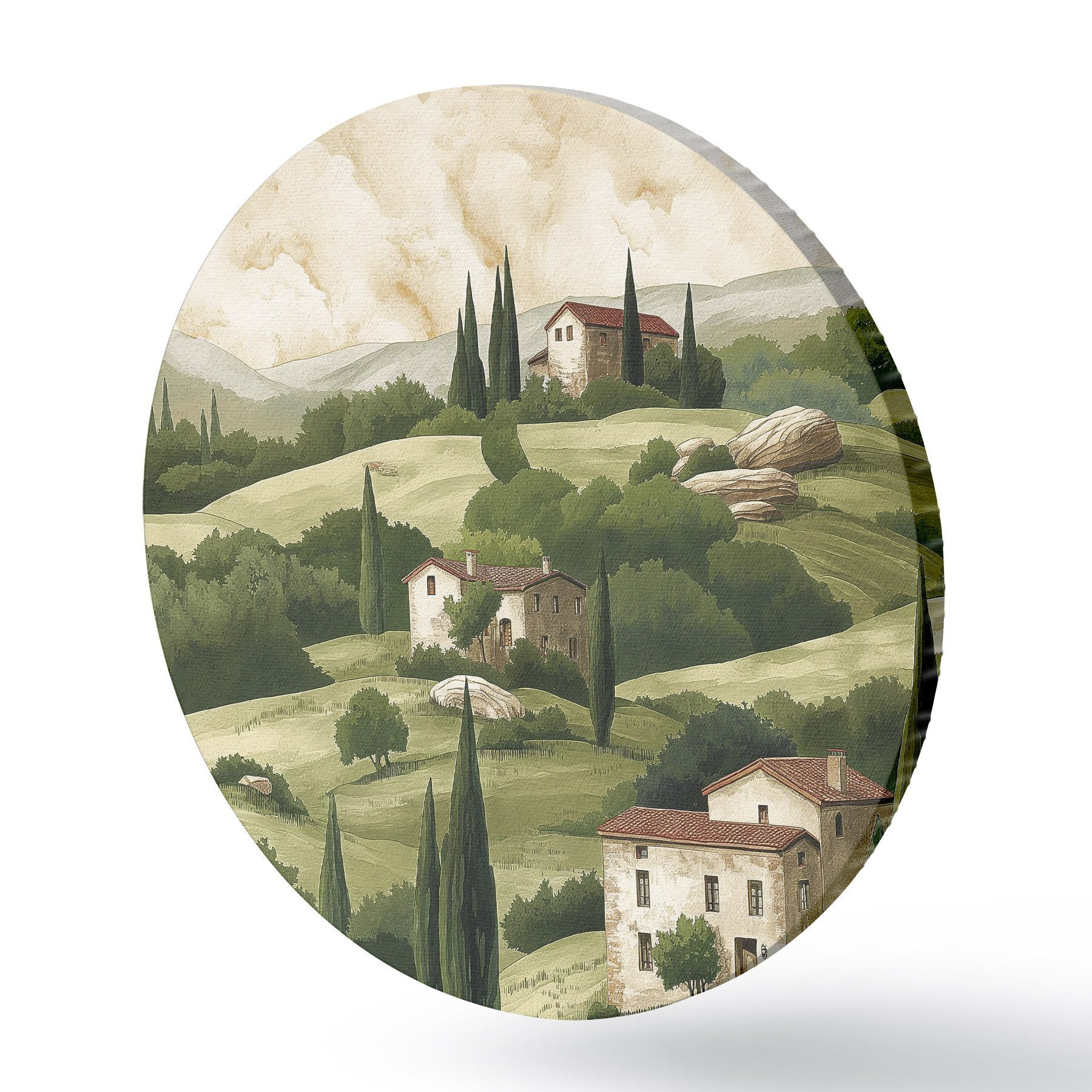 Apaļas gleznas Ainava ar vintage mājām, pasteļzaļās krāsas, akrila zīmējums, zemniecisks r40080
