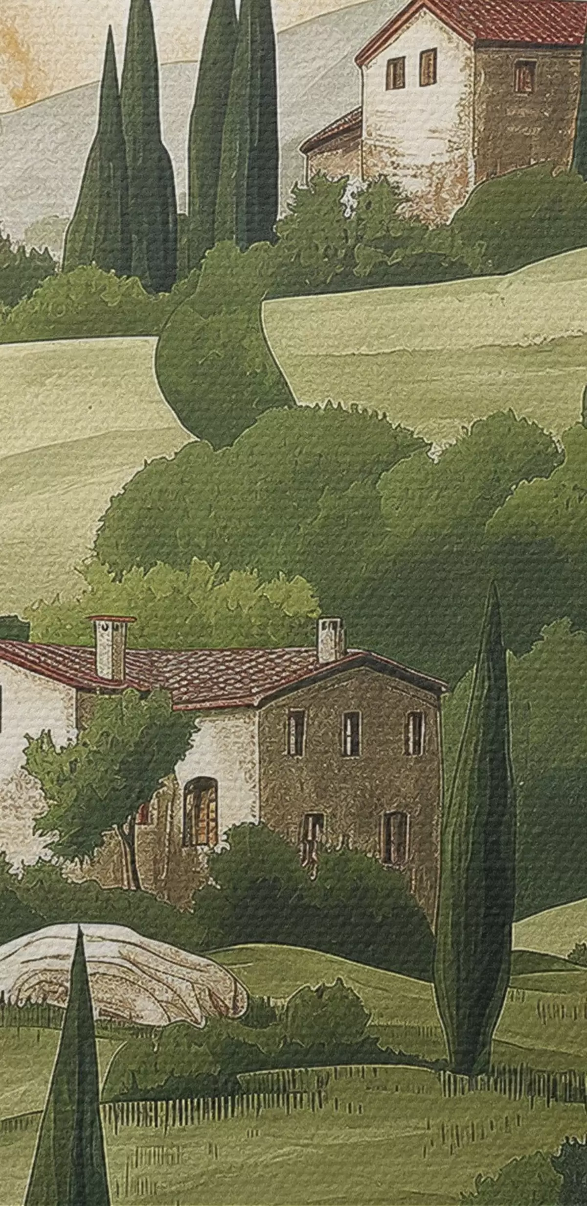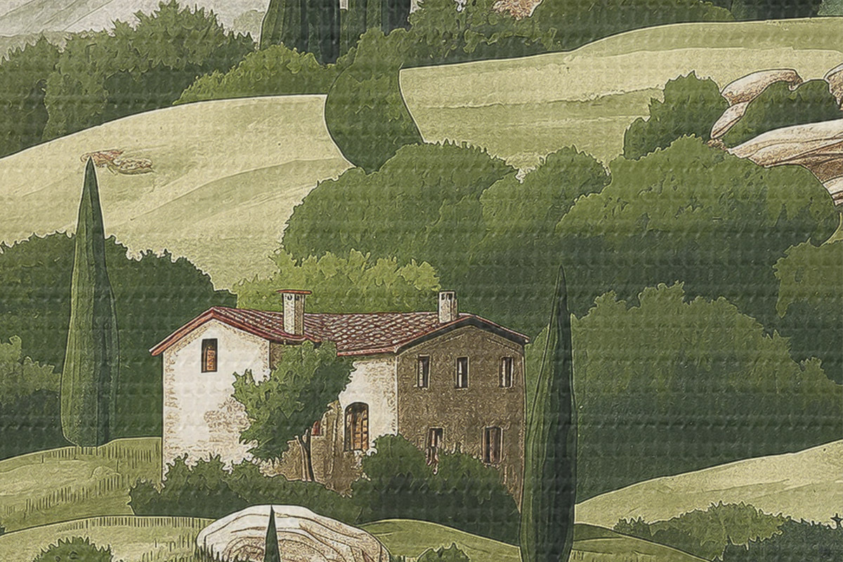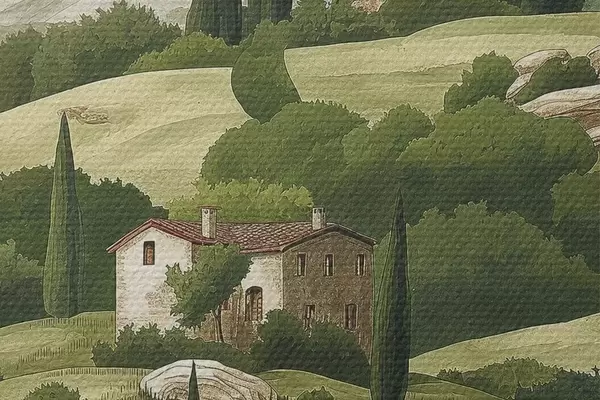 Attēls Ainava ar vintage mājām, pasteļzaļās krāsas, akrila zīmējums, zemniecisks Nr r40080
