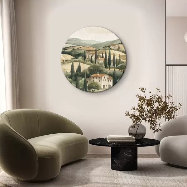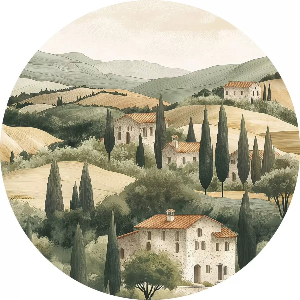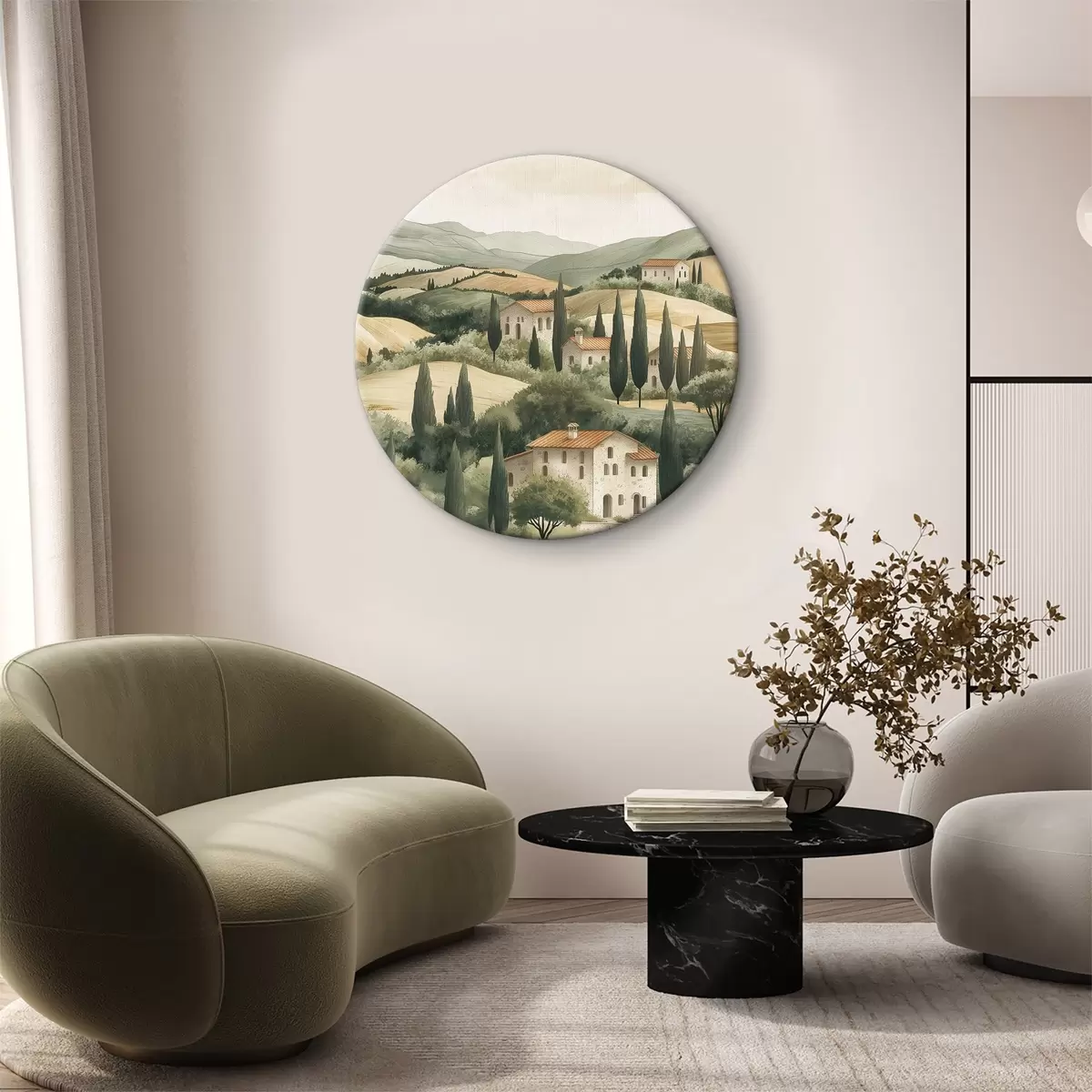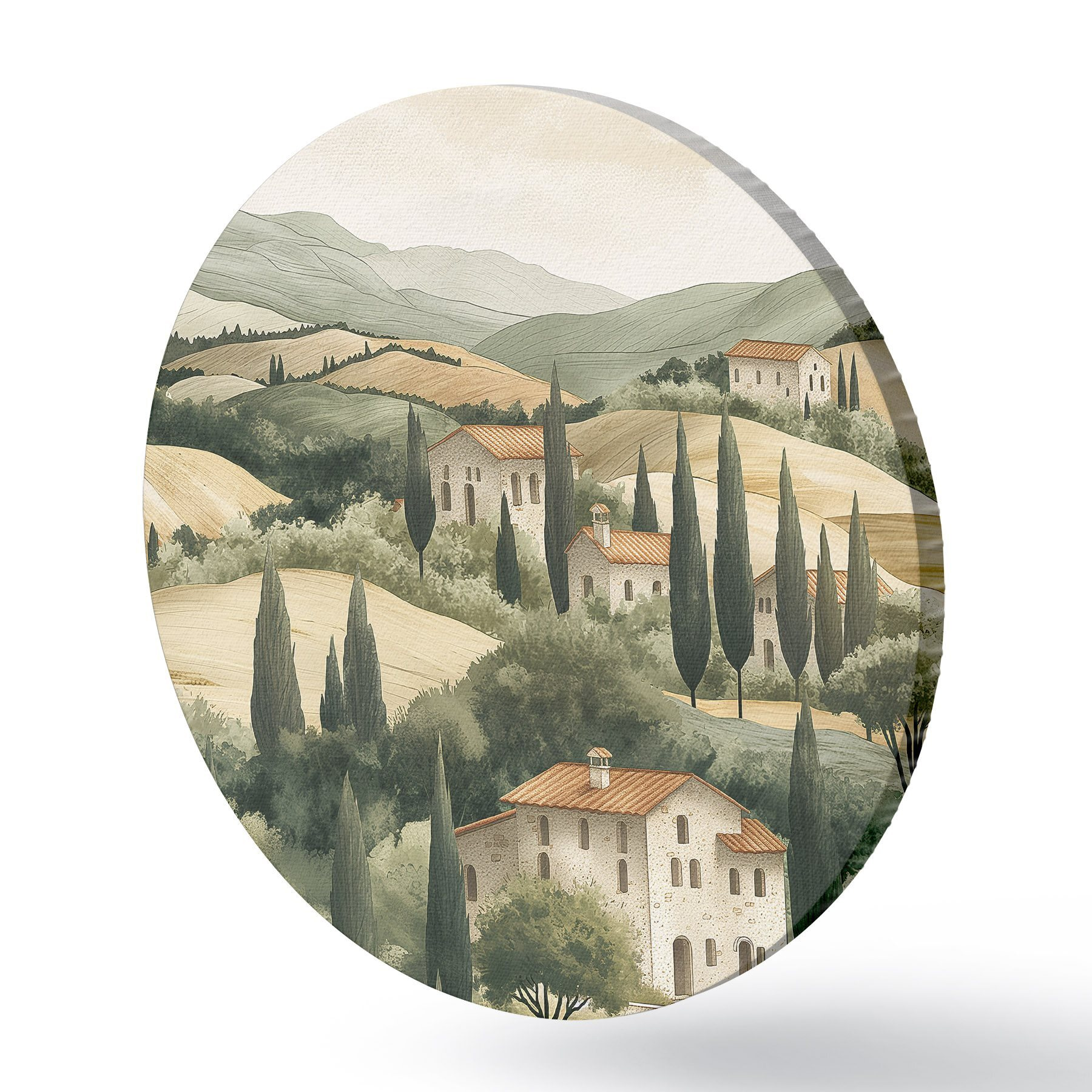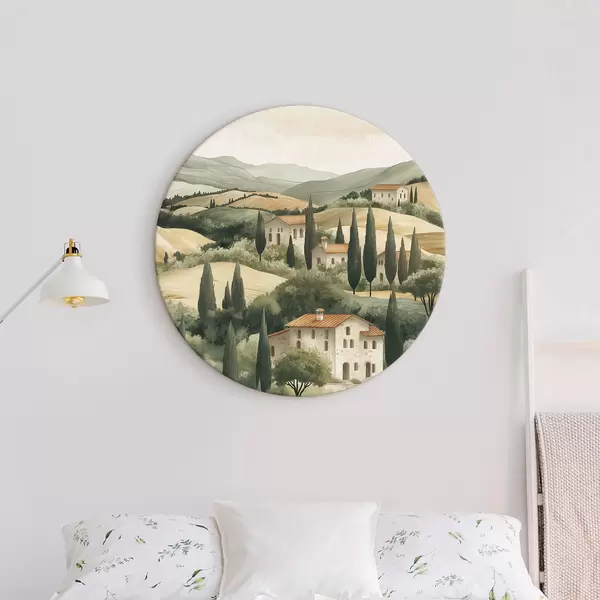 Apaļas gleznas Toskānas ainava ar senlaicīgām mājām, pasteļtoņos, pakalniem un kokiem, zemniecisks r40082