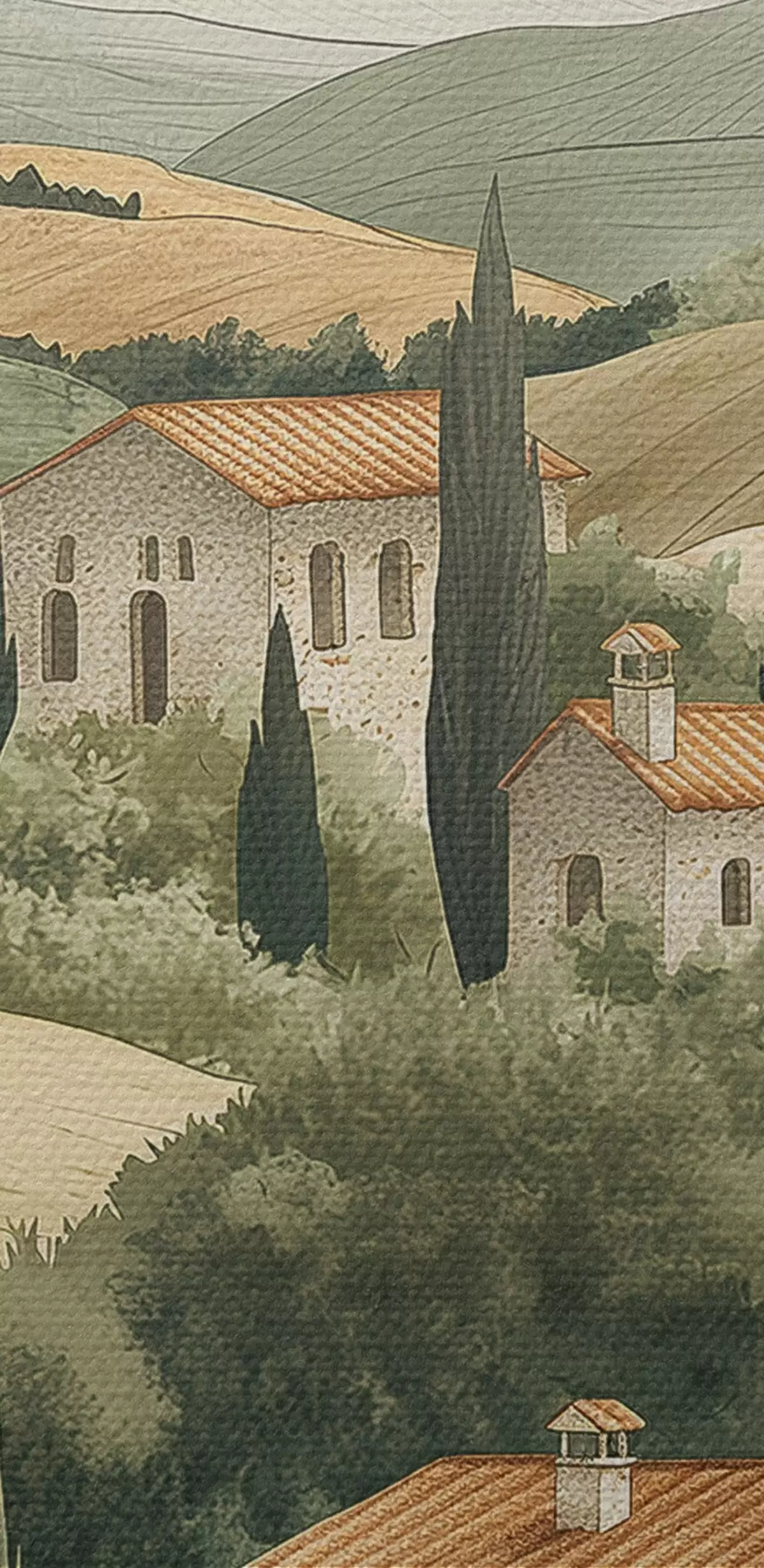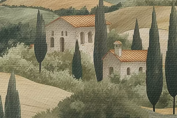 Attēls Toskānas ainava ar senlaicīgām mājām, pasteļtoņos, pakalniem un kokiem, zemniecisks Nr r40082
