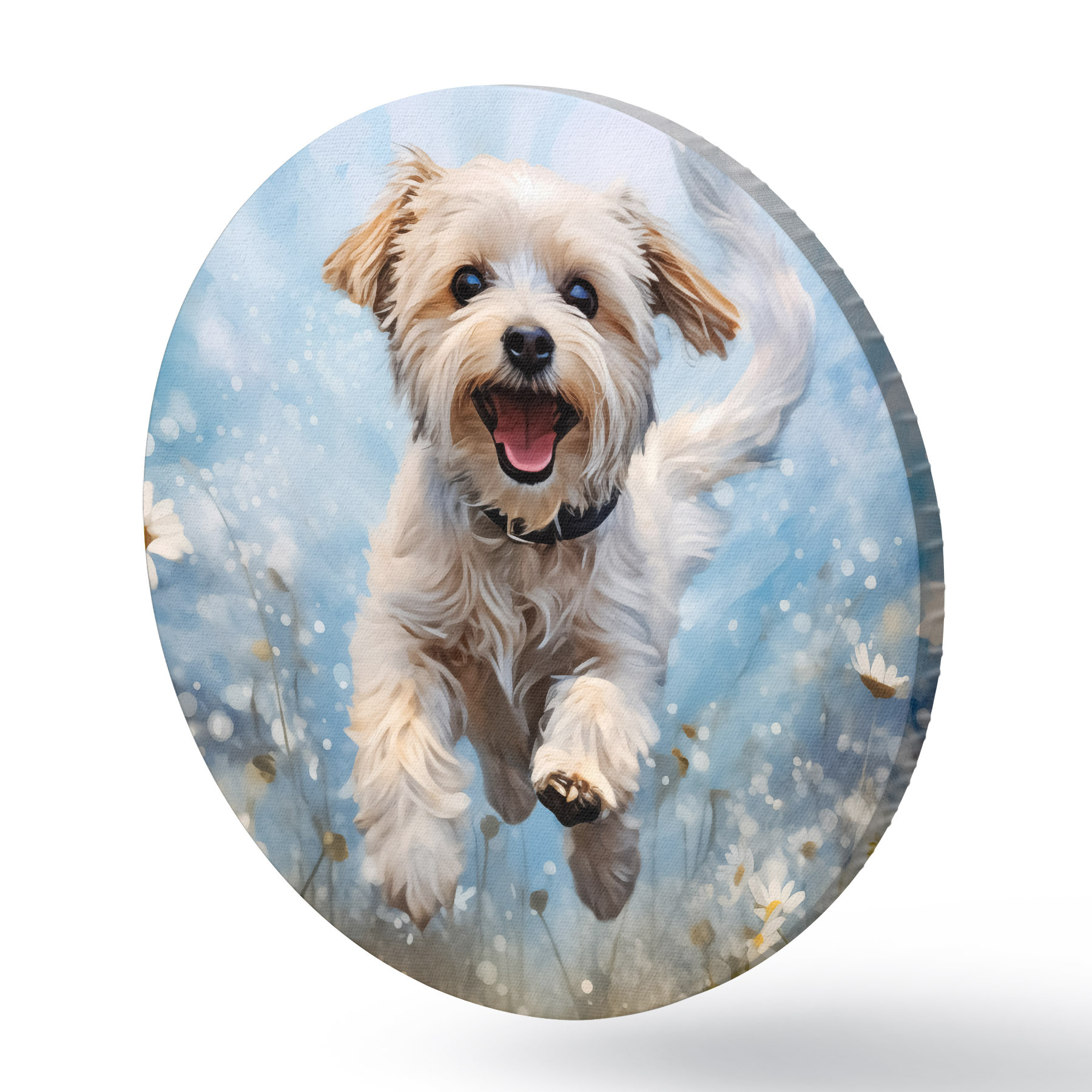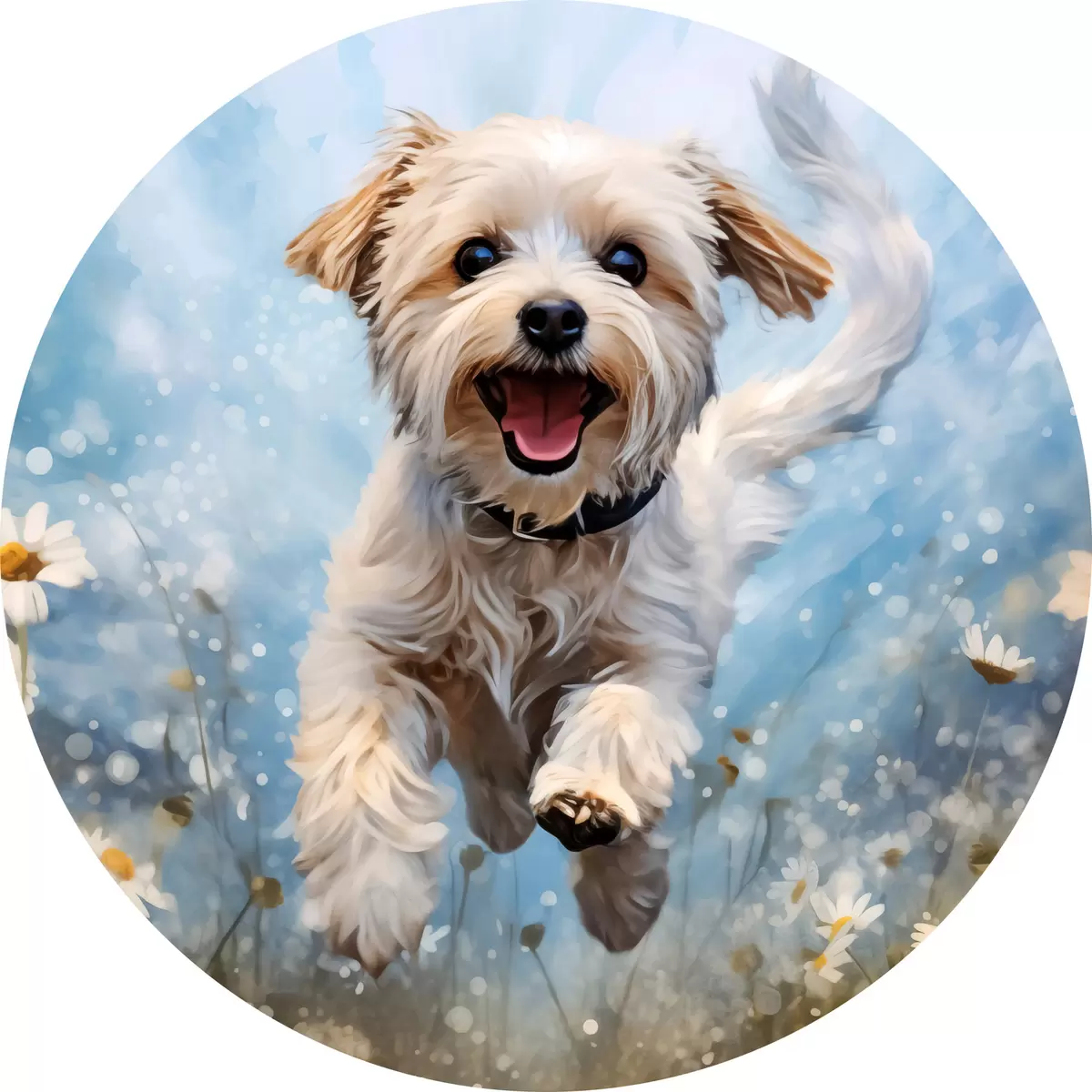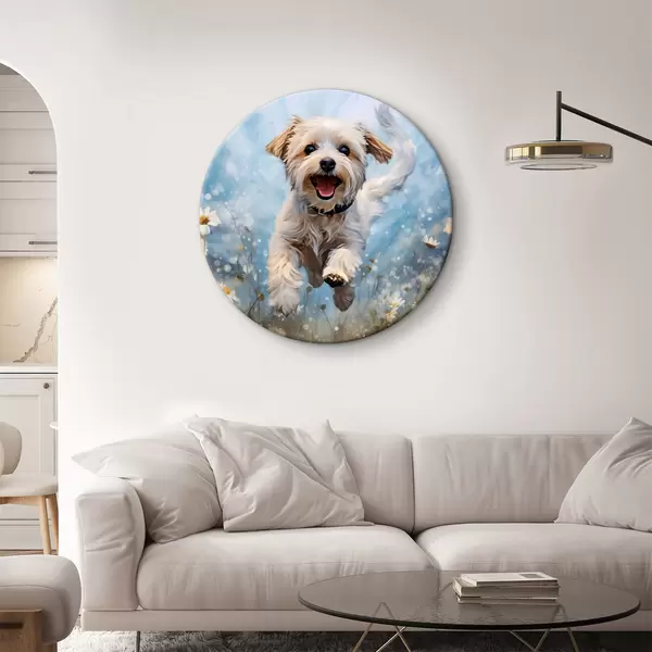 Apaļas gleznas Mazs, balts suns lēkā starp margrietiņām uz zila fona akvareļa r40092