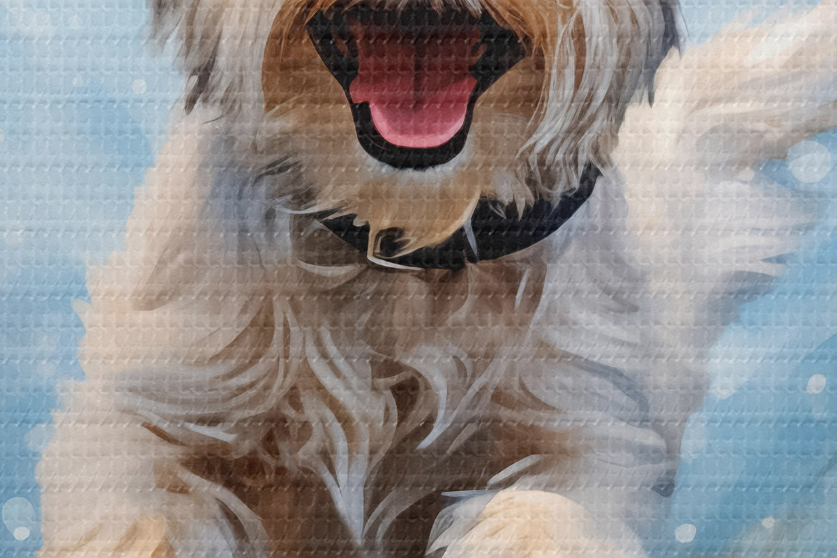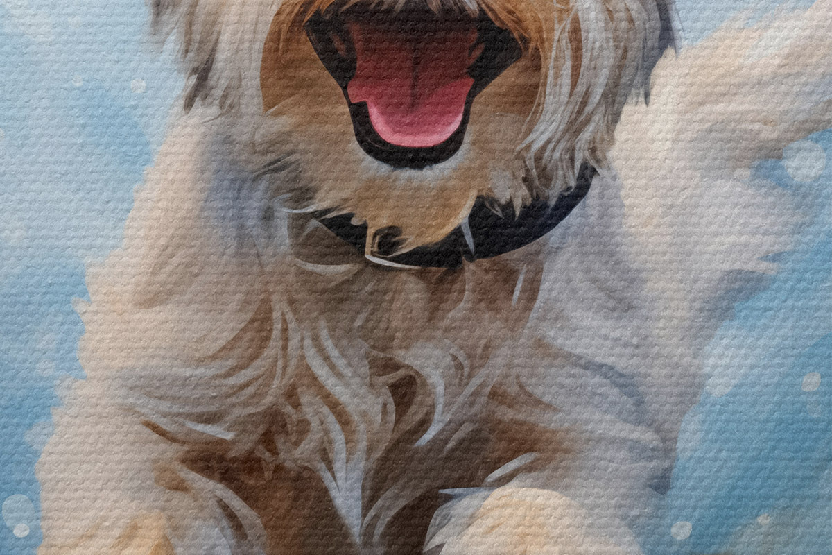 Attēls Mazs, balts suns lēkā starp margrietiņām uz zila fona akvareļa Nr r40092
