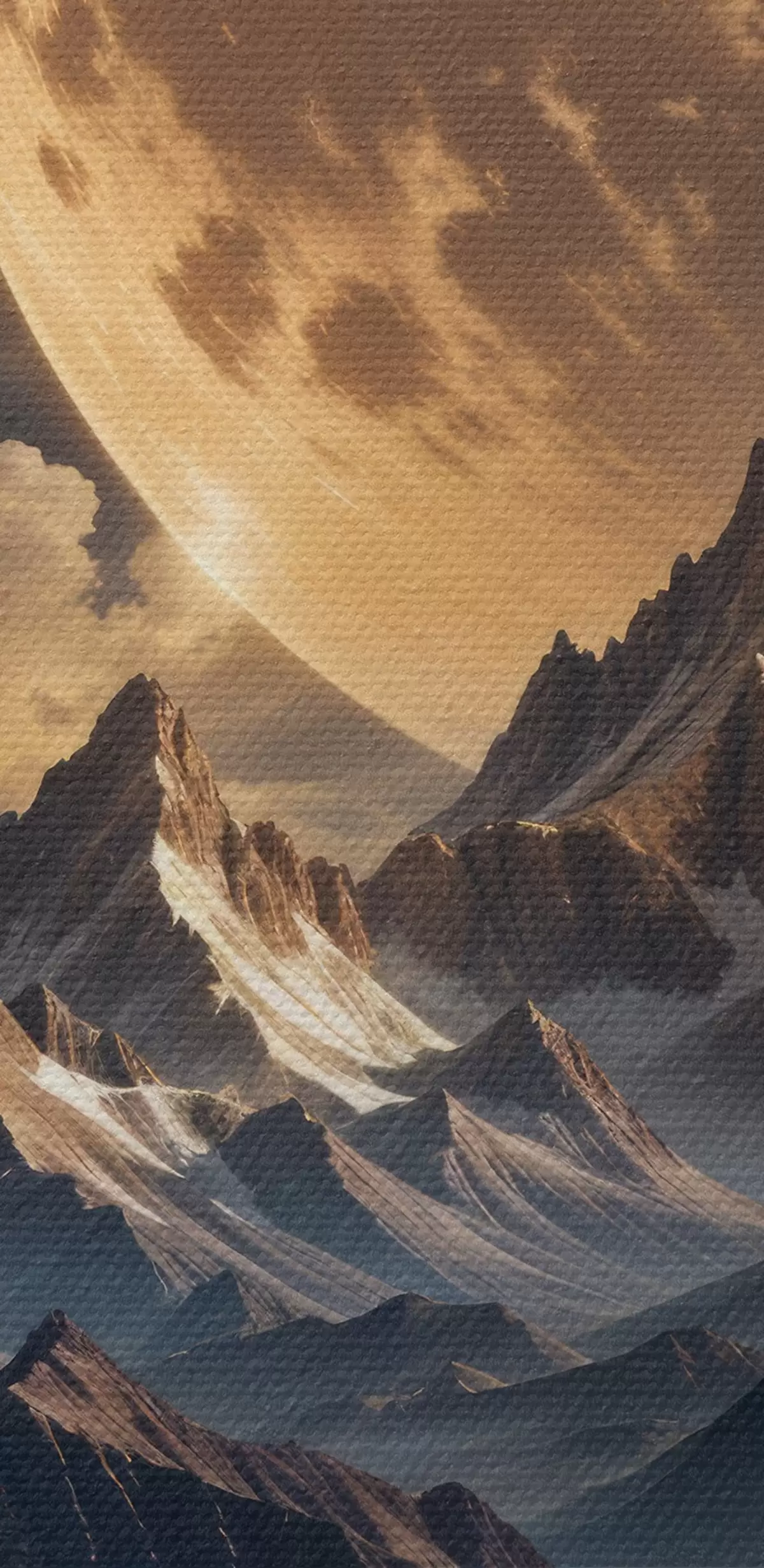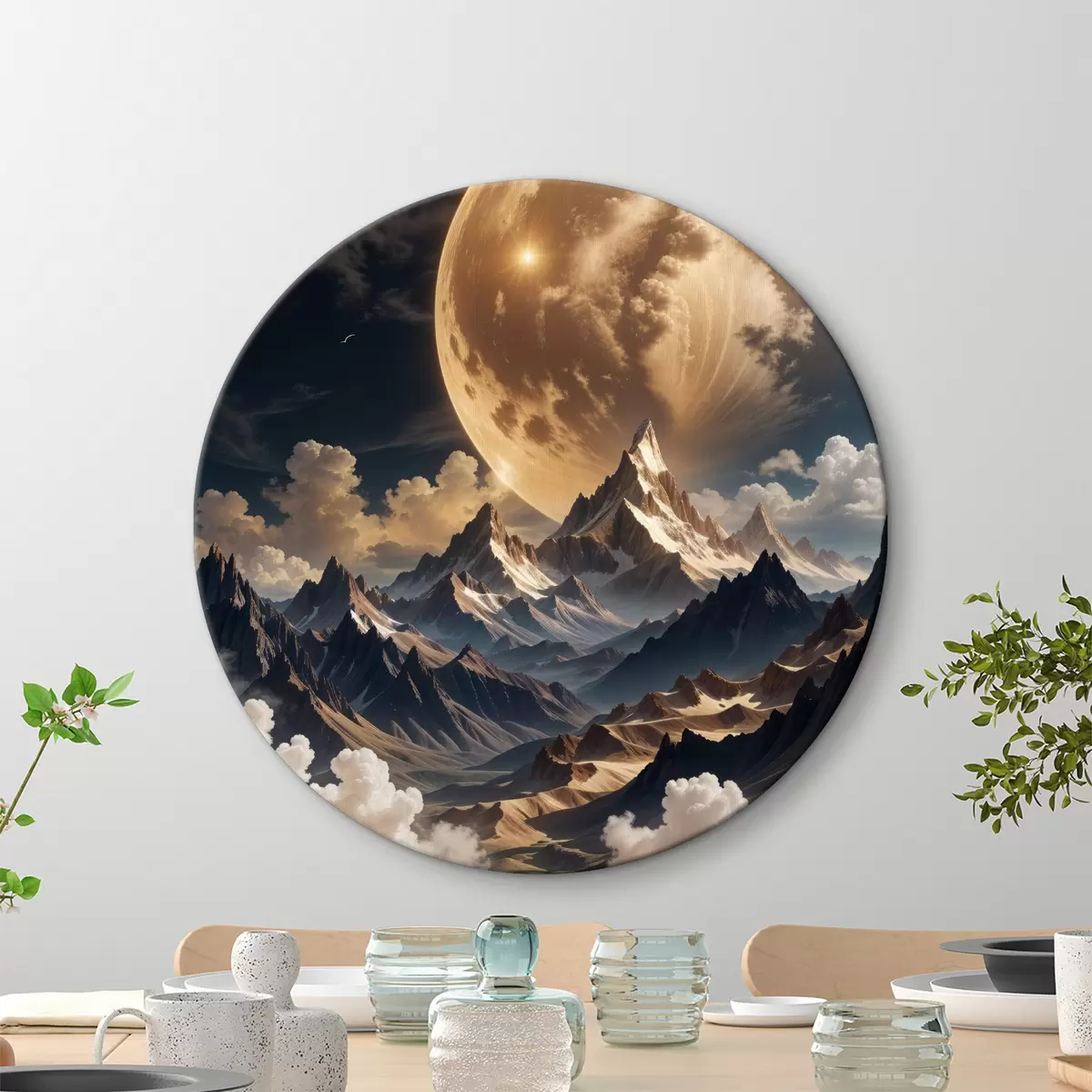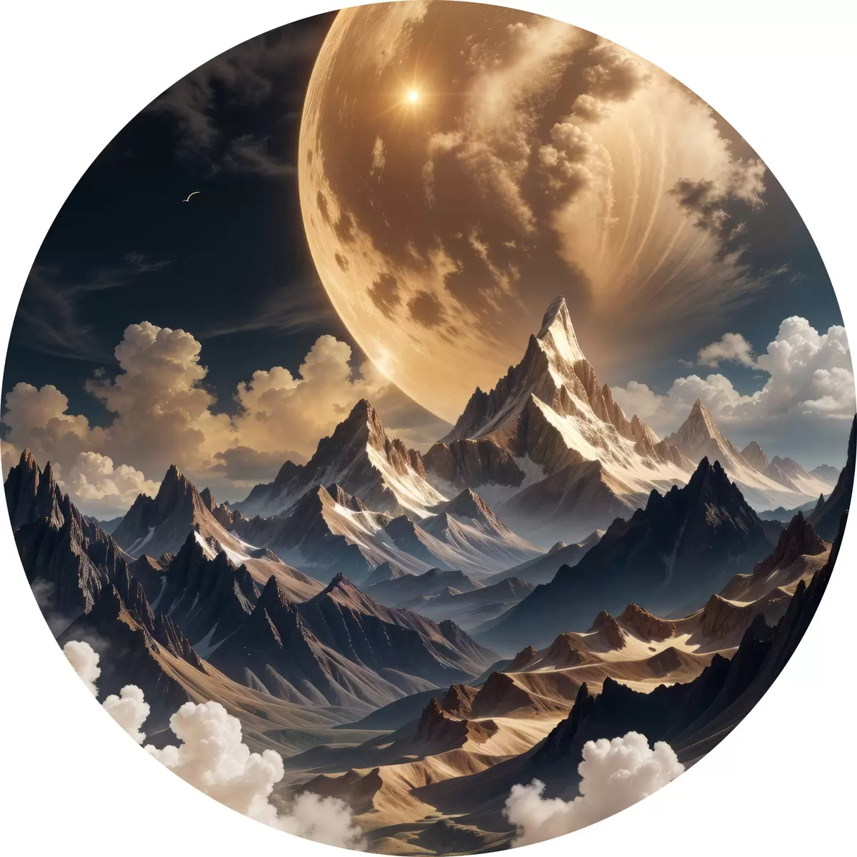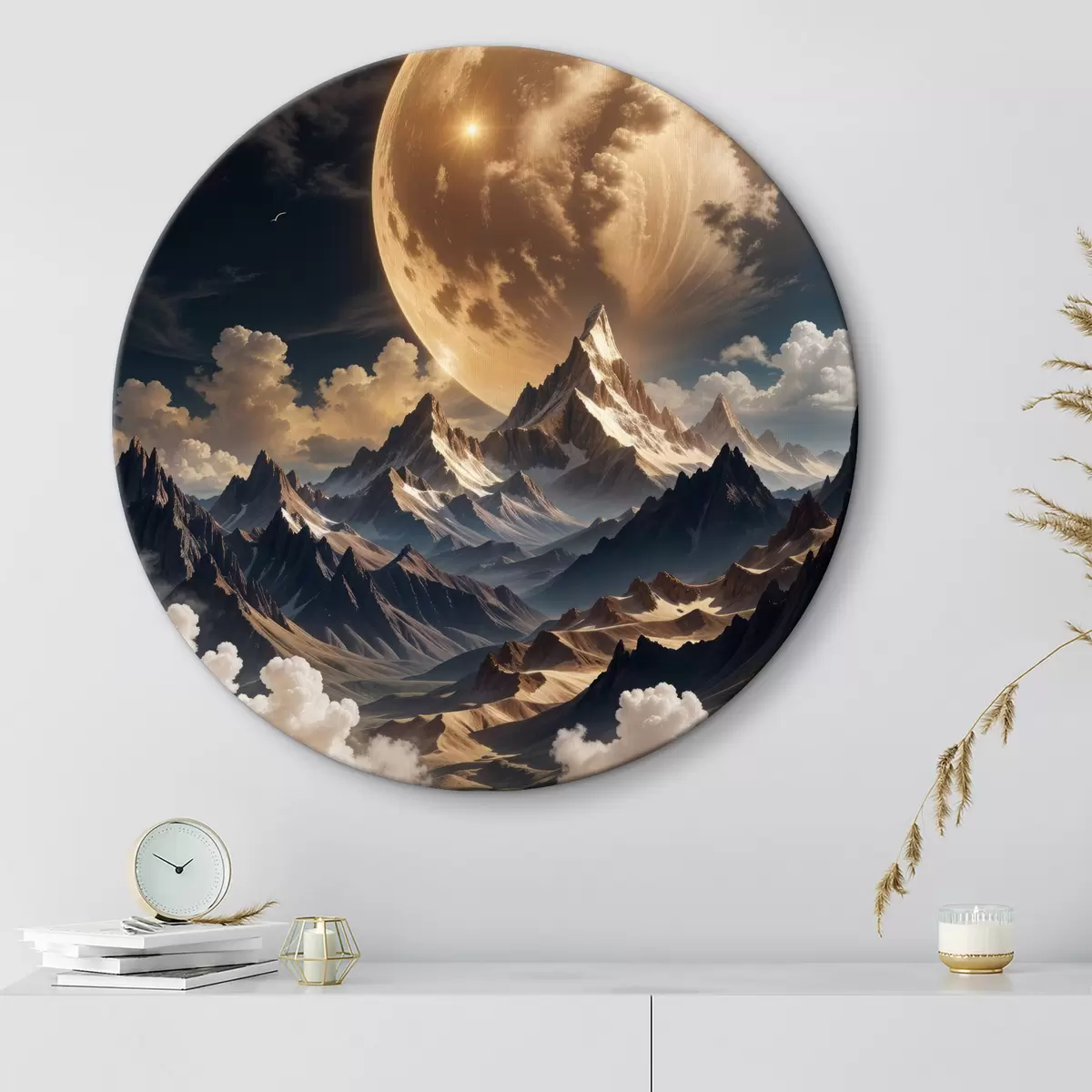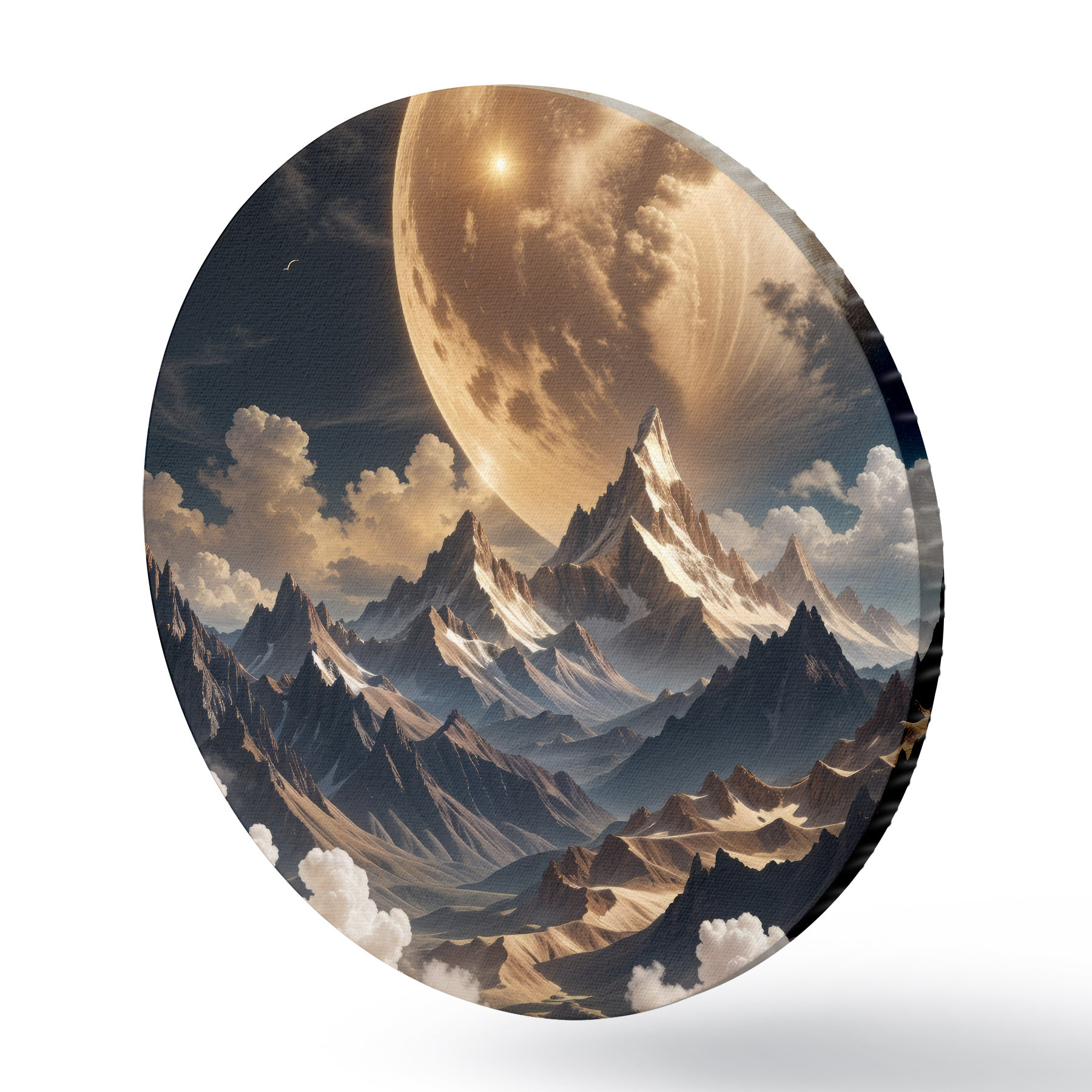Apaļas gleznas Sirreāla ainava ar sniegotiem kalniem masīvā pilnmēness laikā, ar gaišiem mākoņiem r40147