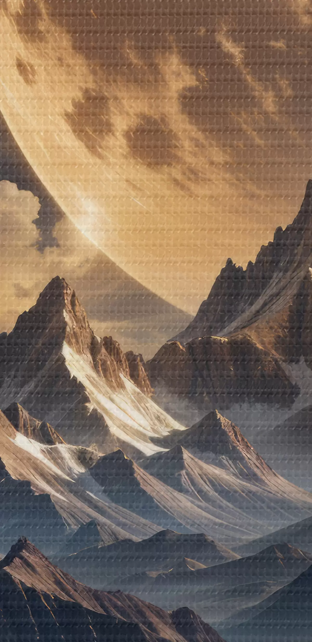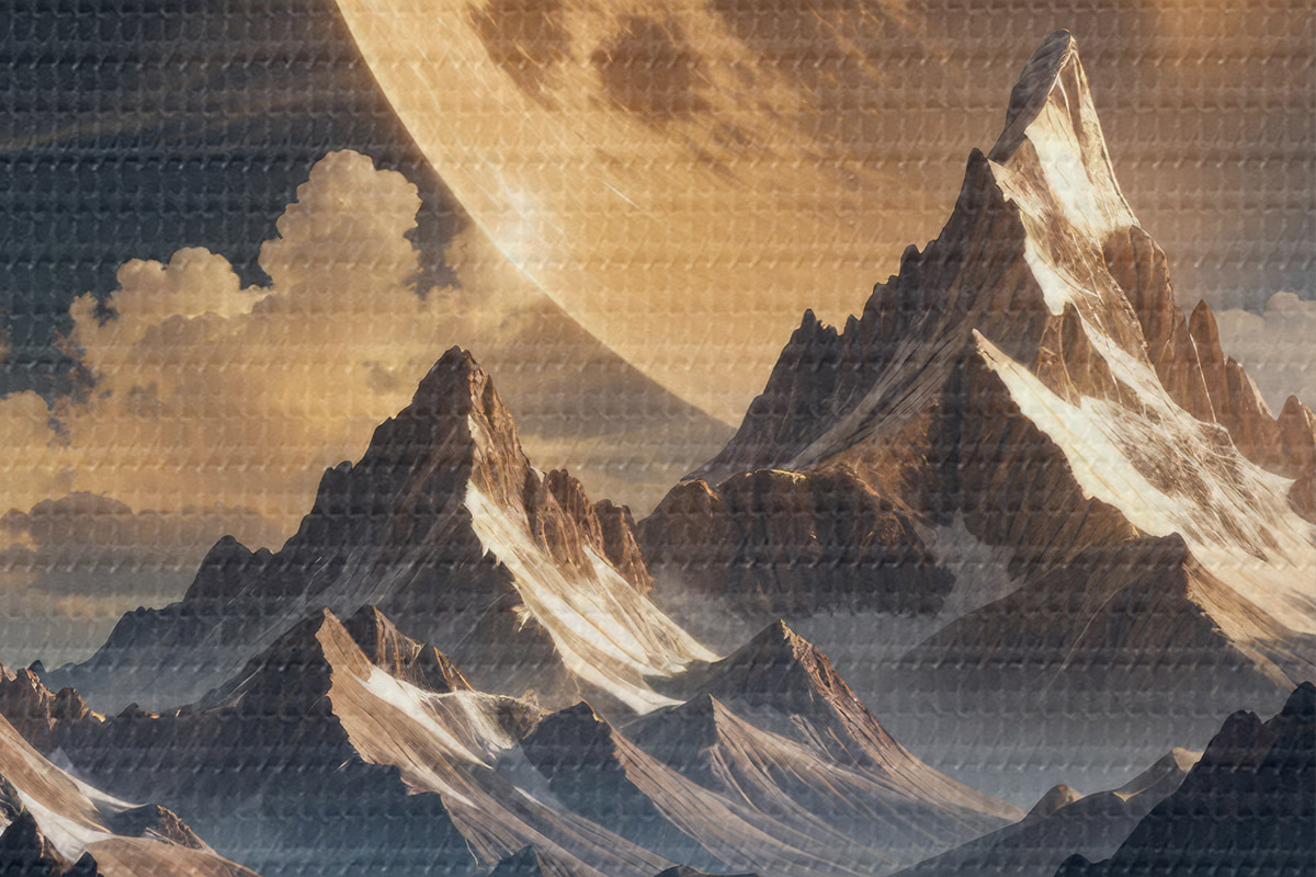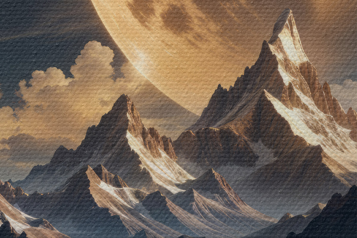 Attēls Sirreāla ainava ar sniegotiem kalniem masīvā pilnmēness laikā, ar gaišiem mākoņiem Nr r40147