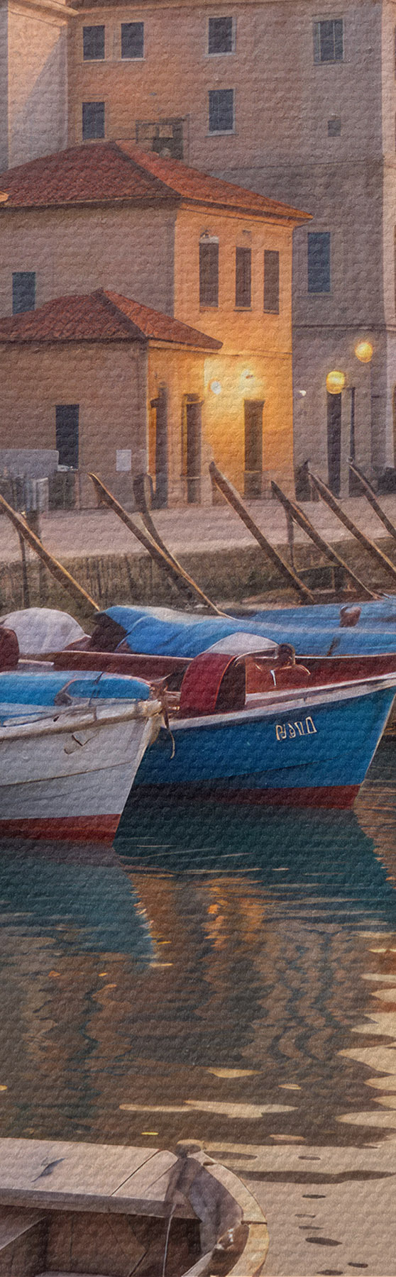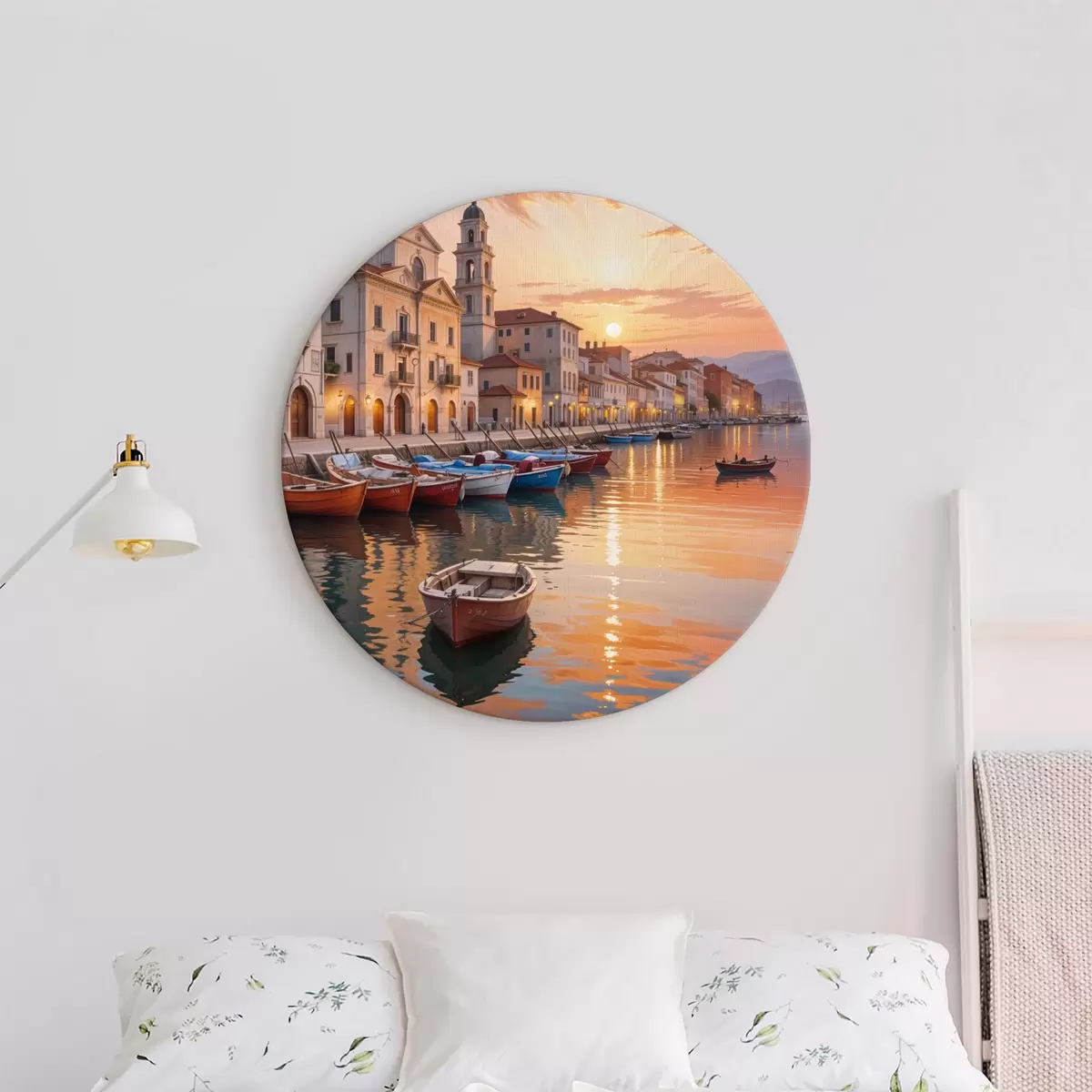 Apaļas gleznas Itālijas piekrastes pilsēta saulrietā ar krāsainām ēkām krastmalā un laivām, kas peld mierīgos ūdeņos r40150
