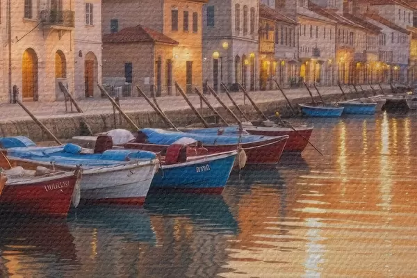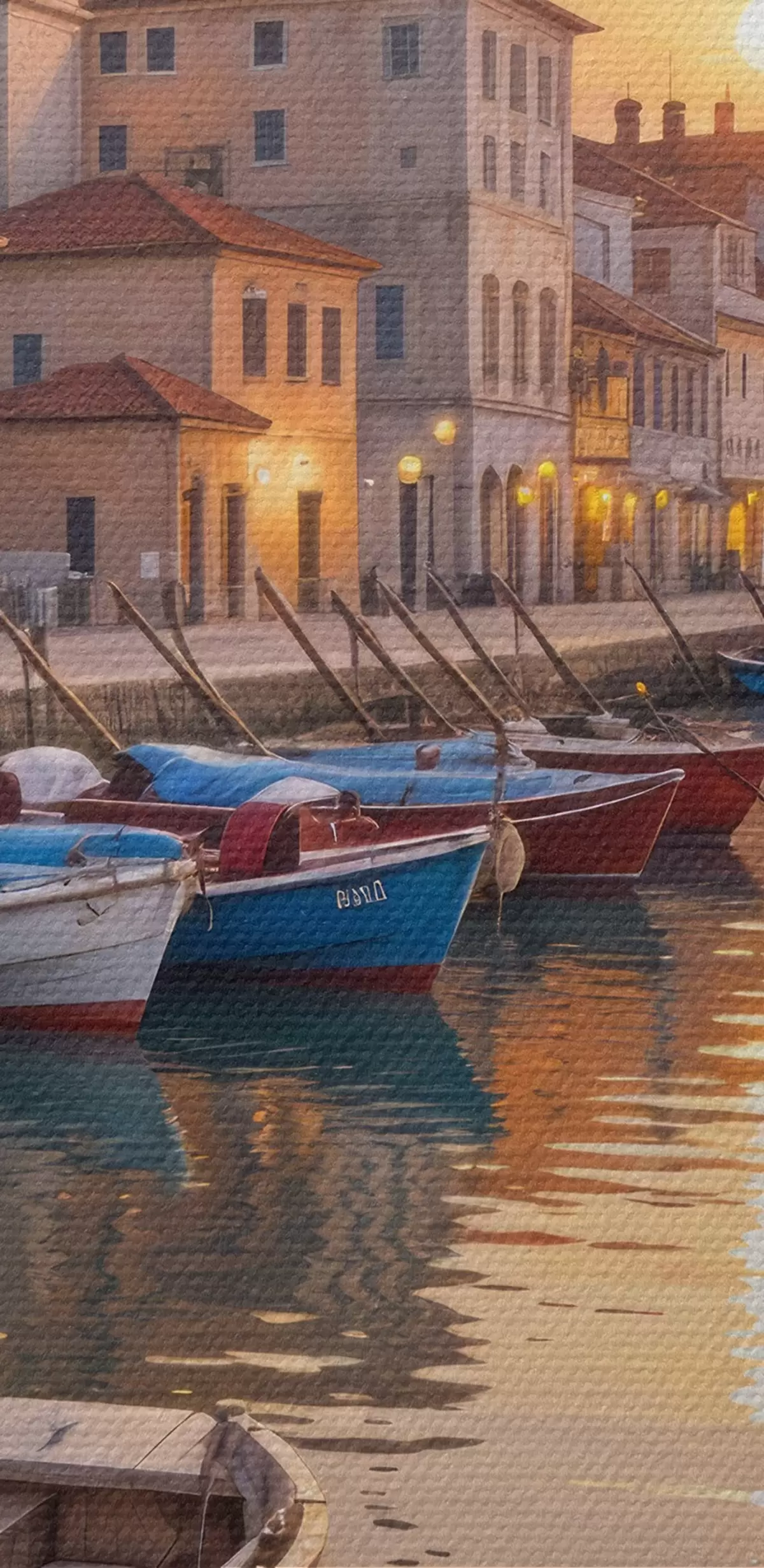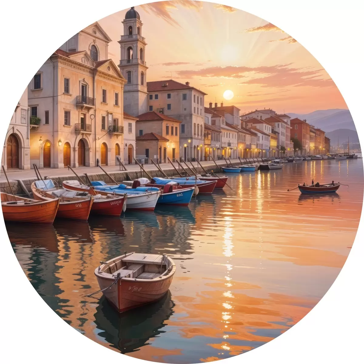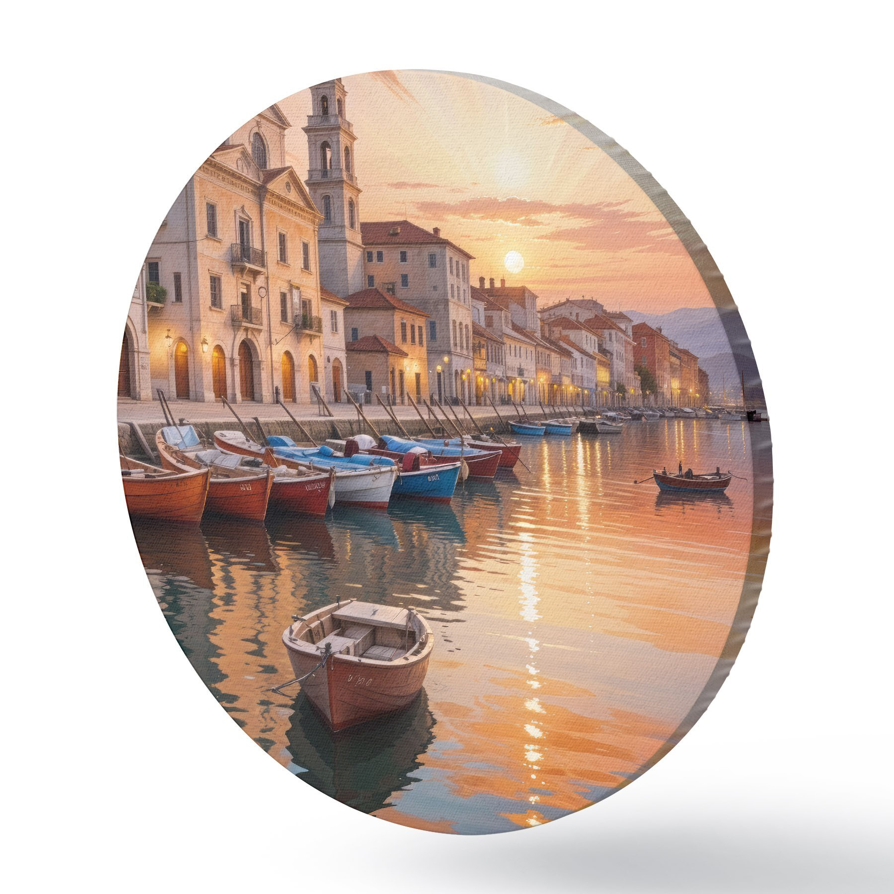 Apaļas gleznas Itālijas piekrastes pilsēta saulrietā ar krāsainām ēkām krastmalā un laivām, kas peld mierīgos ūdeņos r40150