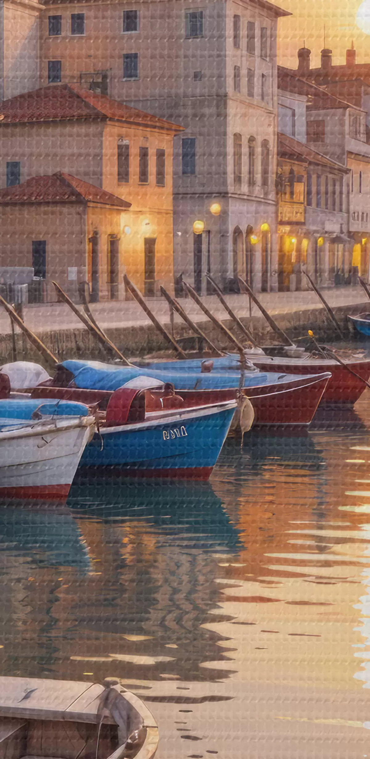 Attēls Itālijas piekrastes pilsēta saulrietā ar krāsainām ēkām krastmalā un laivām, kas peld mierīgos ūdeņos Nr r40150