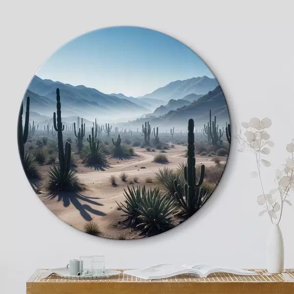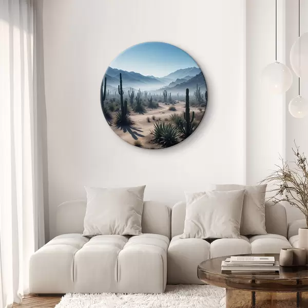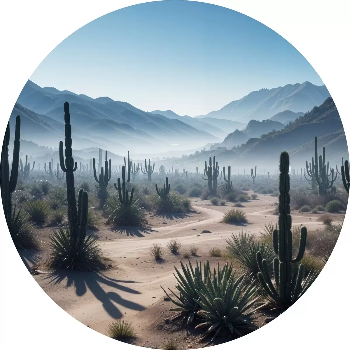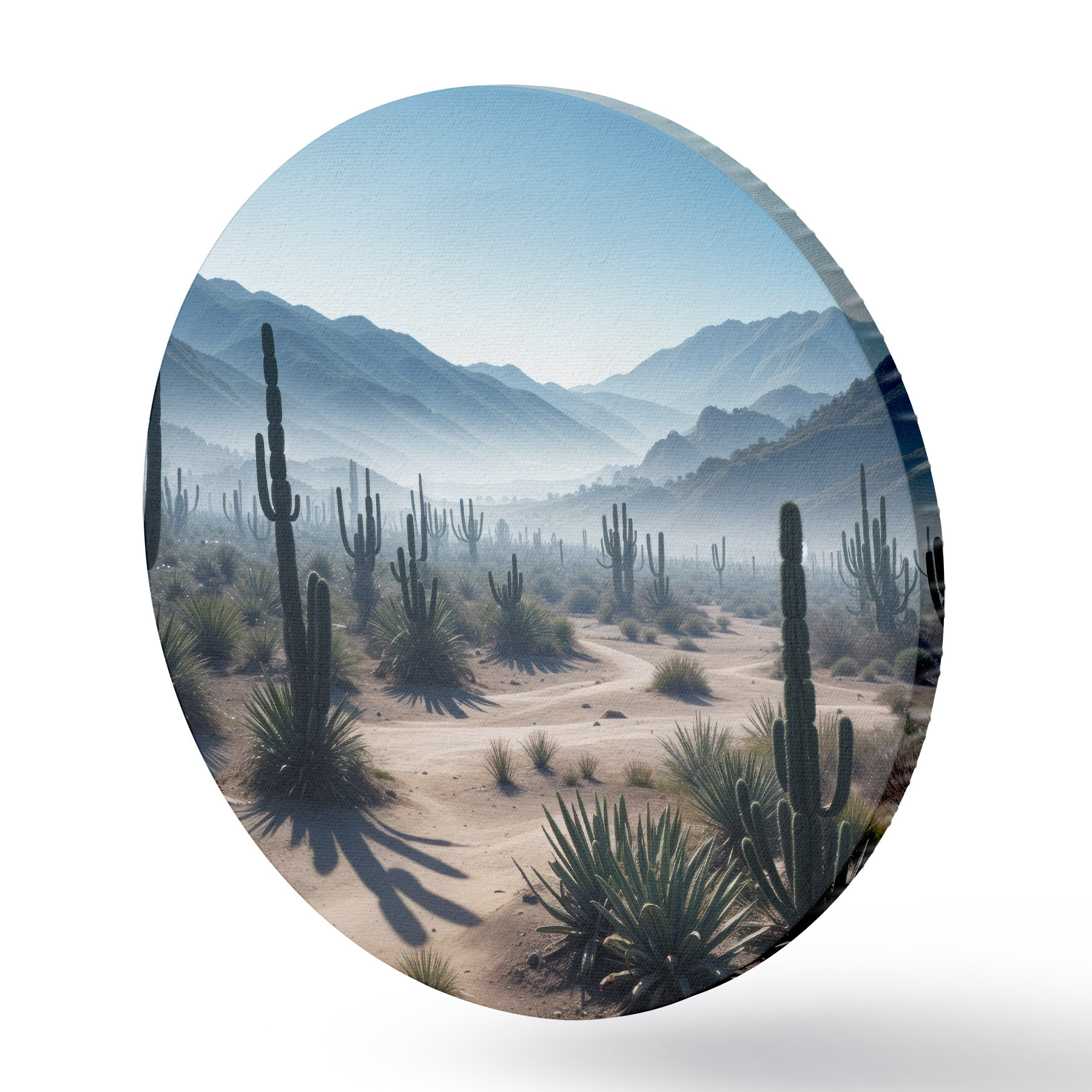 Apaļas gleznas Tuksneša ainava ar augstiem kaktusiem un jukas augiem priekšplānā, ko ieskauj miglaini kalni r40153