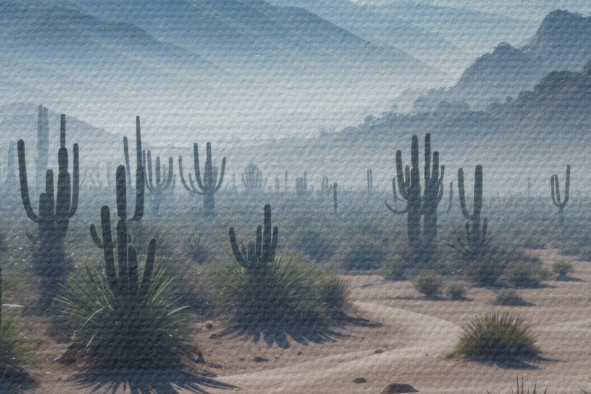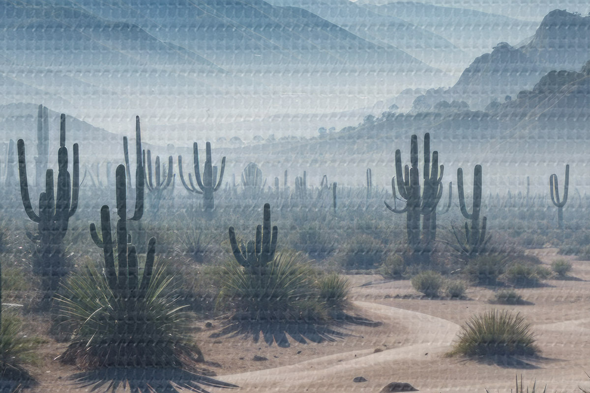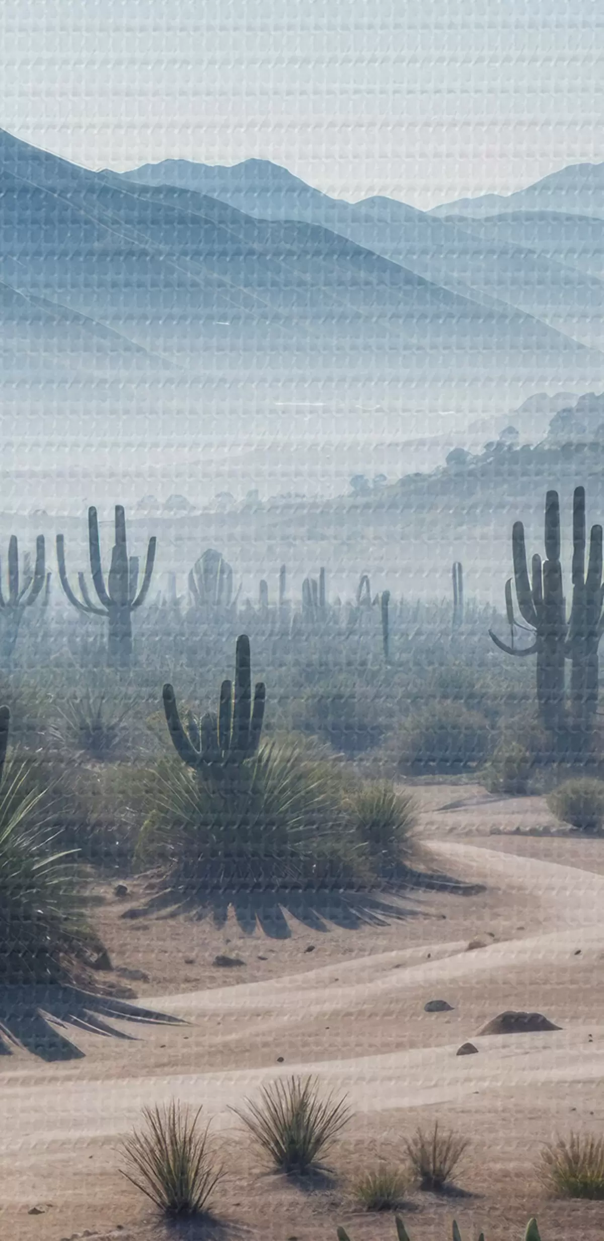Attēls Tuksneša ainava ar augstiem kaktusiem un jukas augiem priekšplānā, ko ieskauj miglaini kalni Nr r40153