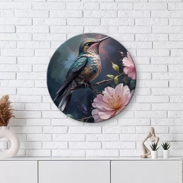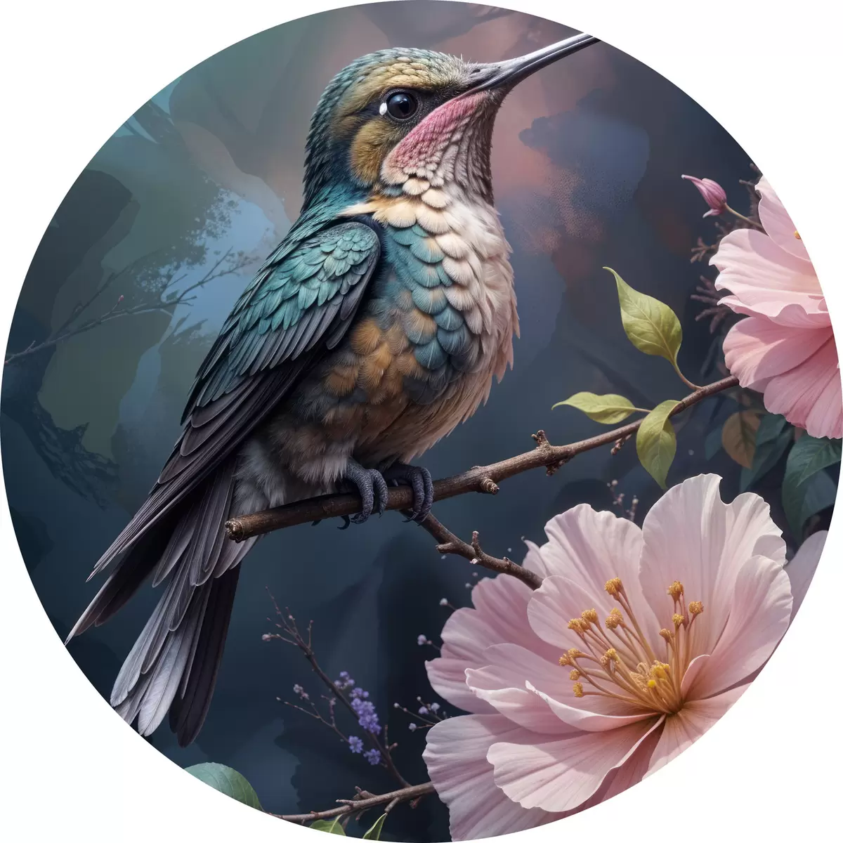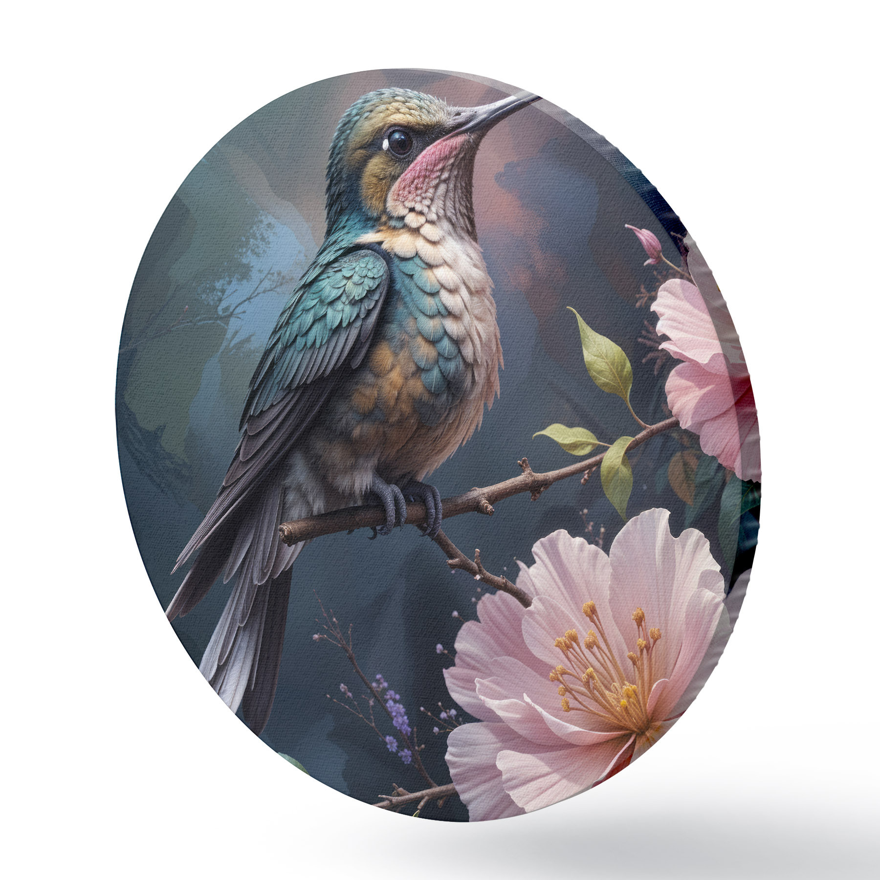Apaļas gleznas Krāsains kolibri, kas uzsēdies uz zara ar koši rozā ziediem fonā r40155