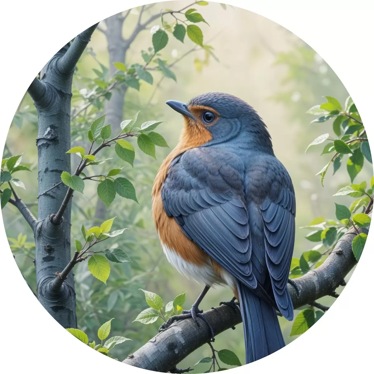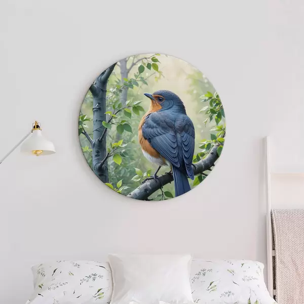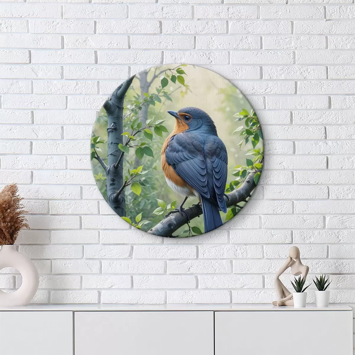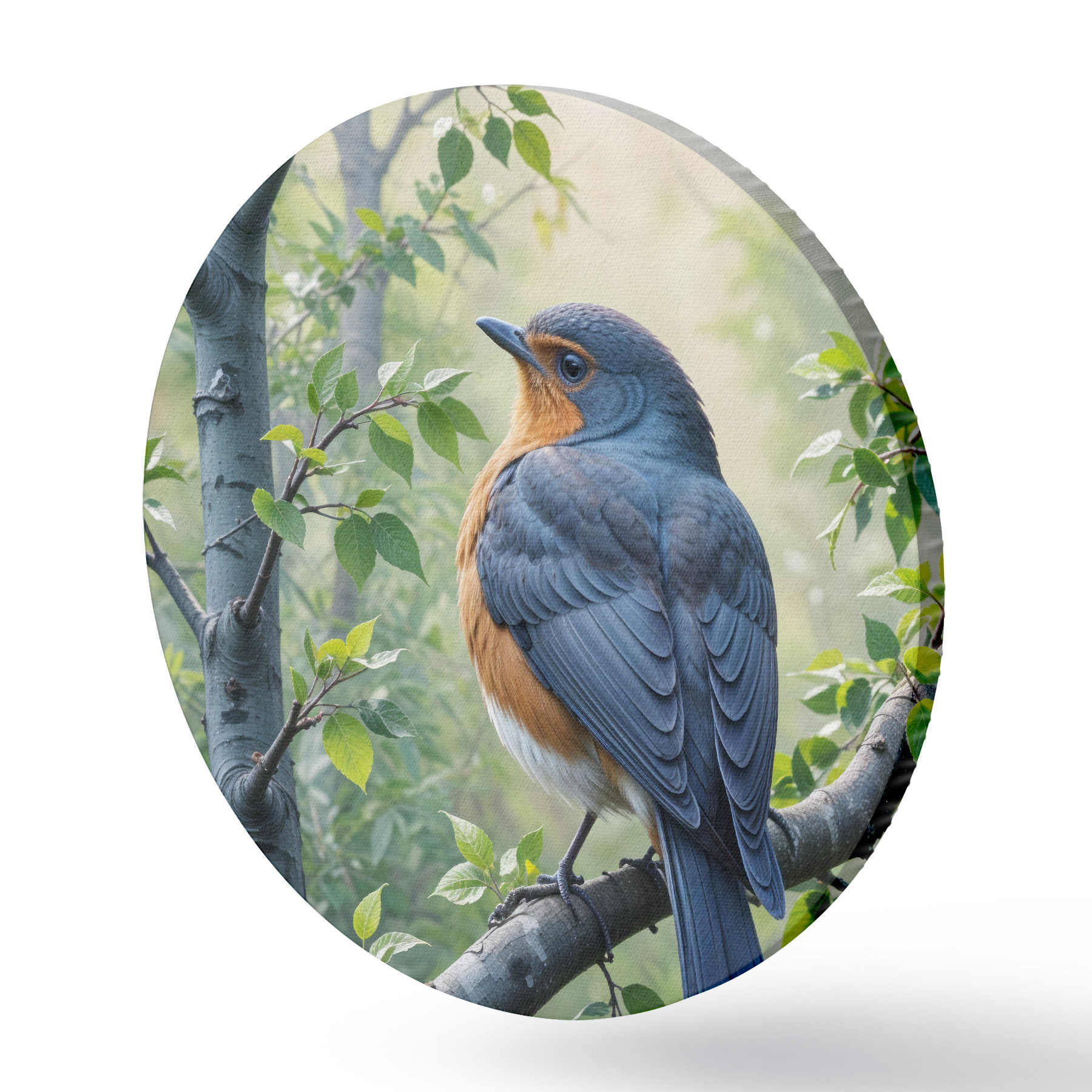 Apaļas gleznas Divi zili un oranži putni, kas sēdēja uz koka zara ar zaļām lapām fonā r40156