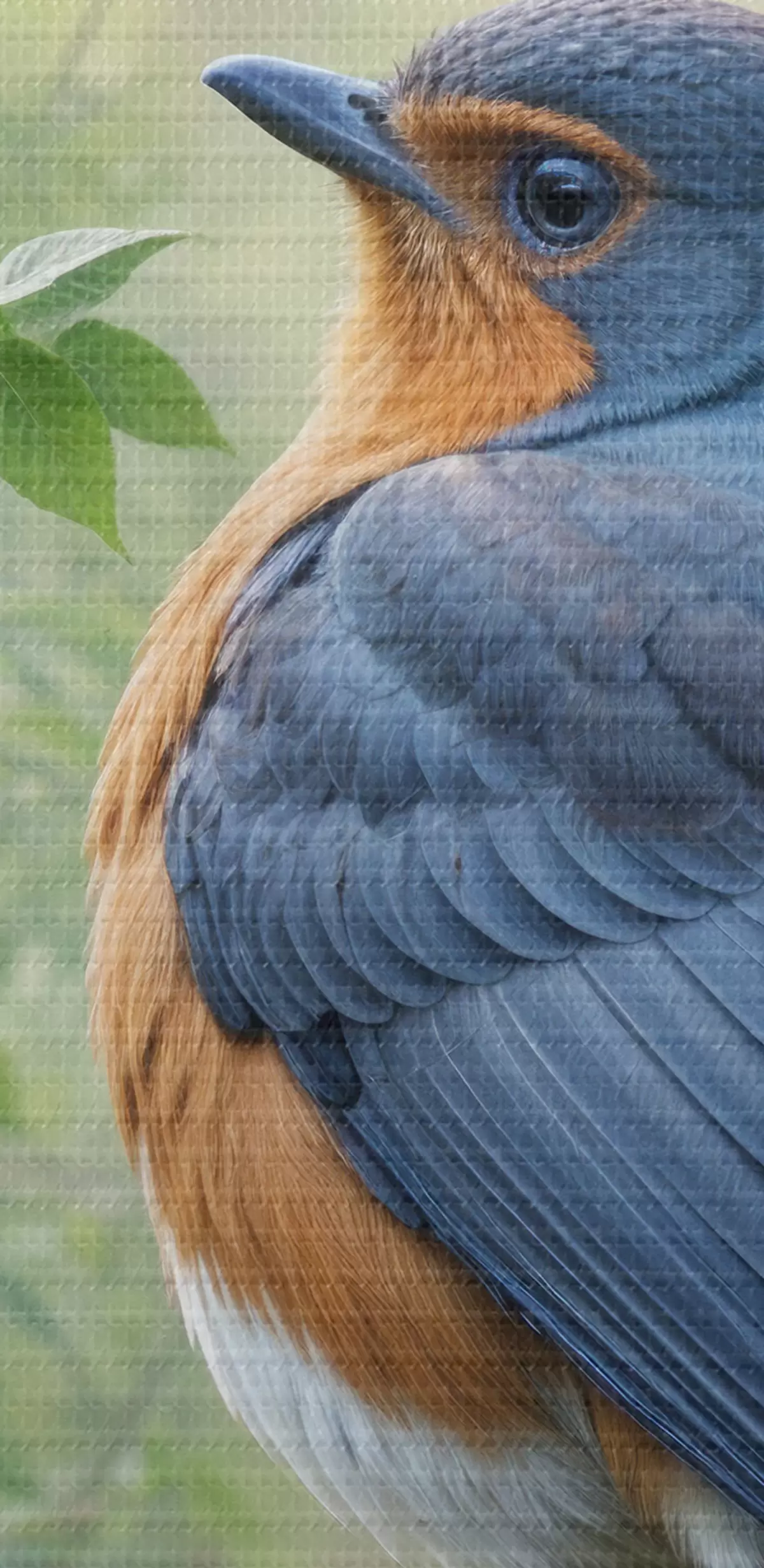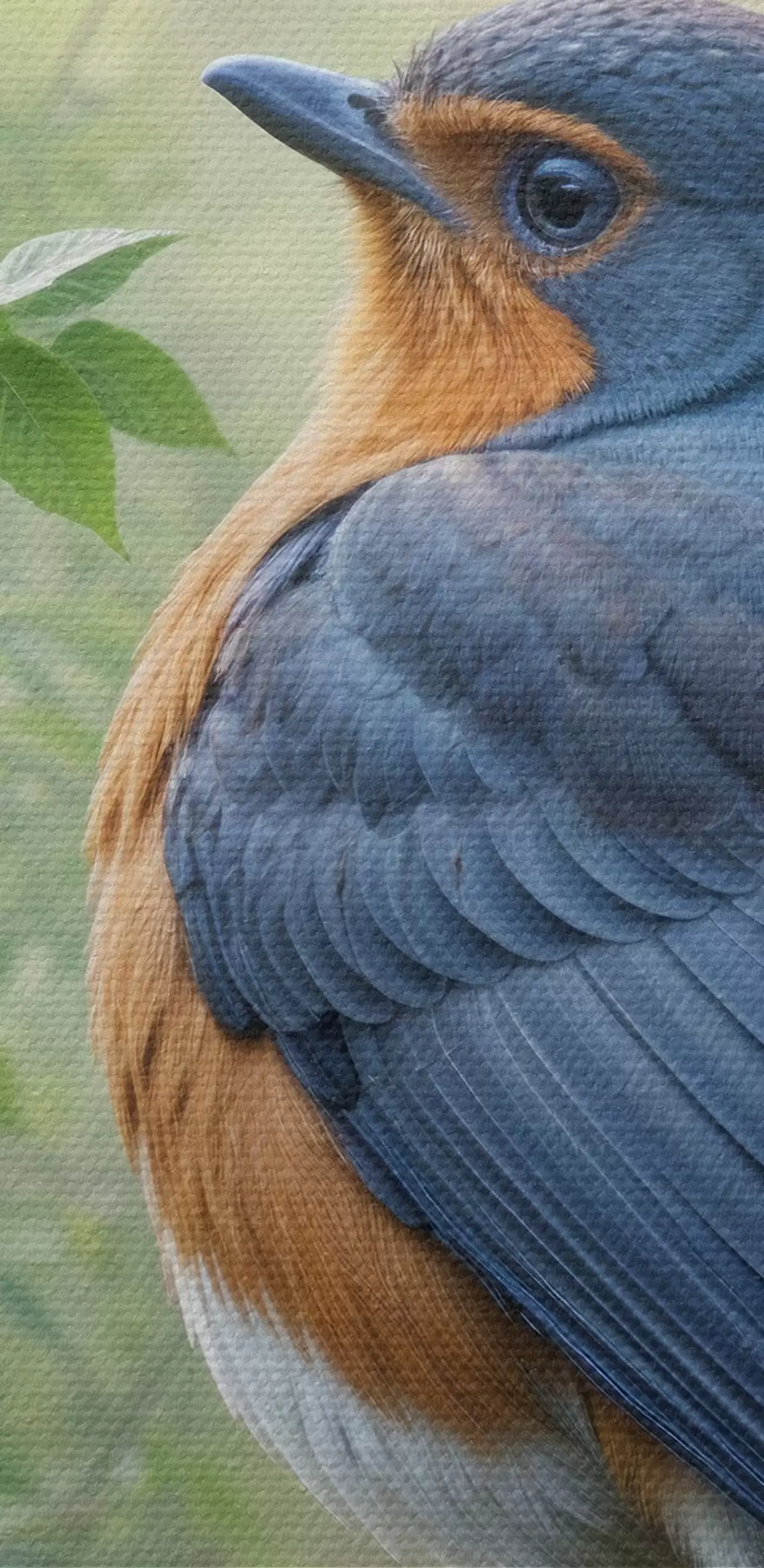 Attēls Divi zili un oranži putni, kas sēdēja uz koka zara ar zaļām lapām fonā Nr r40156