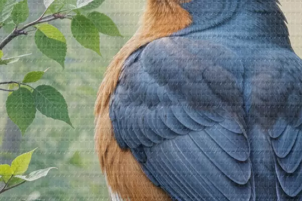 Attēls Divi zili un oranži putni, kas sēdēja uz koka zara ar zaļām lapām fonā Nr r40156