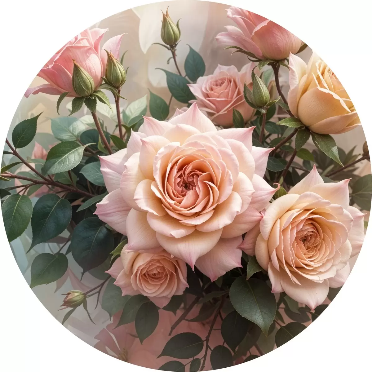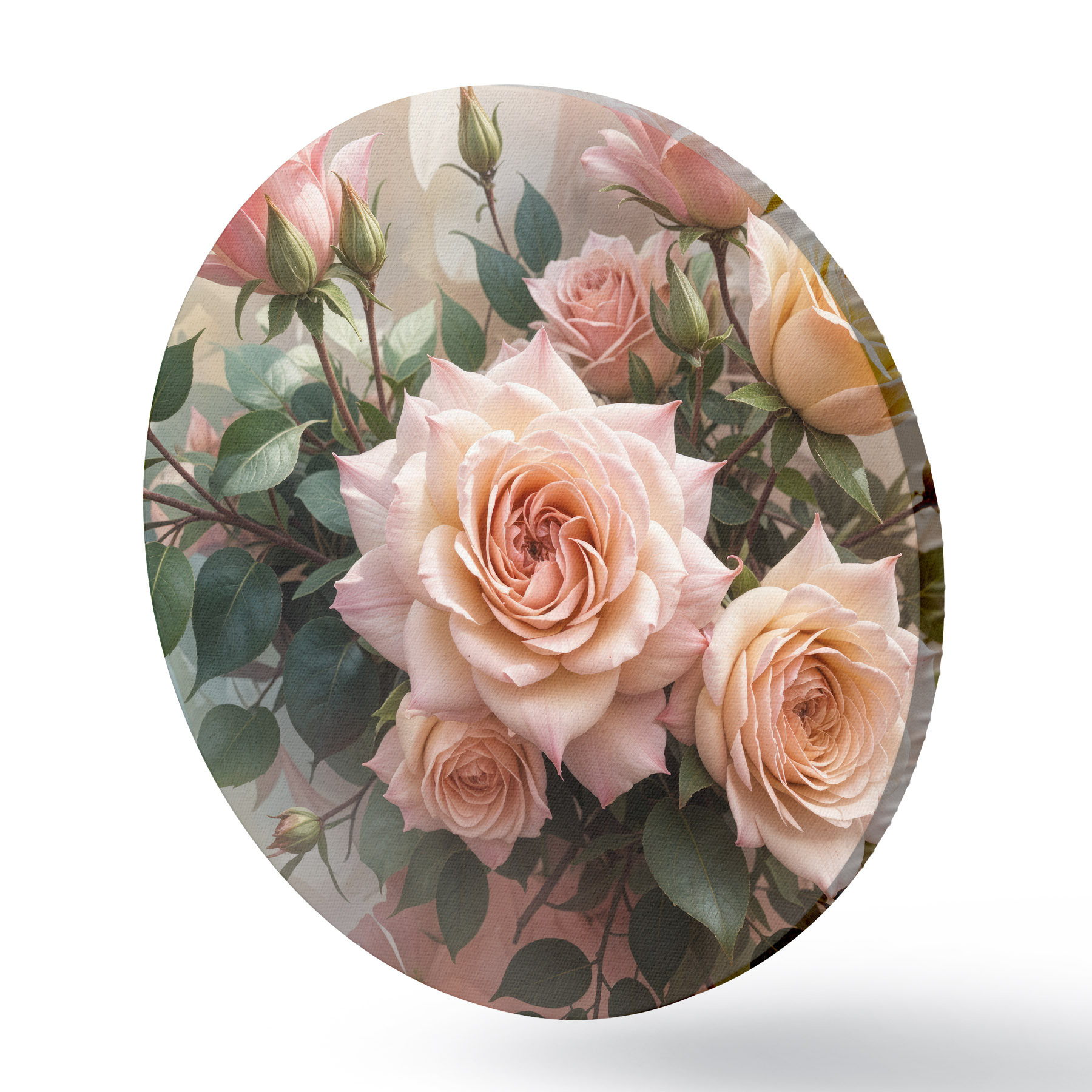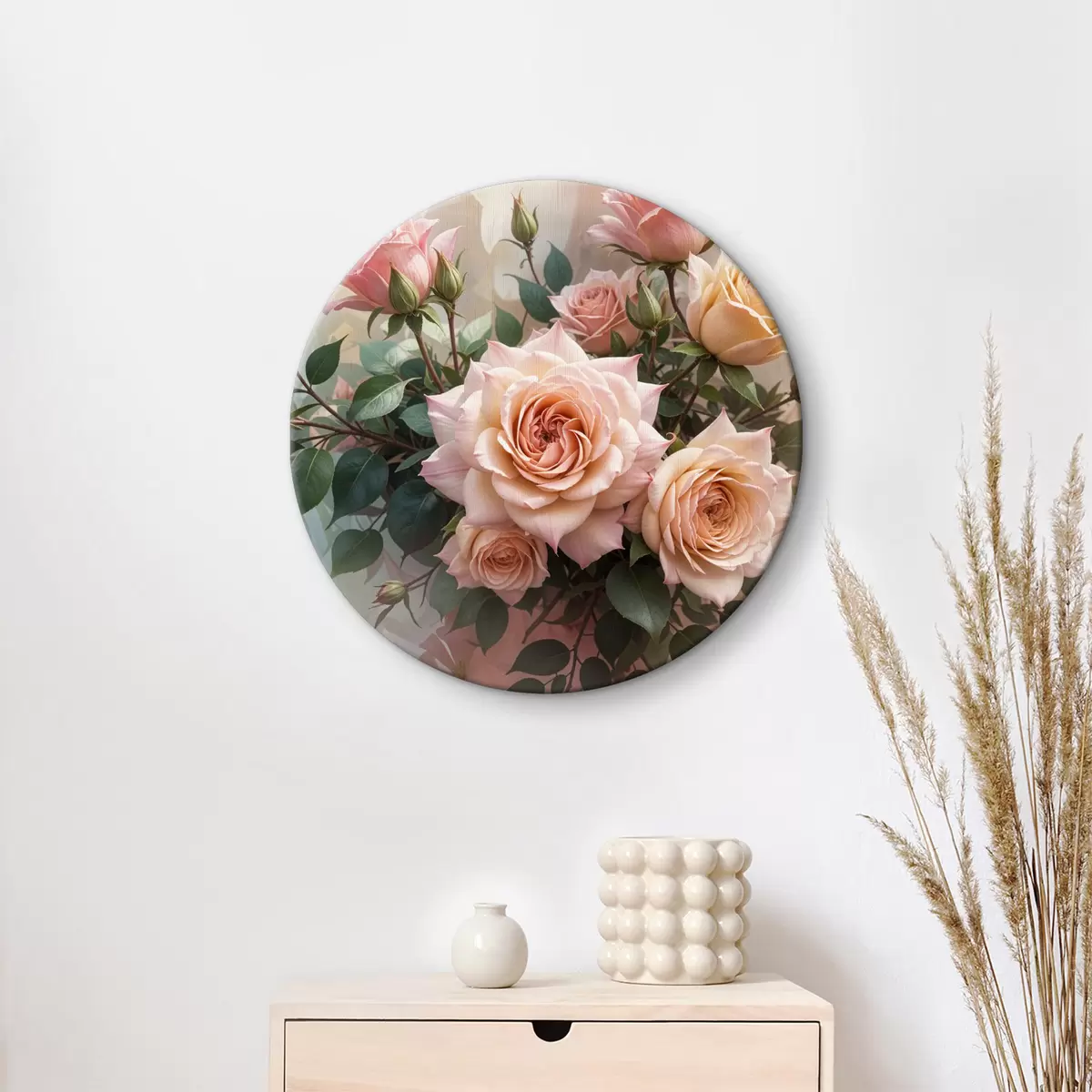 Apaļas gleznas Skaistu rozā rožu pušķis ar zaļām lapām uz maiga, izplūduša fona r40168