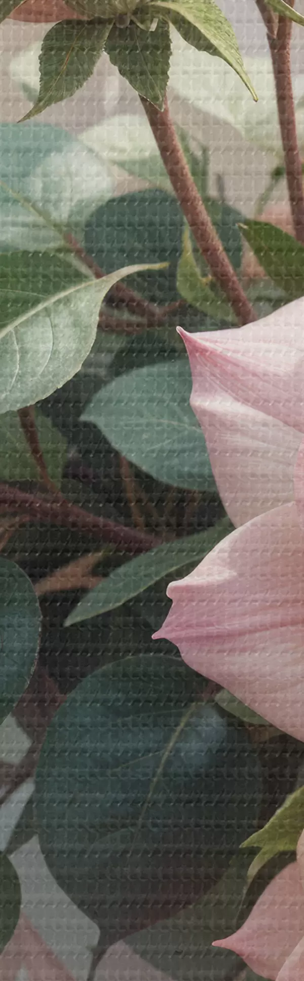 Attēls Skaistu rozā rožu pušķis ar zaļām lapām uz maiga, izplūduša fona Nr r40168