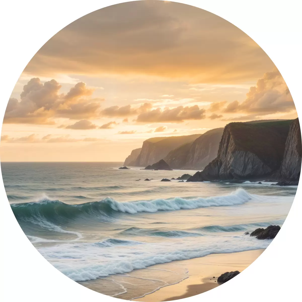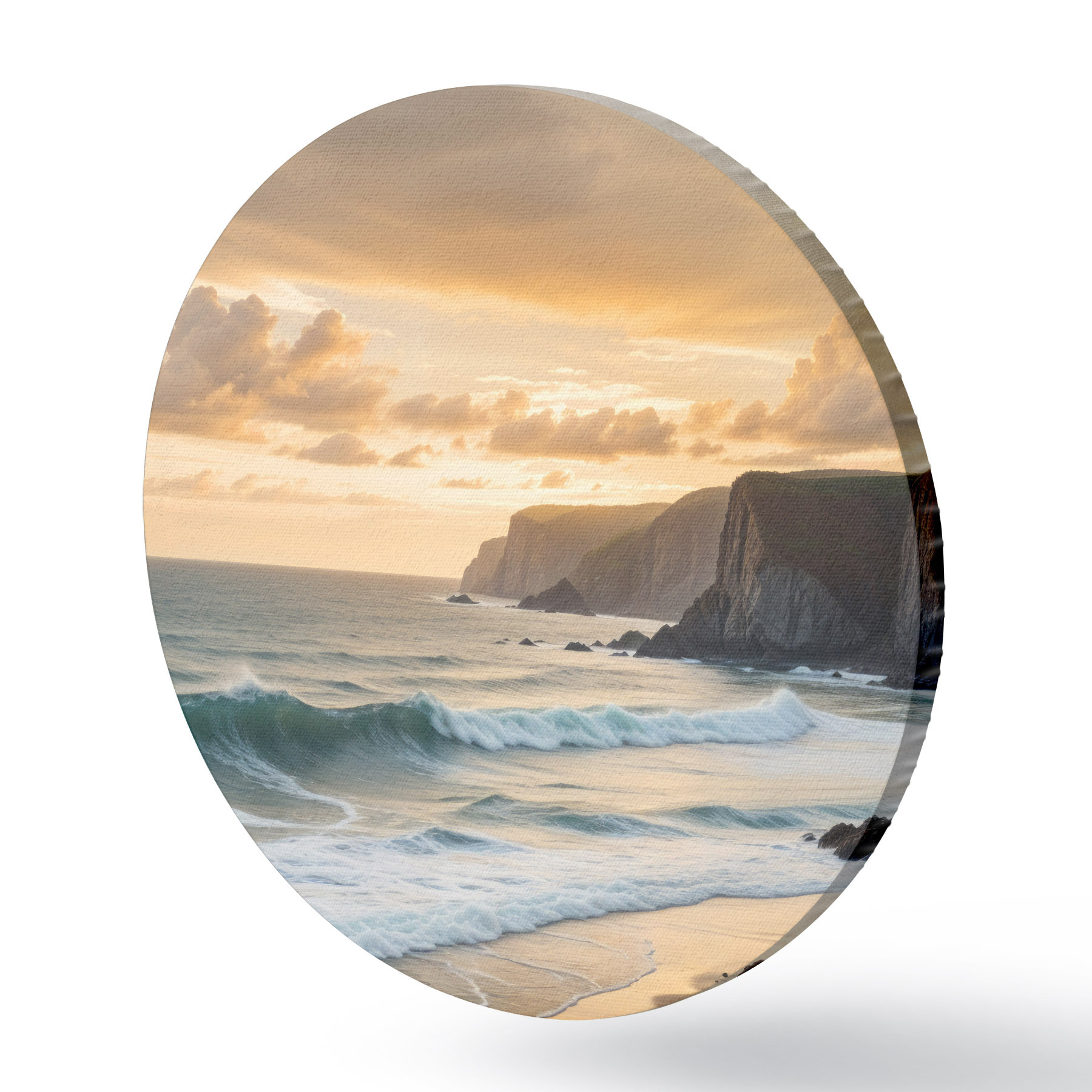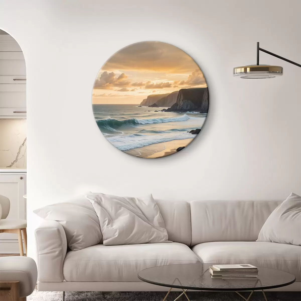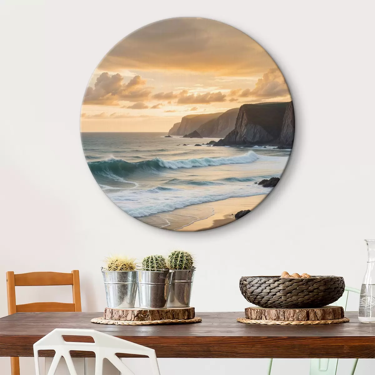 Apaļas gleznas Gleznaina piekrastes ainava ar iespaidīgām klintīm, viļņiem un krāsainām saulrieta debesīm r40176