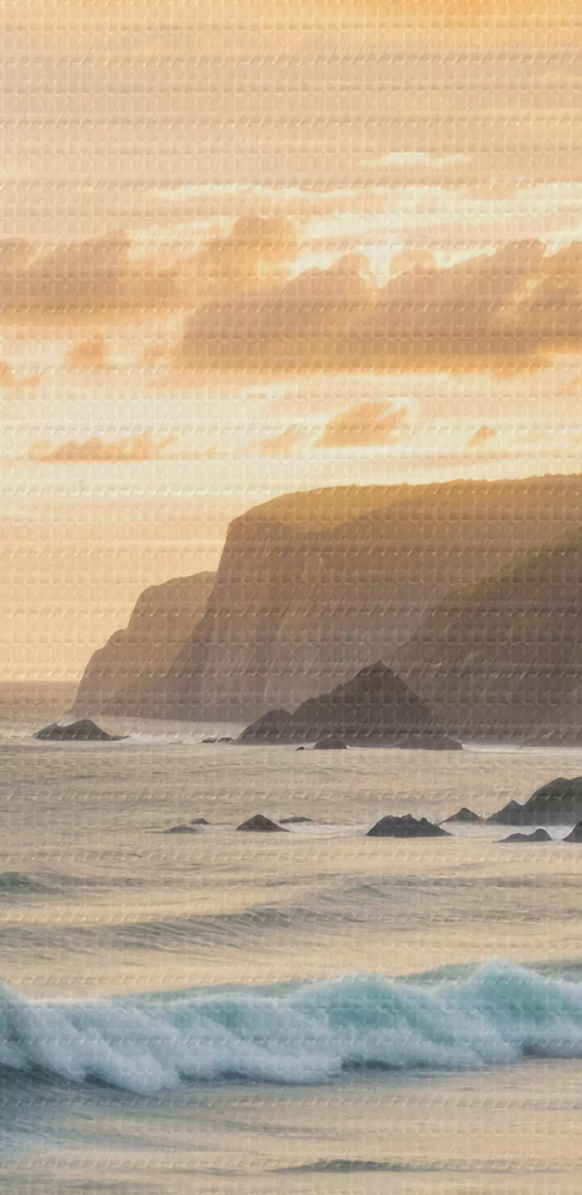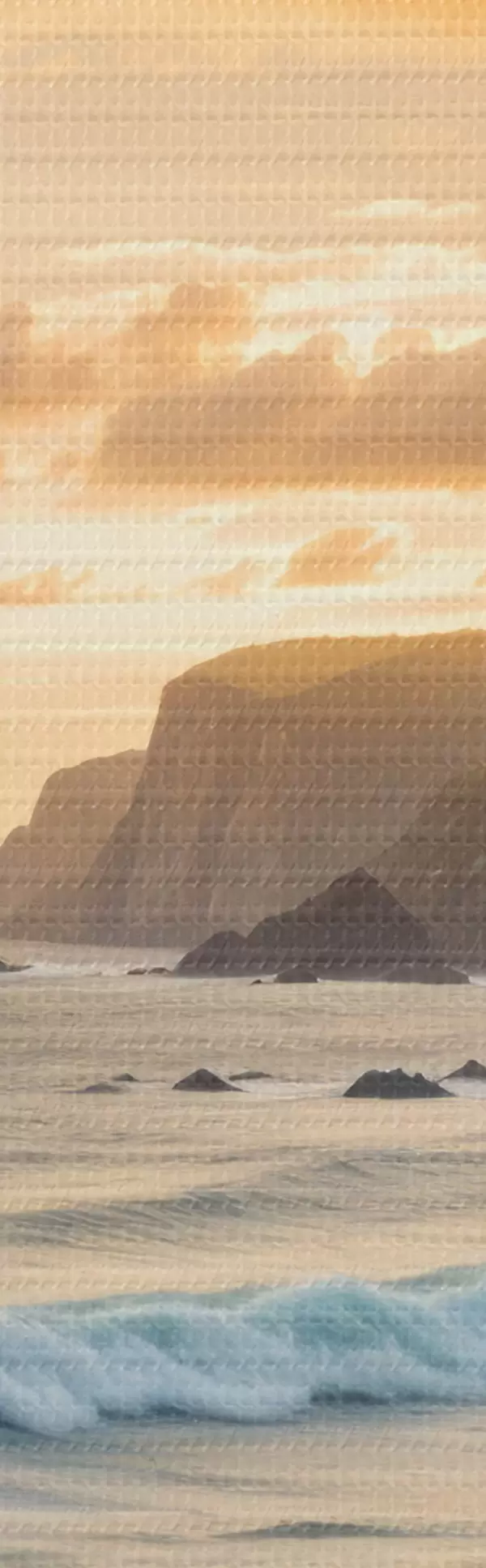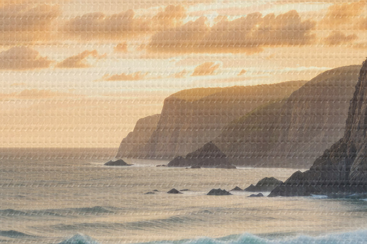 Attēls Gleznaina piekrastes ainava ar iespaidīgām klintīm, viļņiem un krāsainām saulrieta debesīm Nr r40176