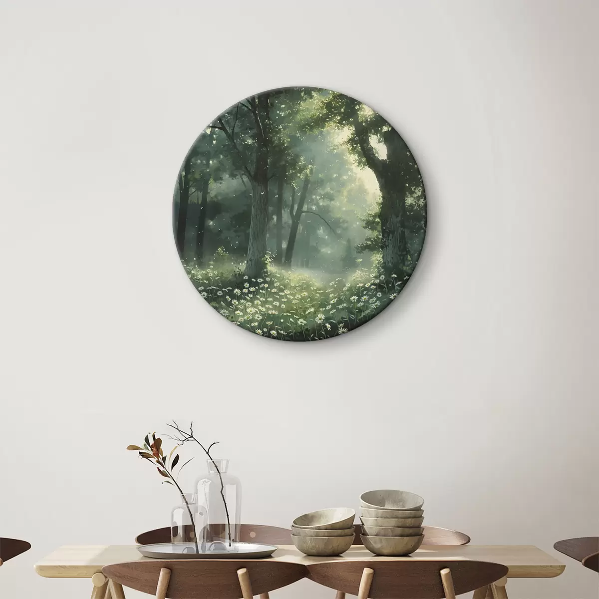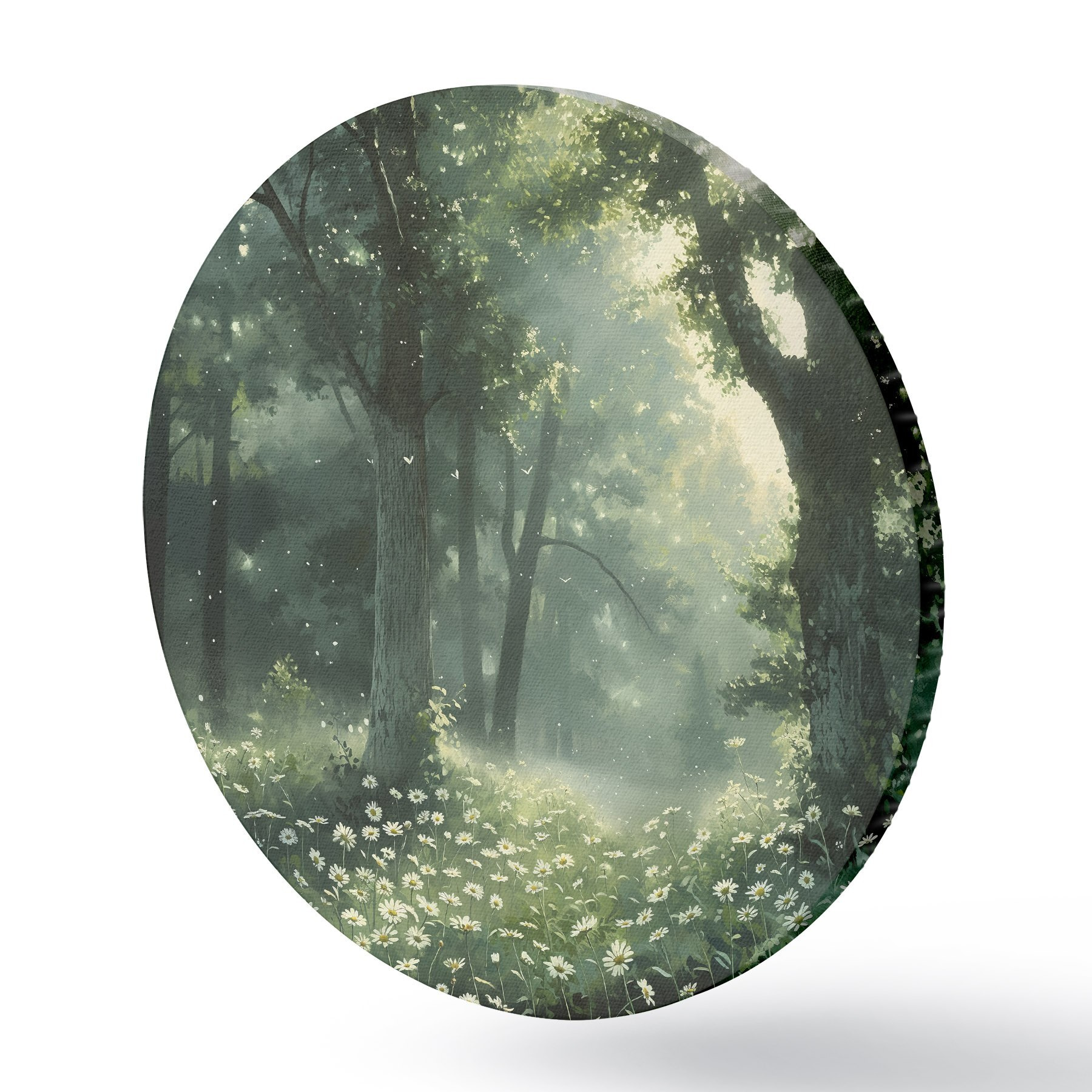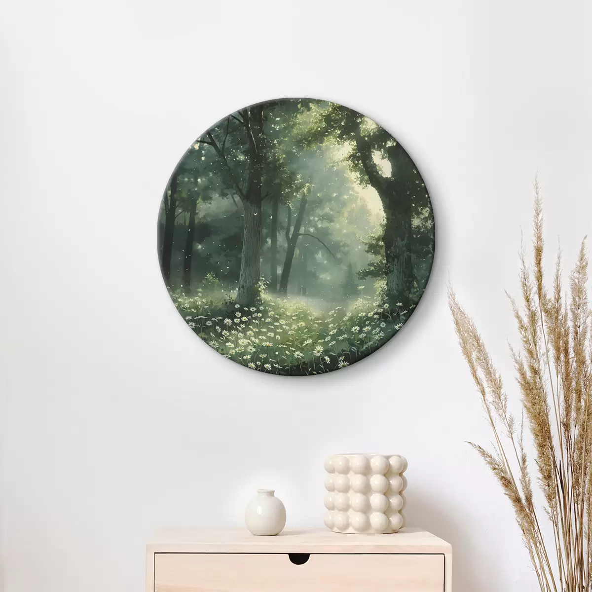 Apaļas gleznas Blīvs mežs ar saules gaismu kokos, kumelīšu ziedi, zaļa zāle, daba r40224