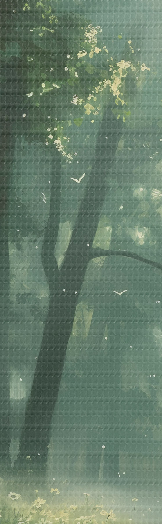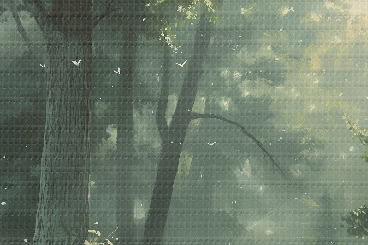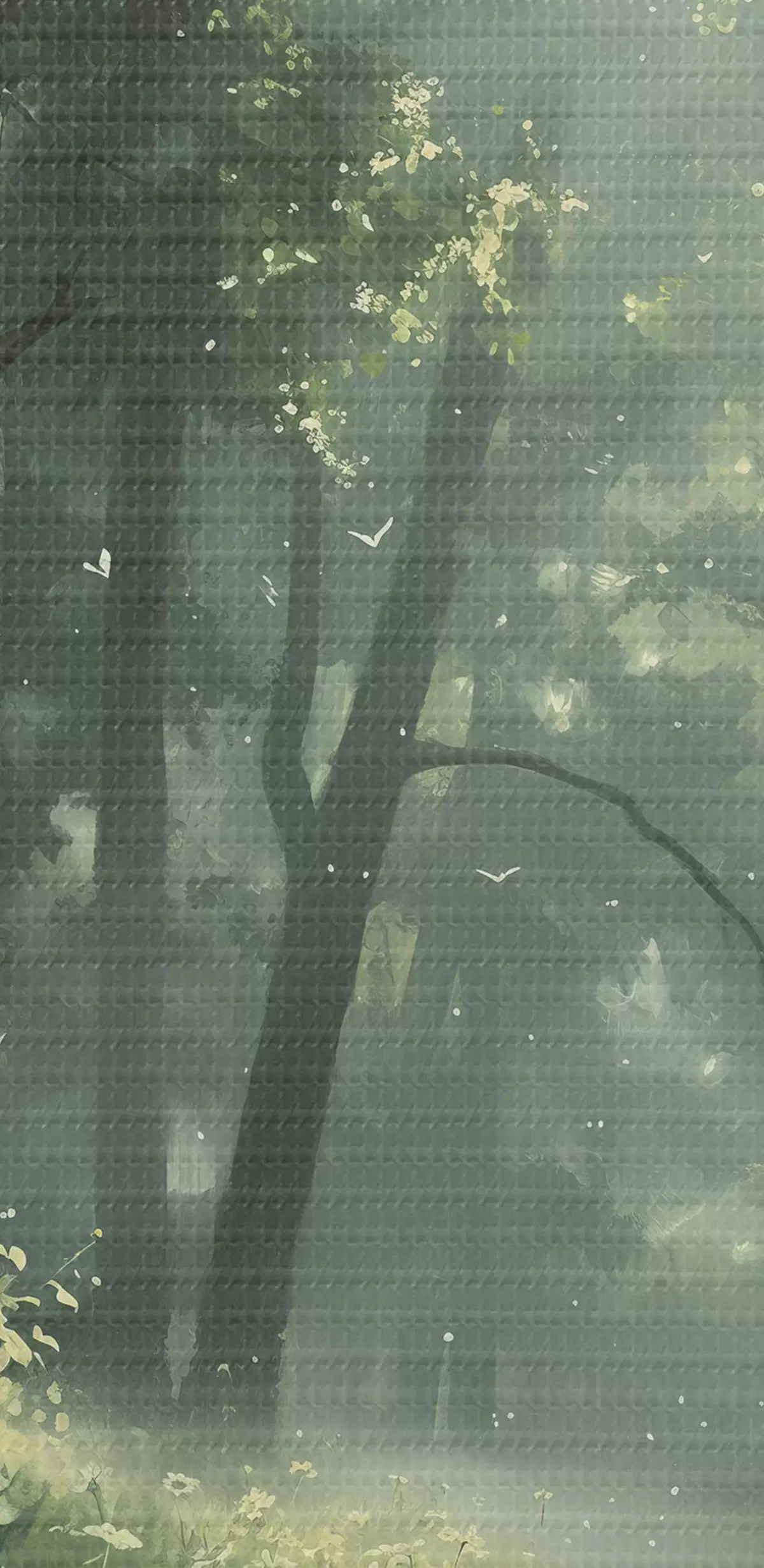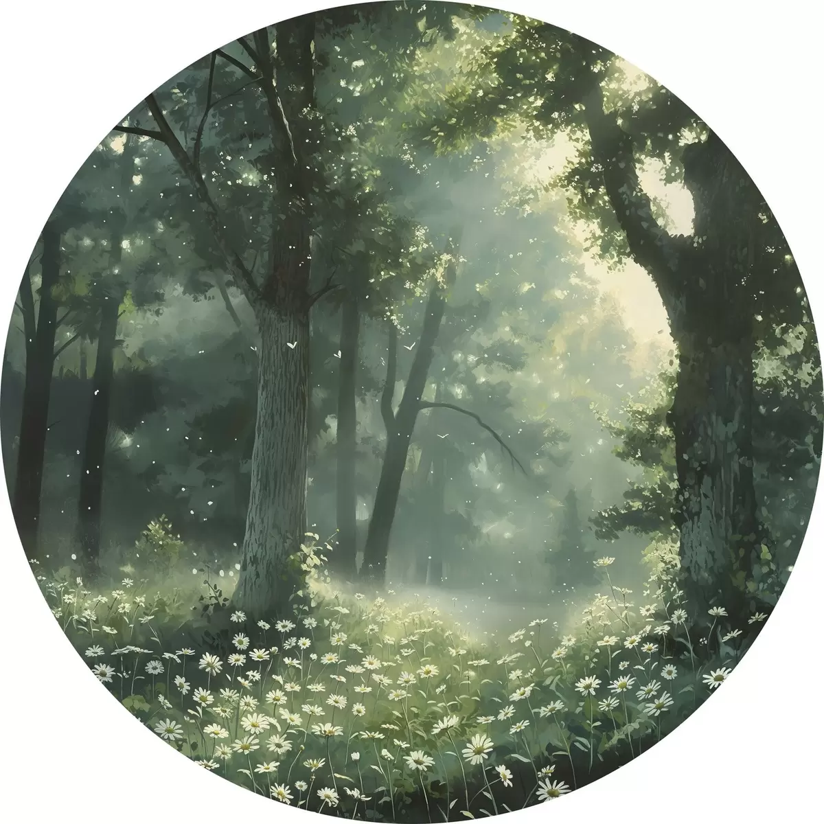 Apaļas gleznas Blīvs mežs ar saules gaismu kokos, kumelīšu ziedi, zaļa zāle, daba r40224