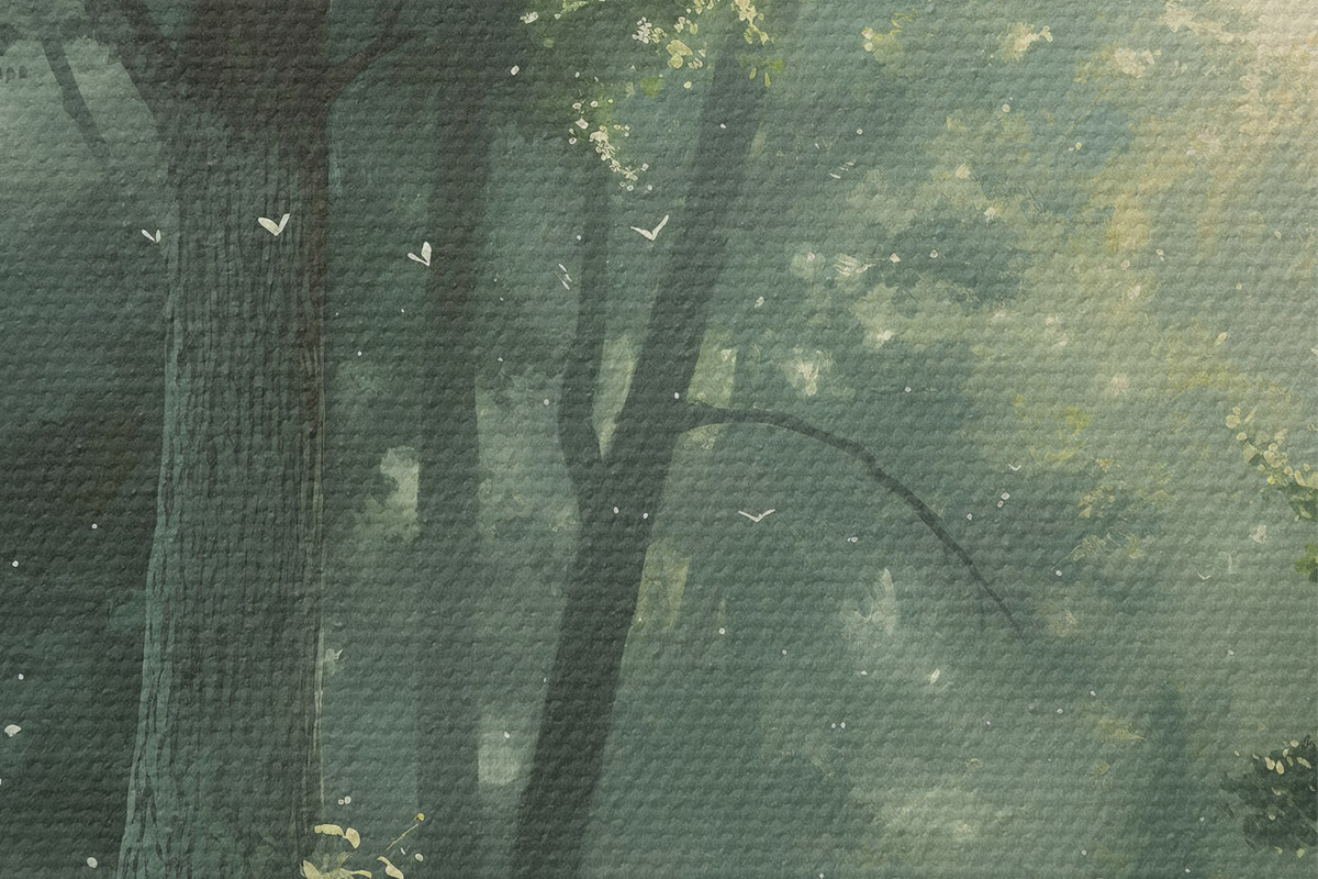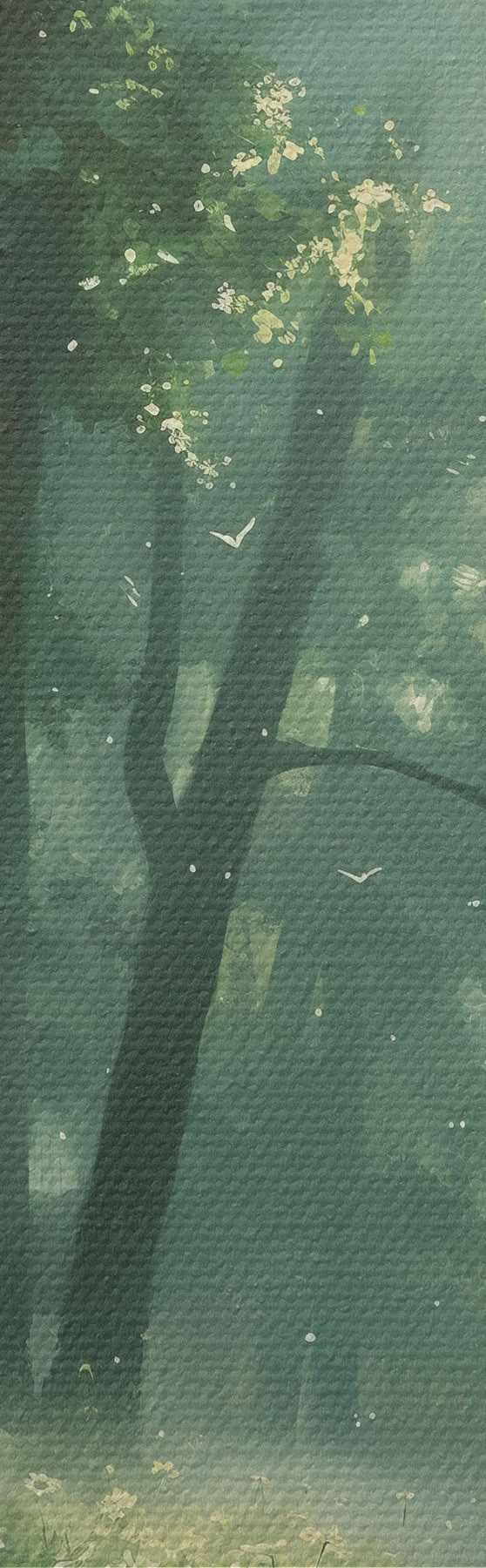 Attēls Blīvs mežs ar saules gaismu kokos, kumelīšu ziedi, zaļa zāle, daba Nr r40224