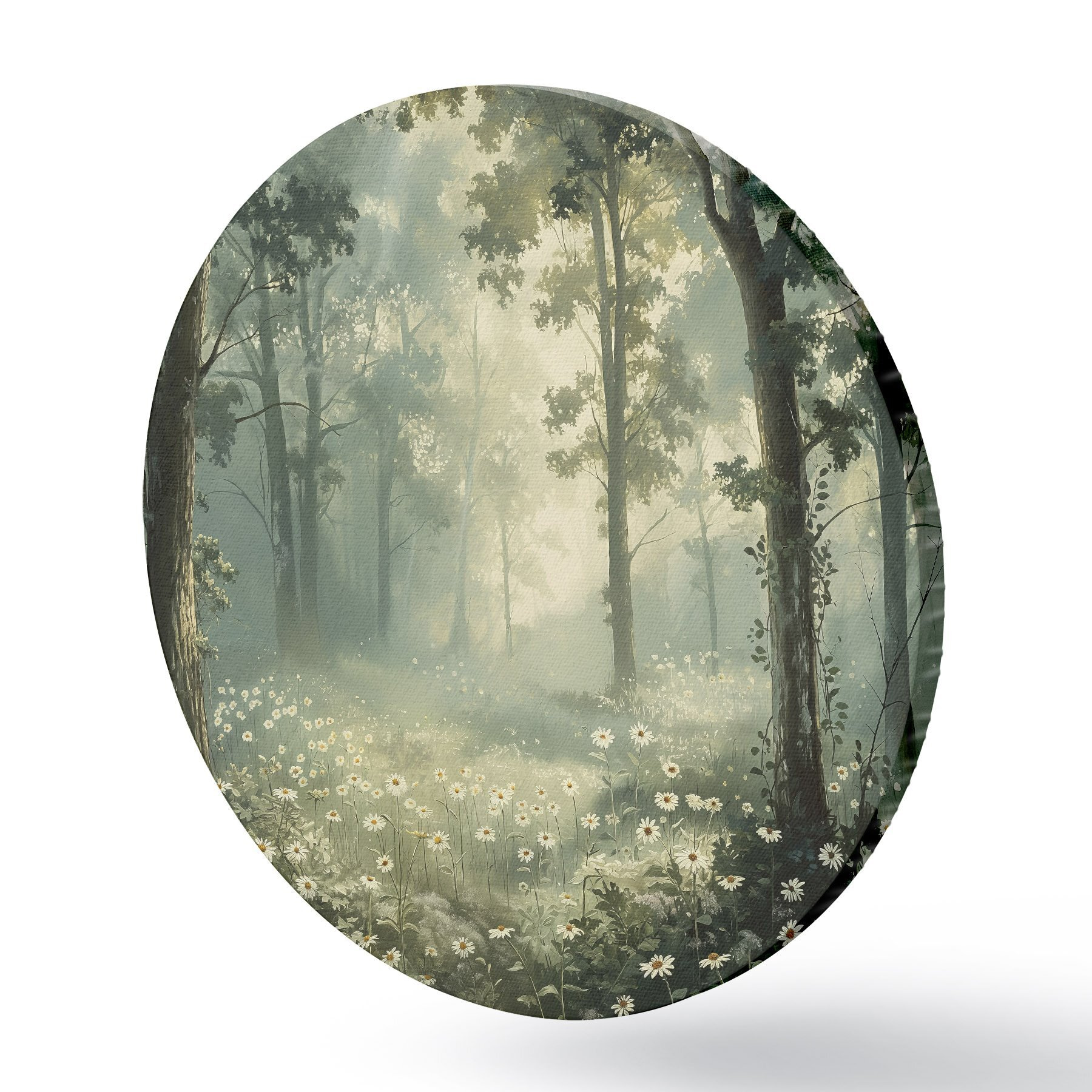 Apaļas gleznas Mežs ar maigu saules gaismu, kumelīšu ziedi, koki, zaļa zāle, akrila zīmējums r40228