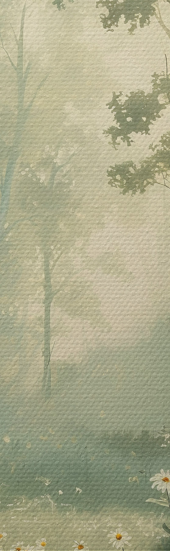 Attēls Mežs ar maigu saules gaismu, kumelīšu ziedi, koki, zaļa zāle, akrila zīmējums Nr r40228
