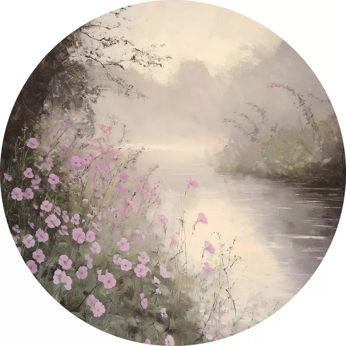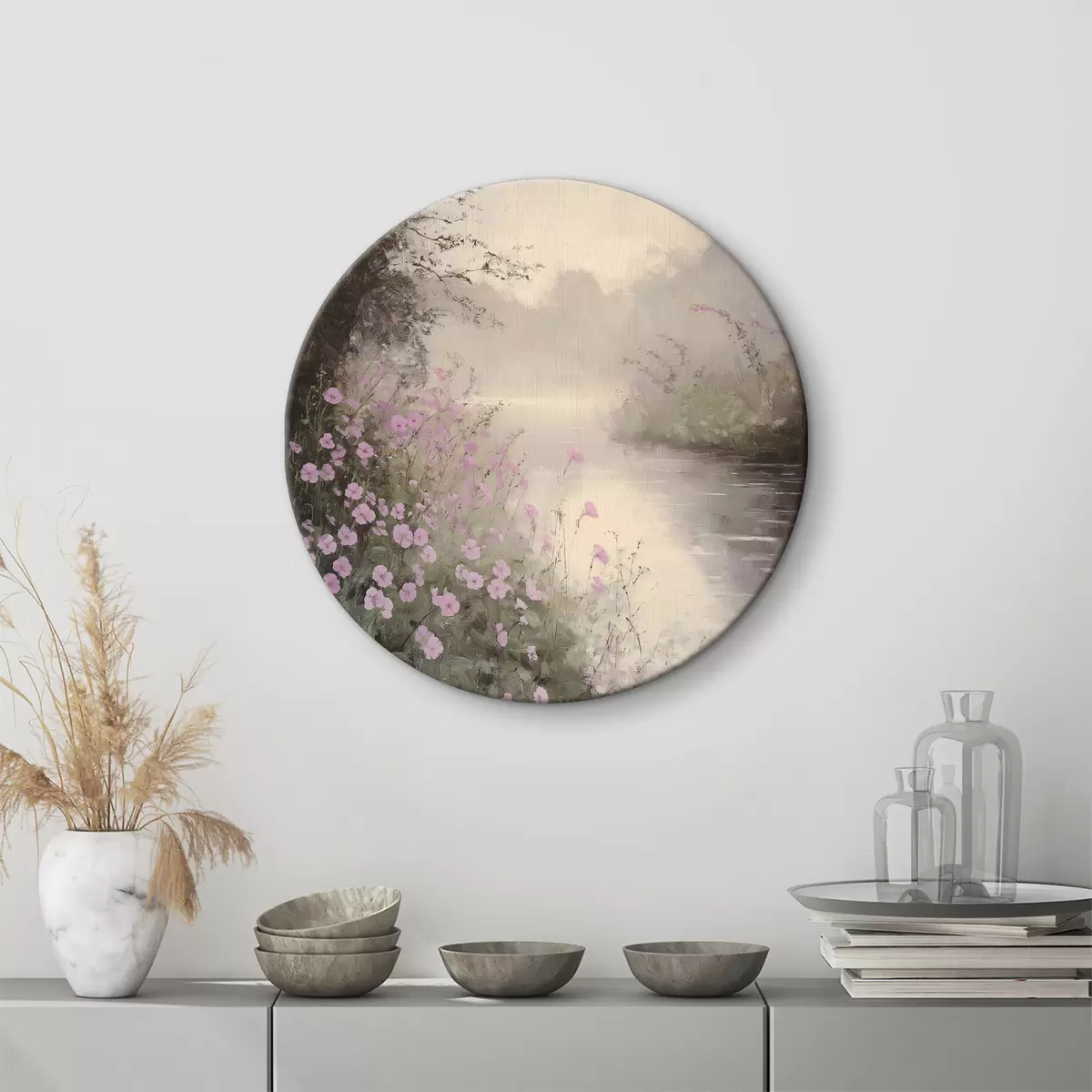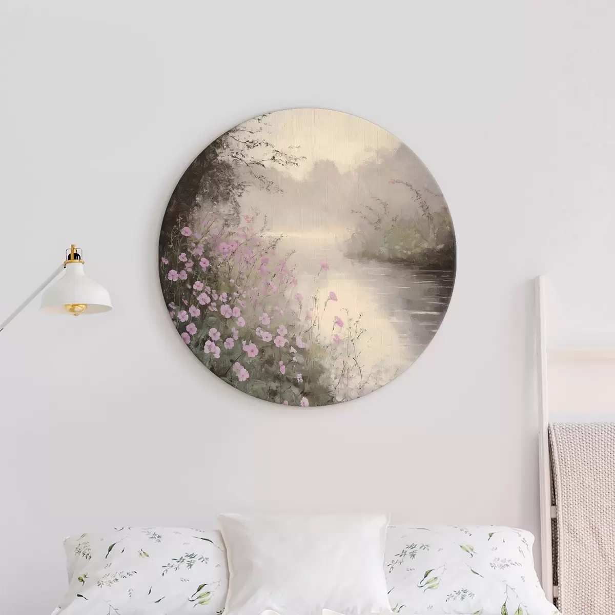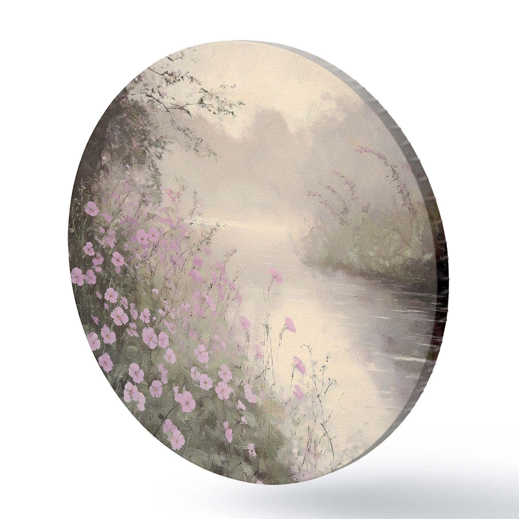 Apaļas gleznas Ezers ar rozā ziediem, saullēkts, eļļas zīmējums, pasteļbēšas krāsas, migla r40229