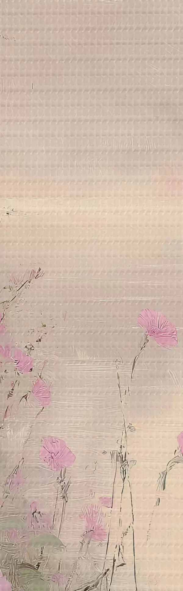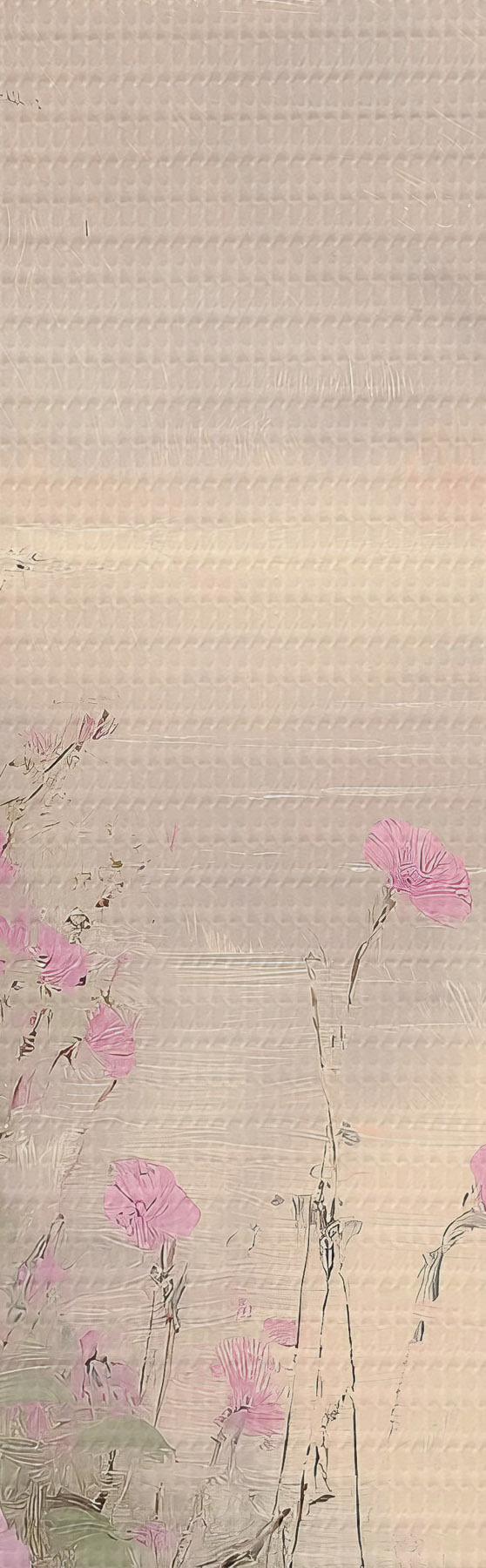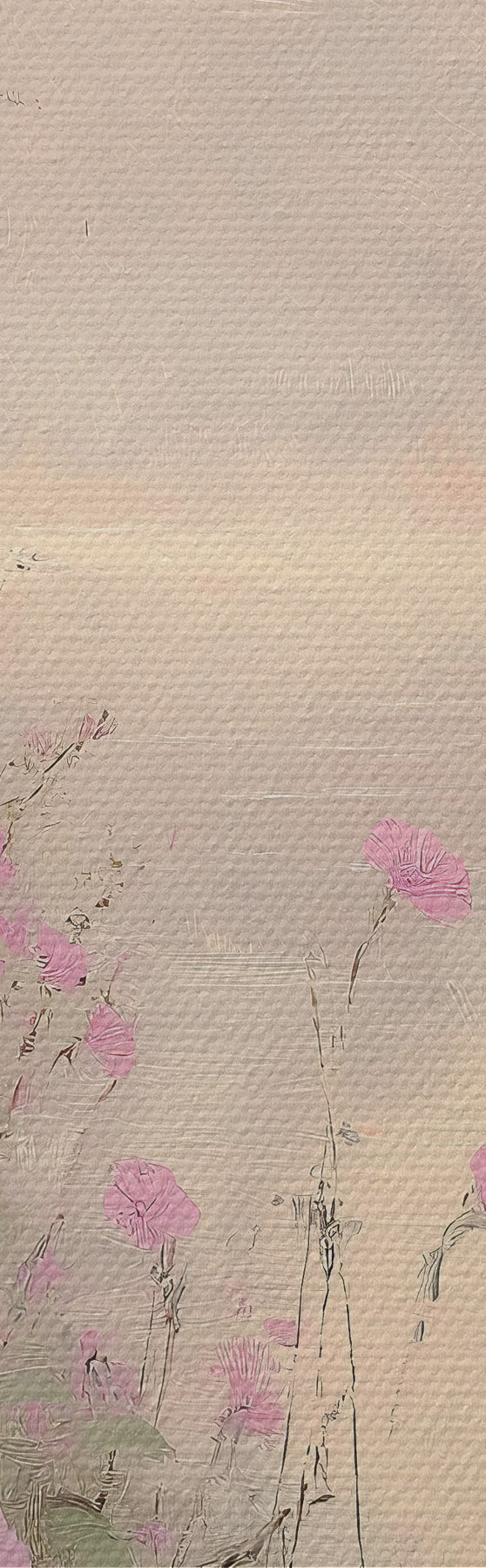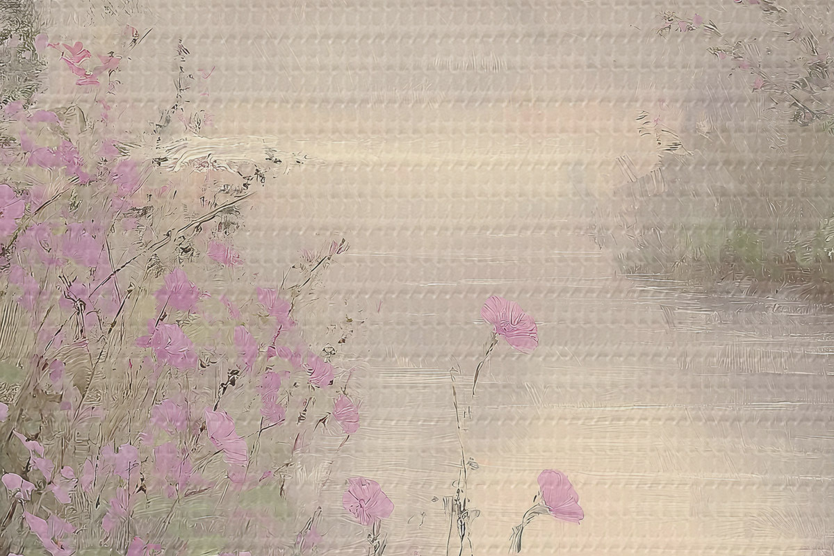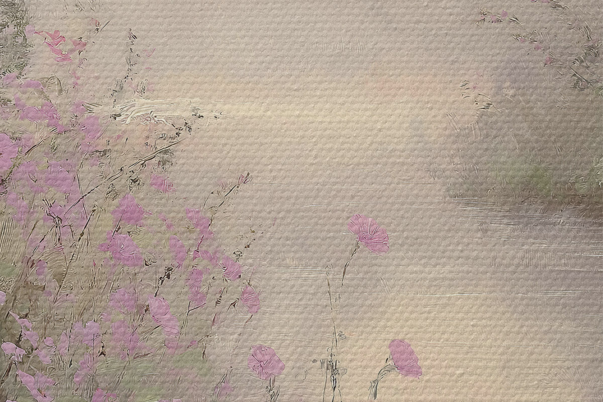 Attēls Ezers ar rozā ziediem, saullēkts, eļļas zīmējums, pasteļbēšas krāsas, migla Nr r40229