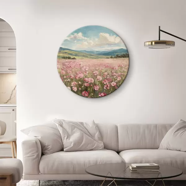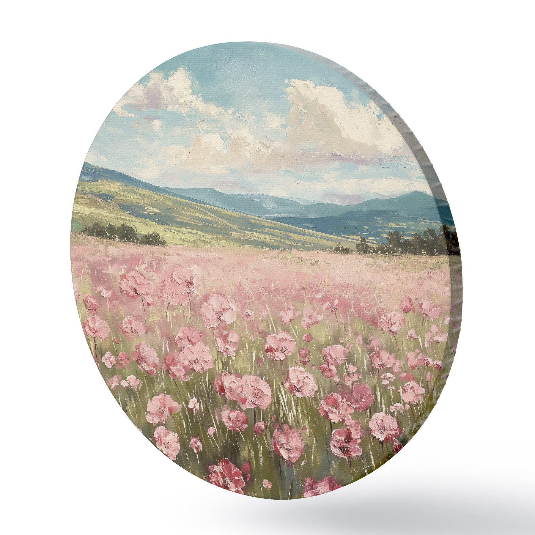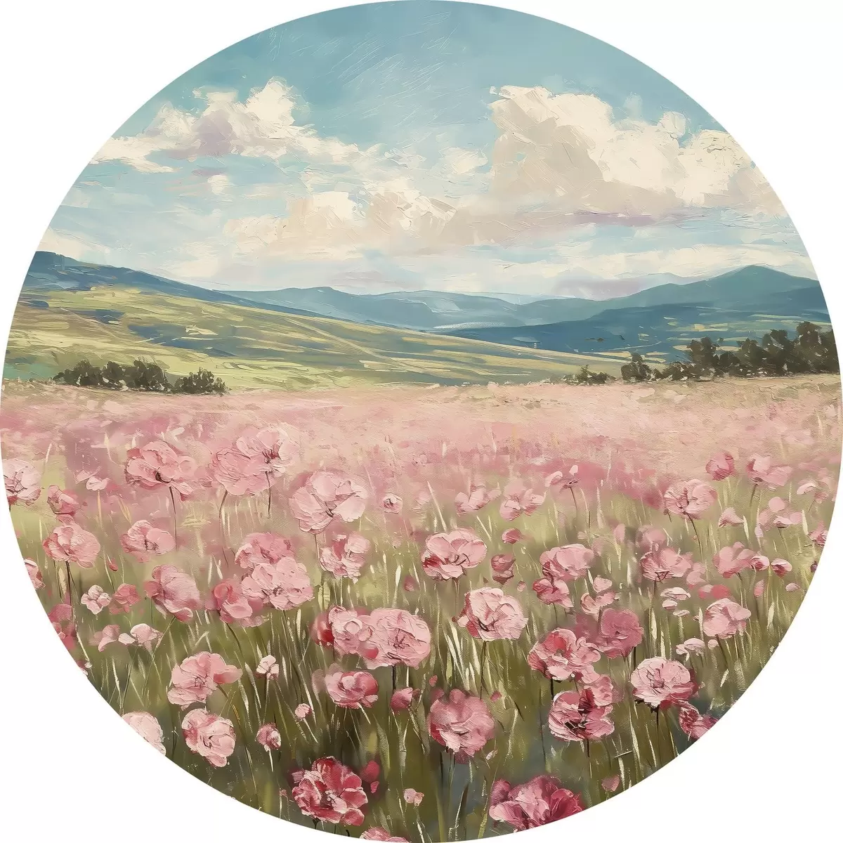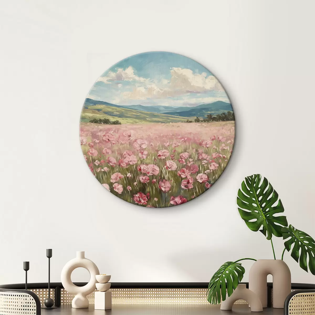 Apaļas gleznas Pļava ar rozā ziediem, kalni, dabas ainava, zilas debesis ar mākoņiem, akrils r40232