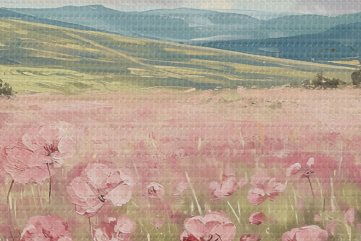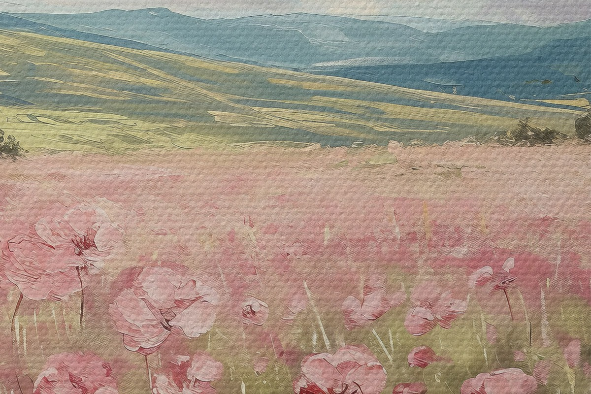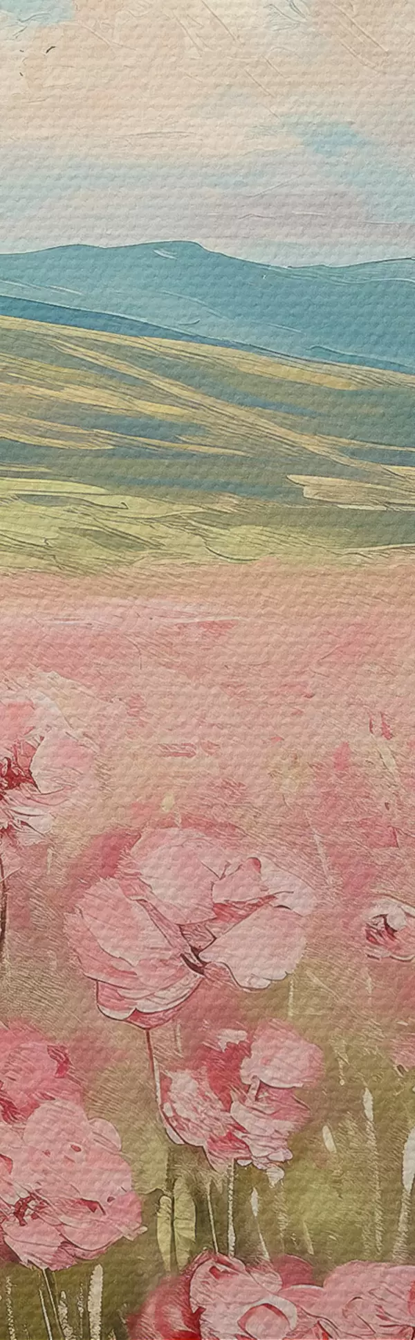 Attēls Pļava ar rozā ziediem, kalni, dabas ainava, zilas debesis ar mākoņiem, akrils Nr r40232