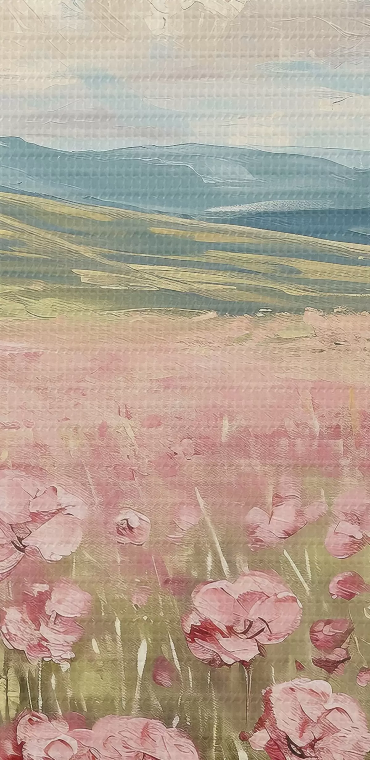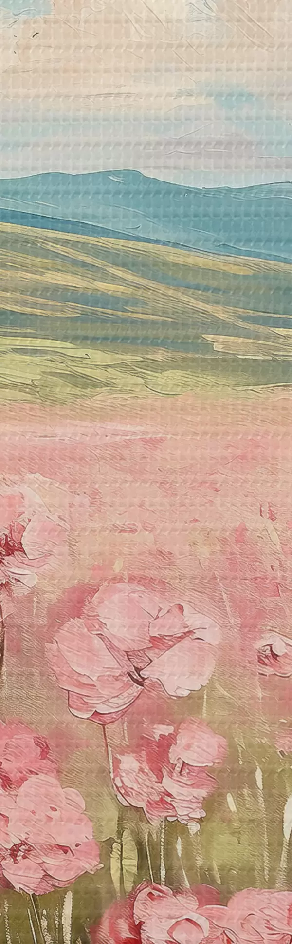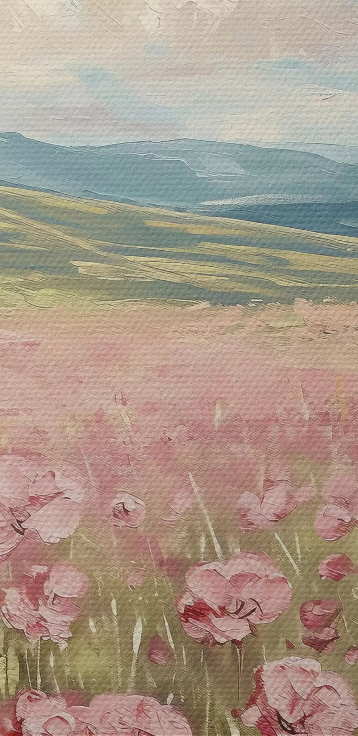 Attēls Pļava ar rozā ziediem, kalni, dabas ainava, zilas debesis ar mākoņiem, akrils Nr r40232