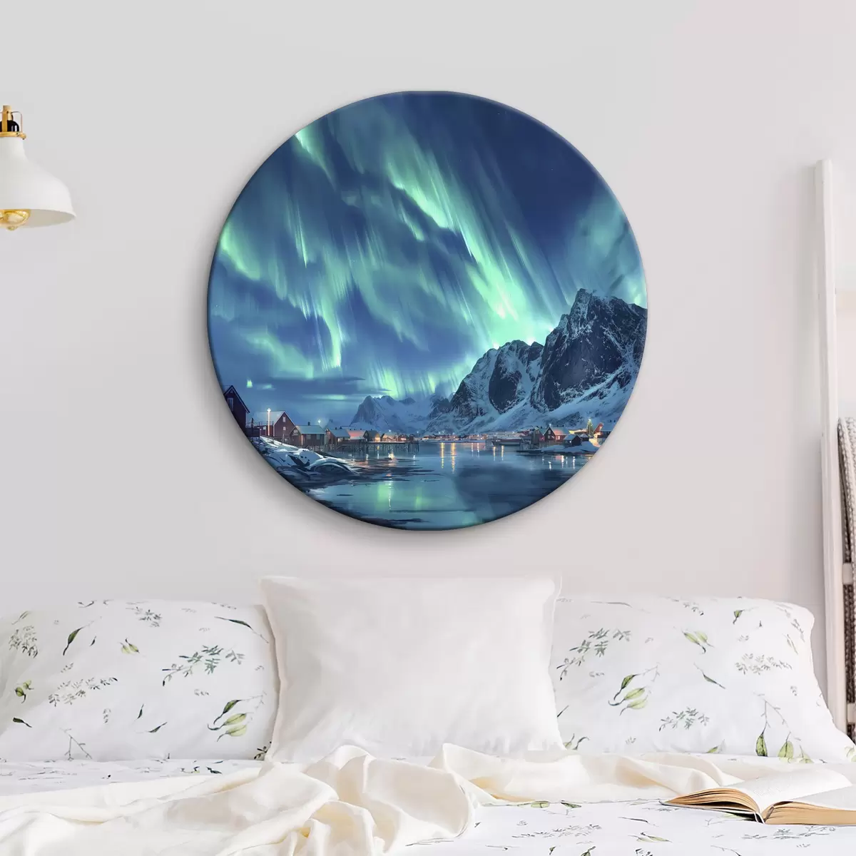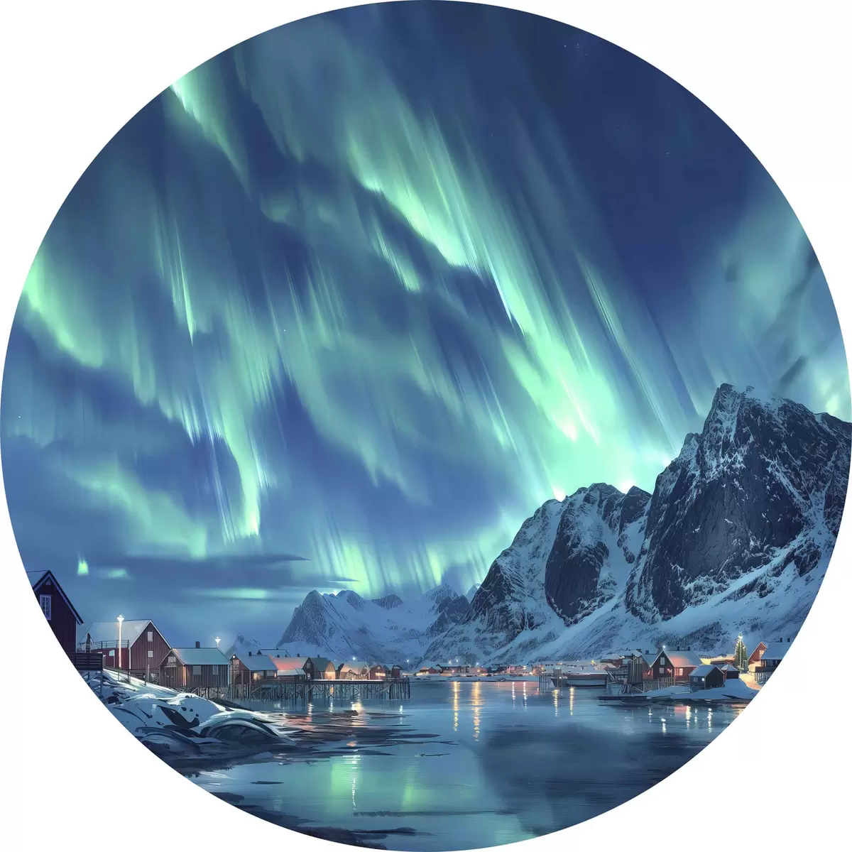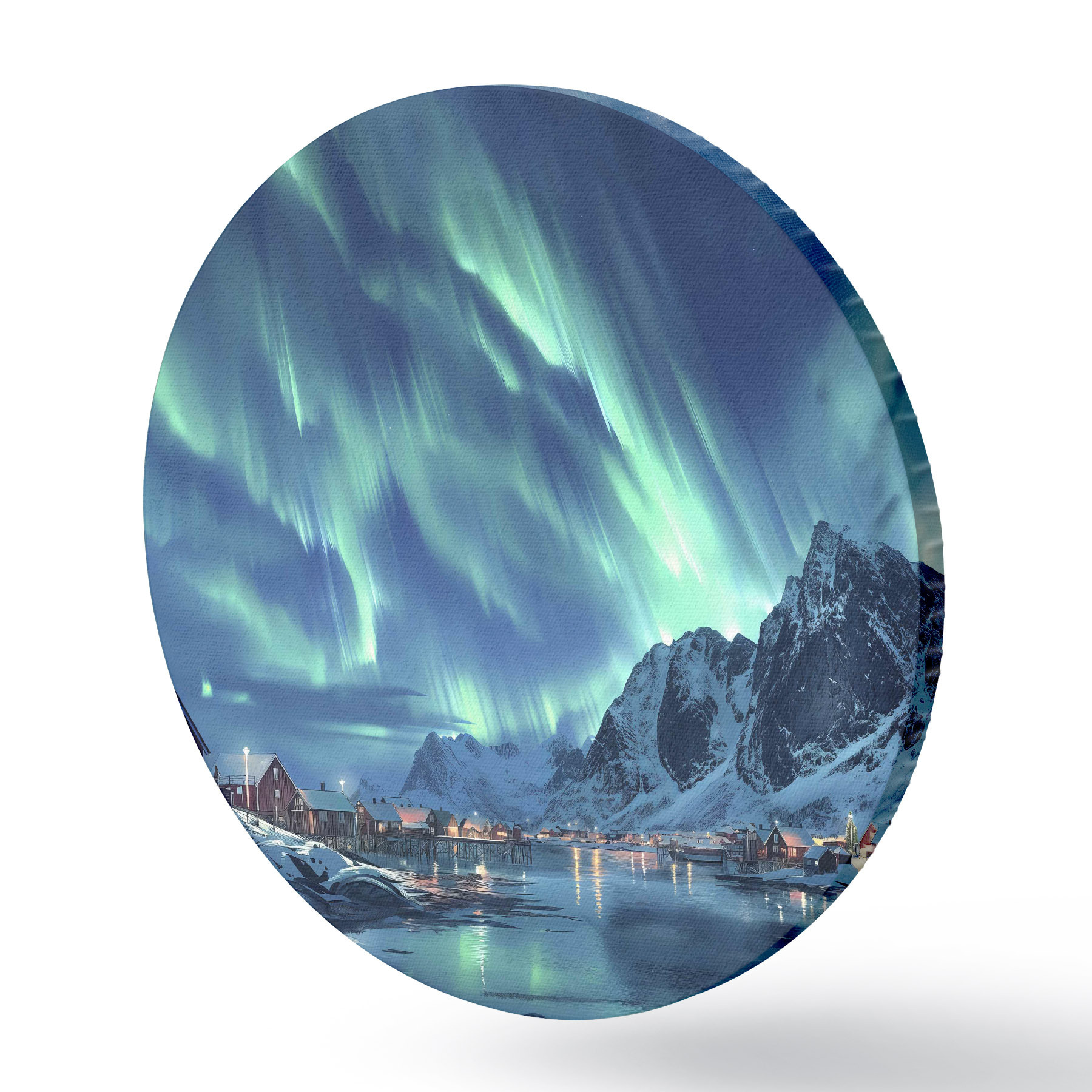 Apaļas gleznas Norvēģija ziemas ciemats, ziemeļblāzma, nakts debesis r40300