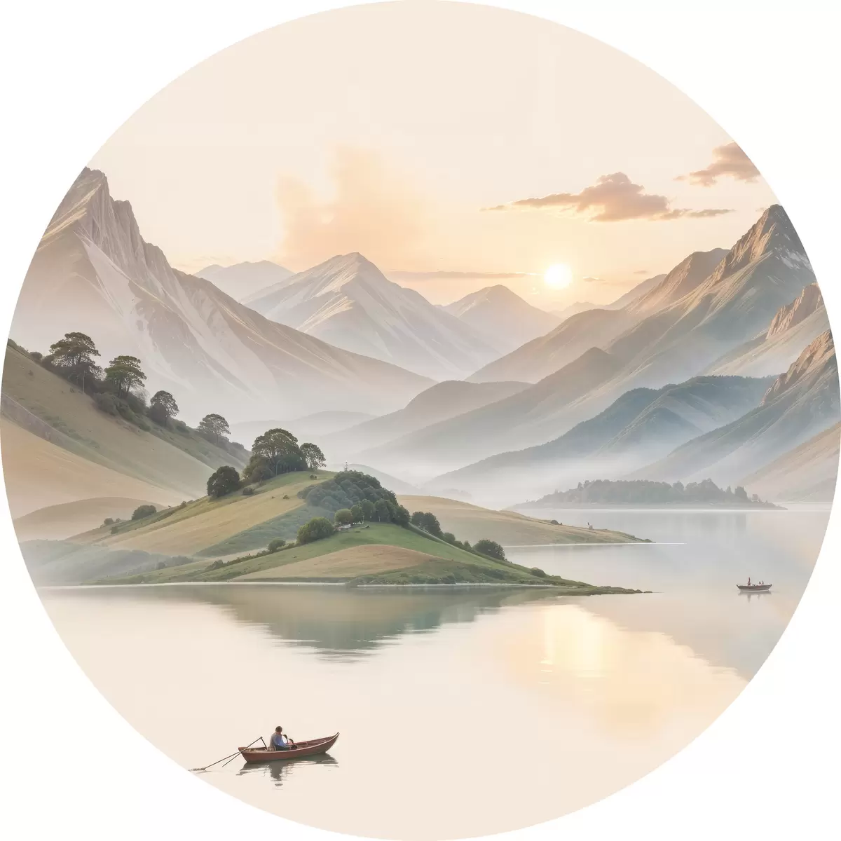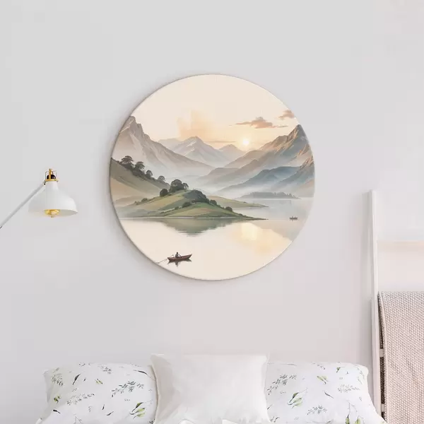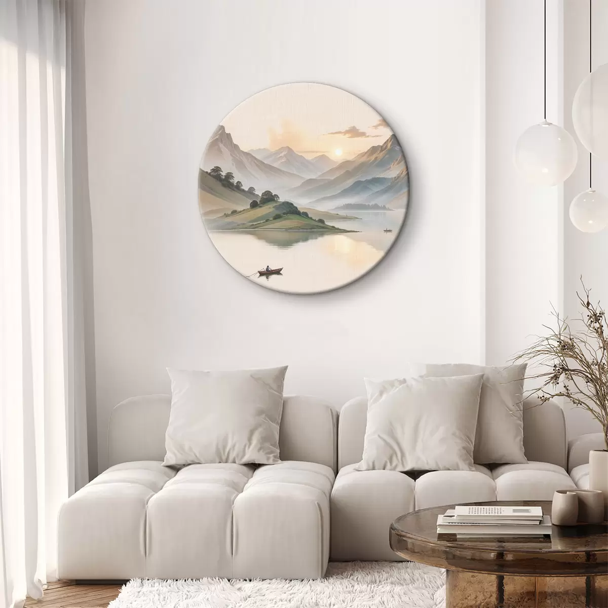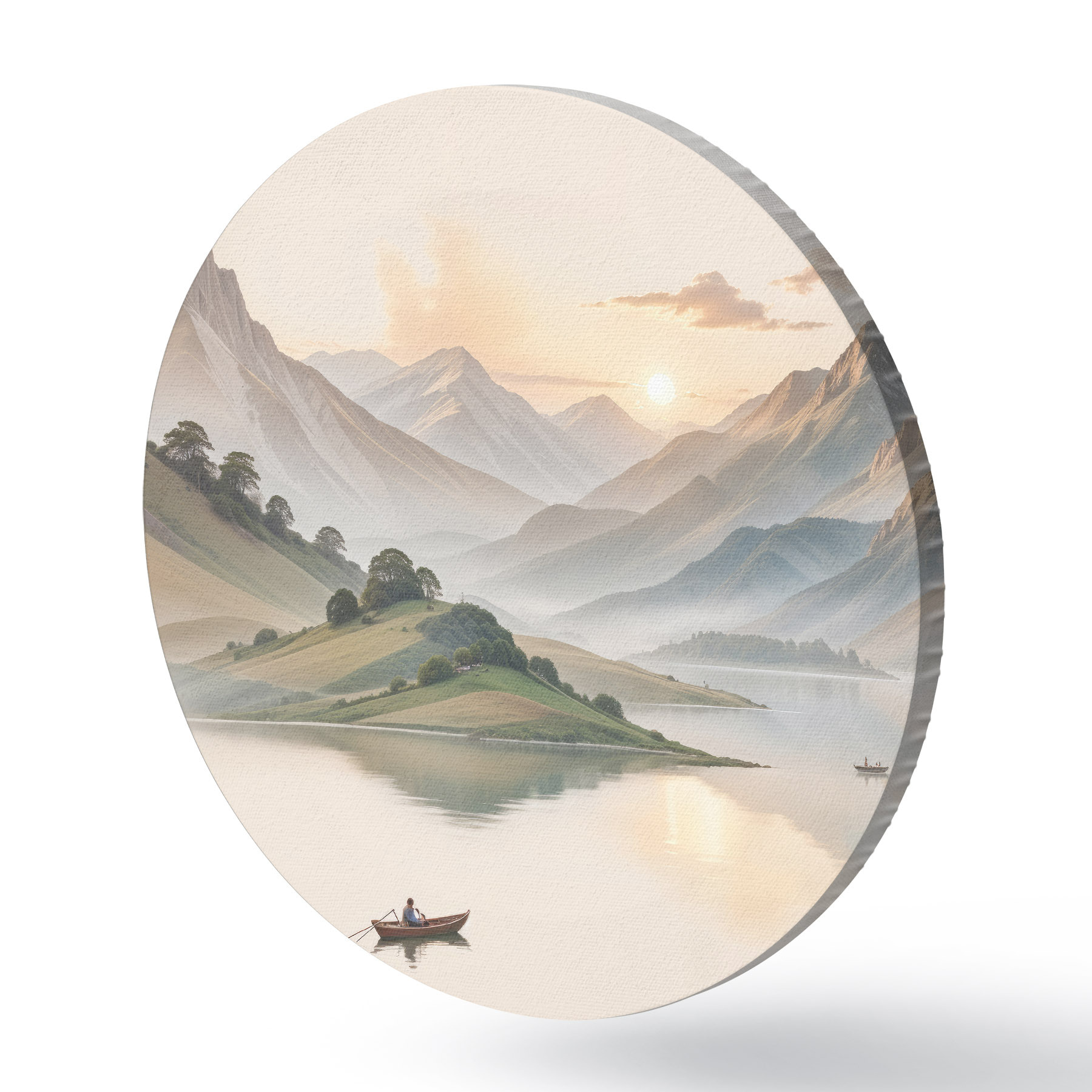 Apaļas gleznas Rāma ainava ar ezeru, kas atspoguļo kalnus fonā ar nelielu laivu rāmā ūdenī r40391
