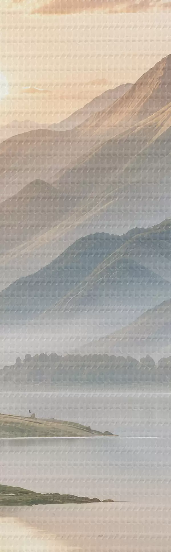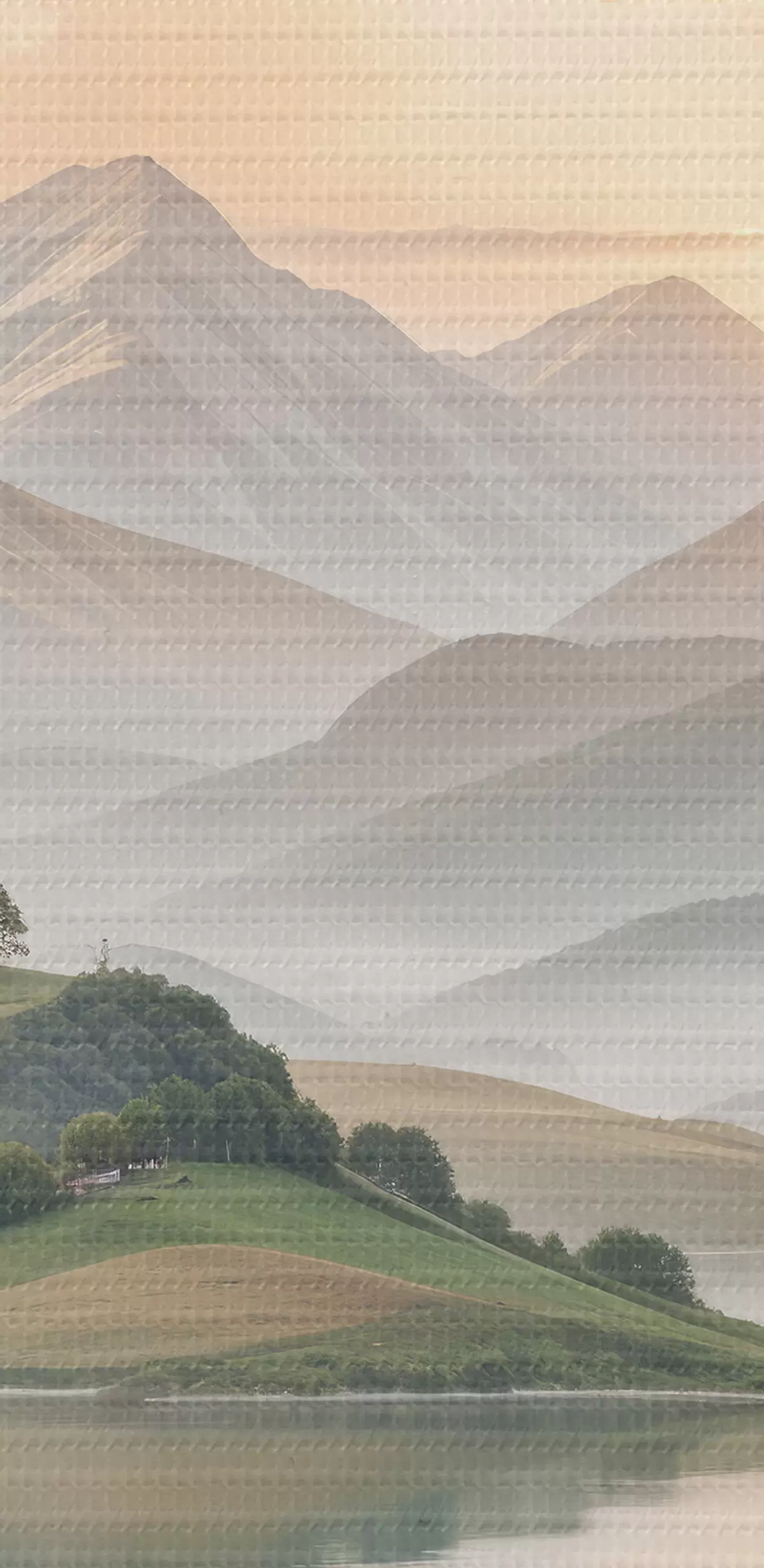 Attēls Rāma ainava ar ezeru, kas atspoguļo kalnus fonā ar nelielu laivu rāmā ūdenī Nr r40391