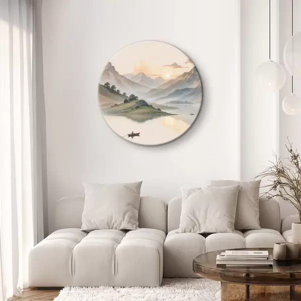 Apaļas gleznas Rāma ainava ar ezeru, kas atspoguļo kalnus fonā ar nelielu laivu rāmā ūdenī r40391